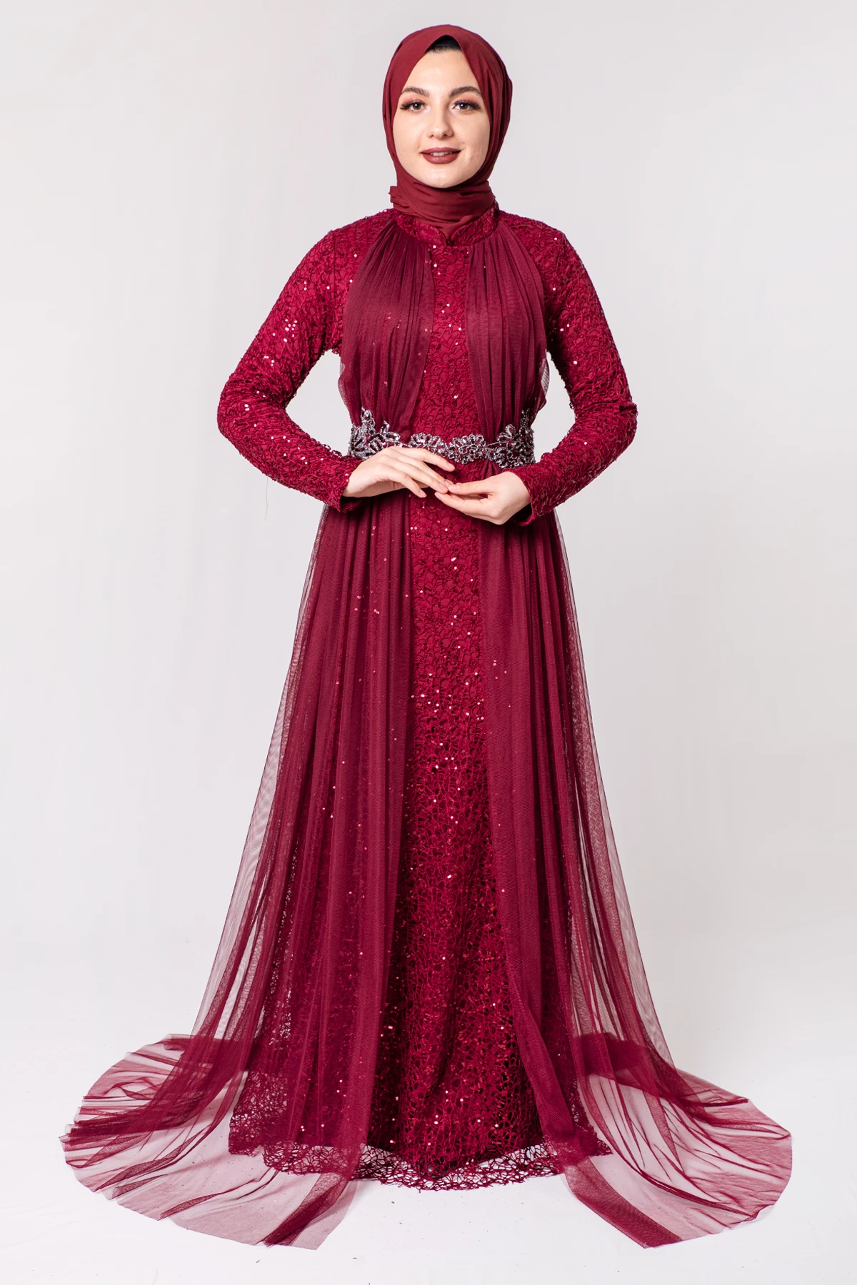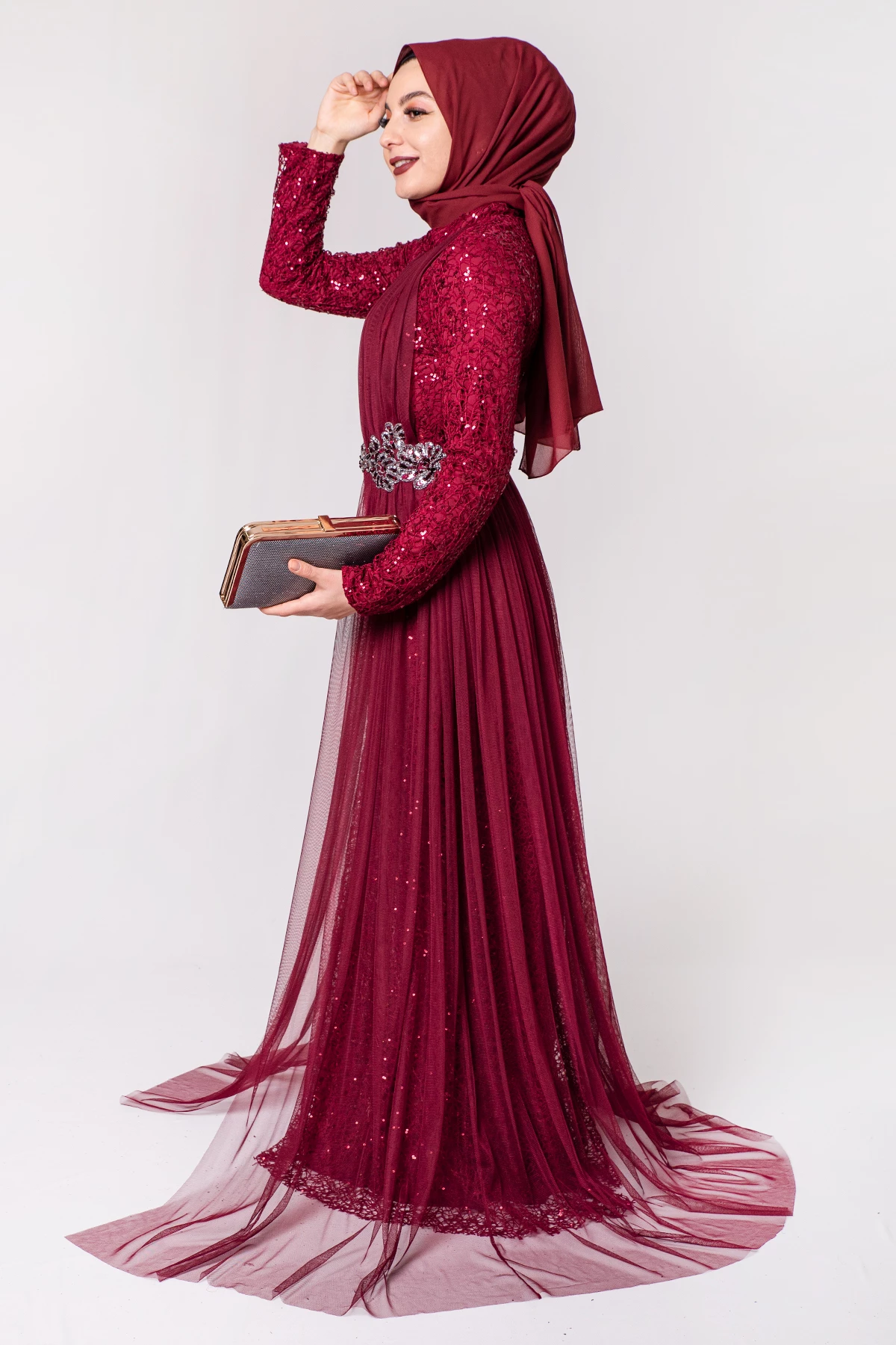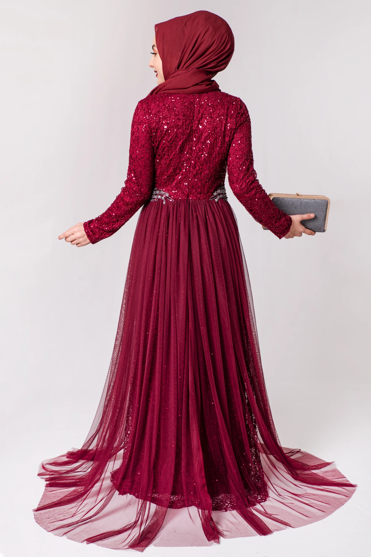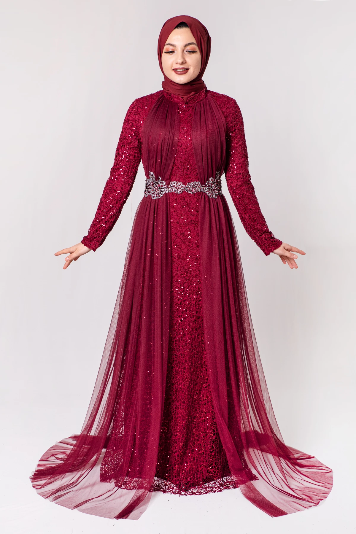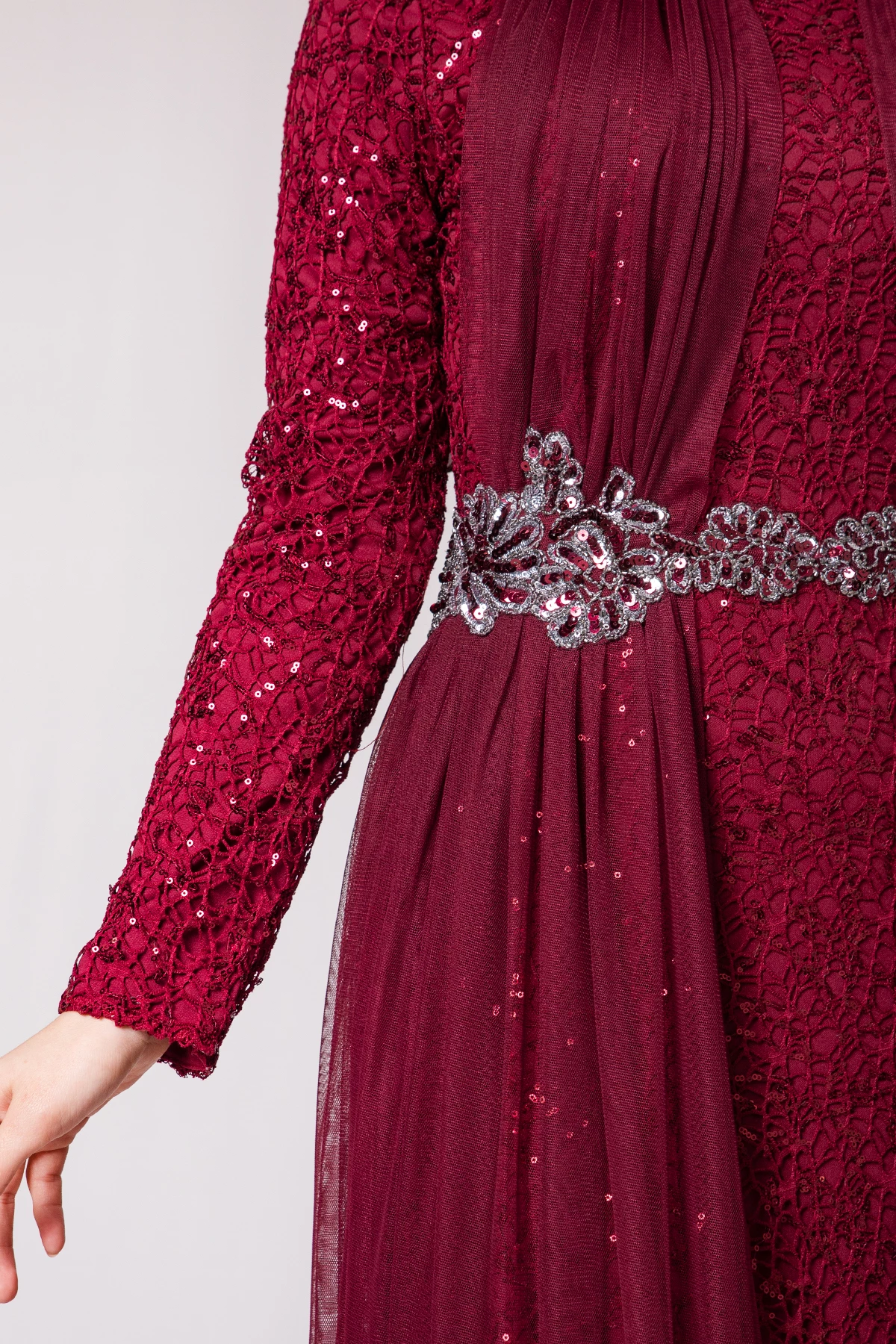 Şifon Detaylı Payetli Tesettür Abiye Bordo PC3466BO 38