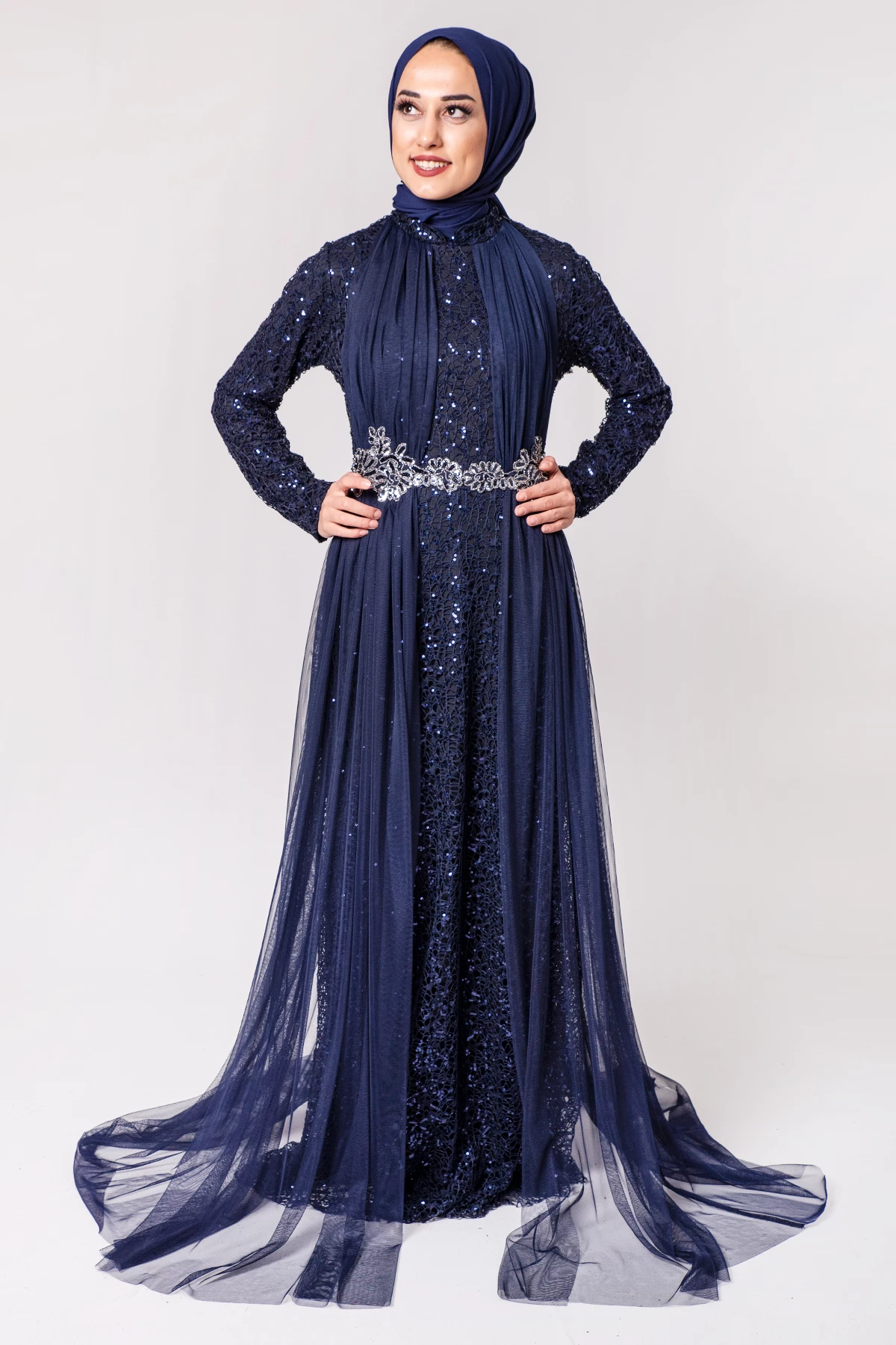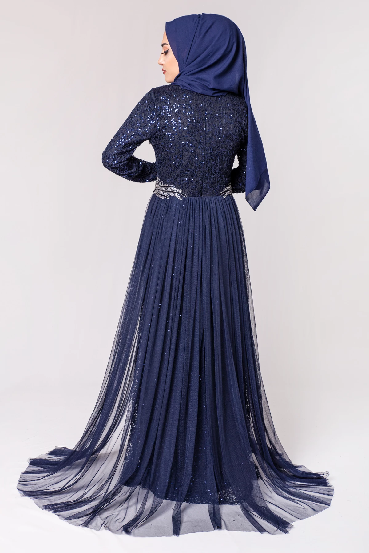 Şifon Detaylı Payetli Tesettür Abiye Lacivert PC3466LC 38