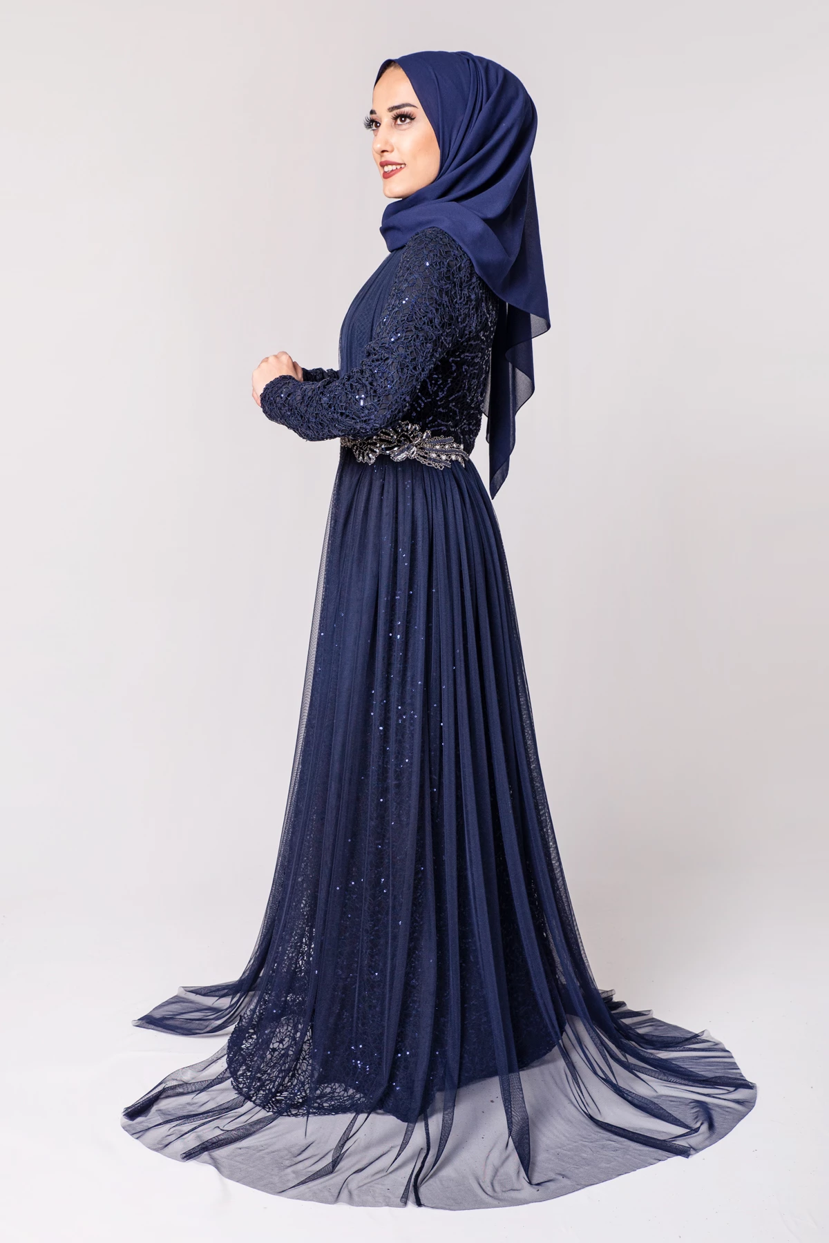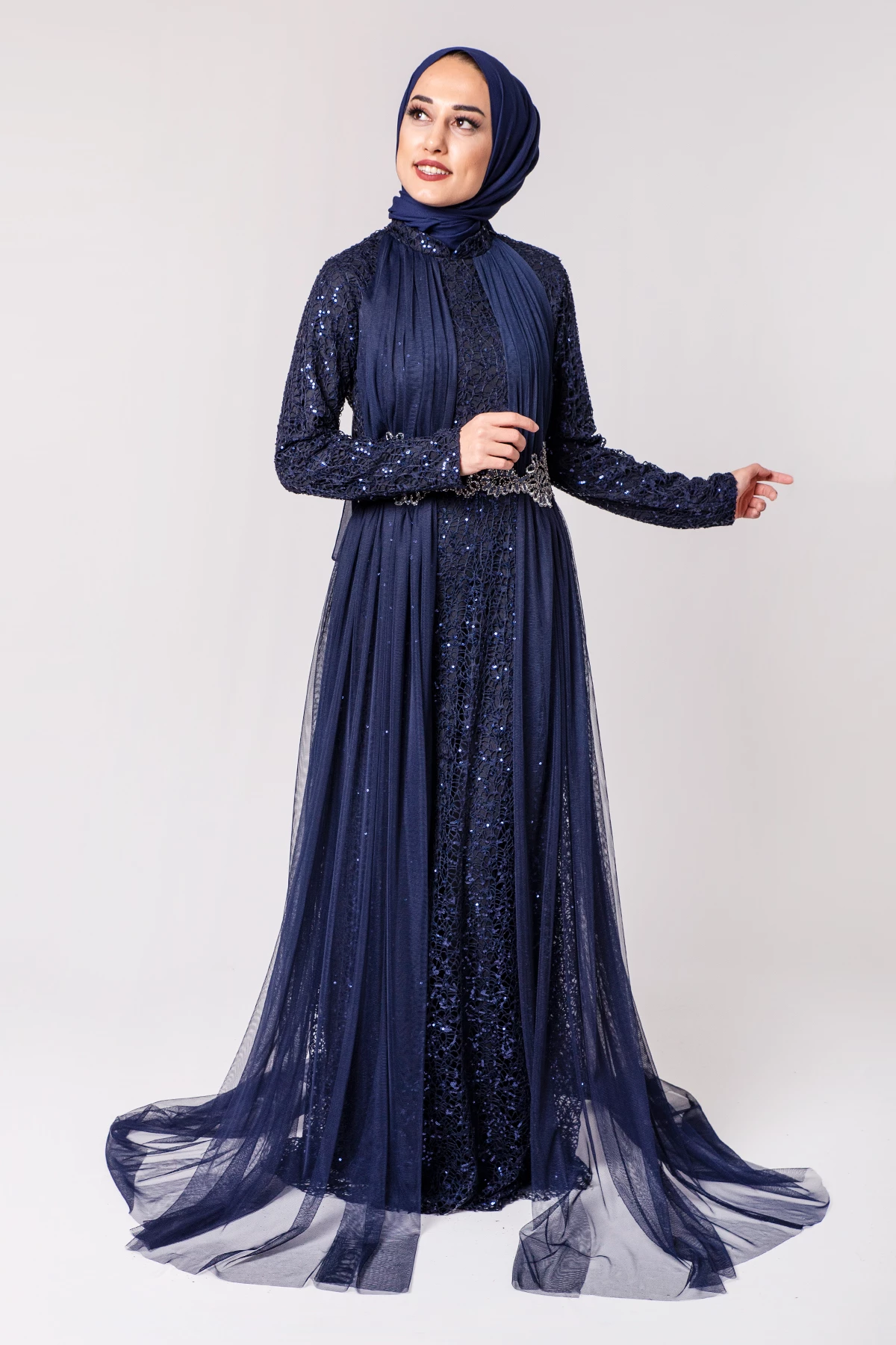 Needion - Şifon Detaylı Payetli Tesettür Abiye Lacivert PC3466LC 38