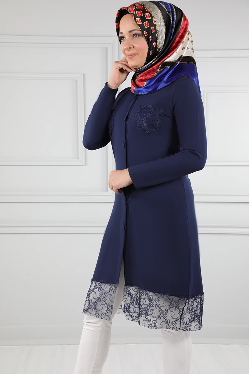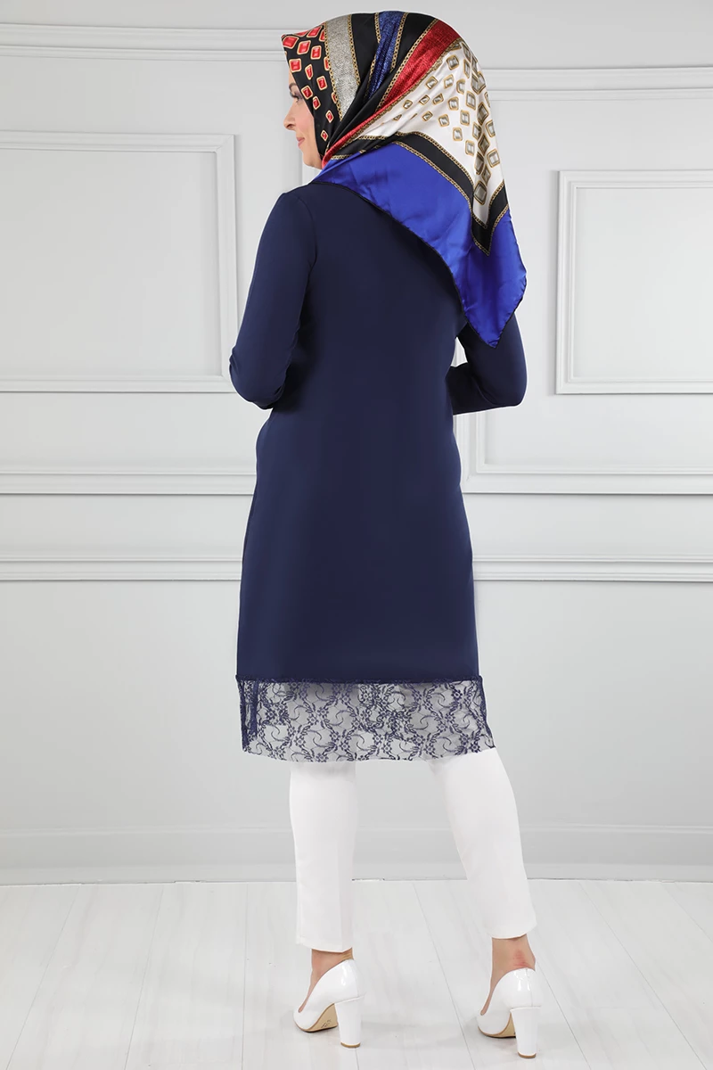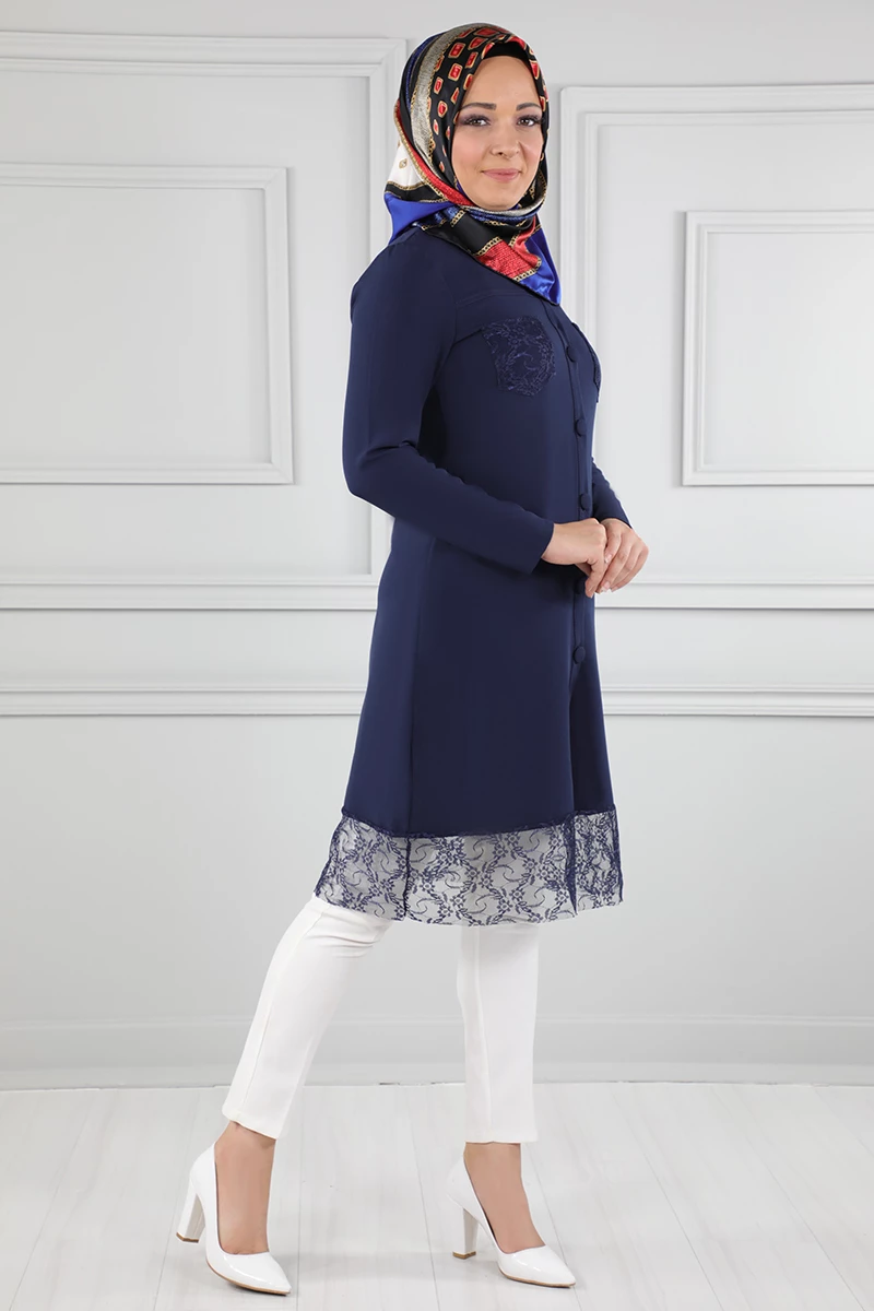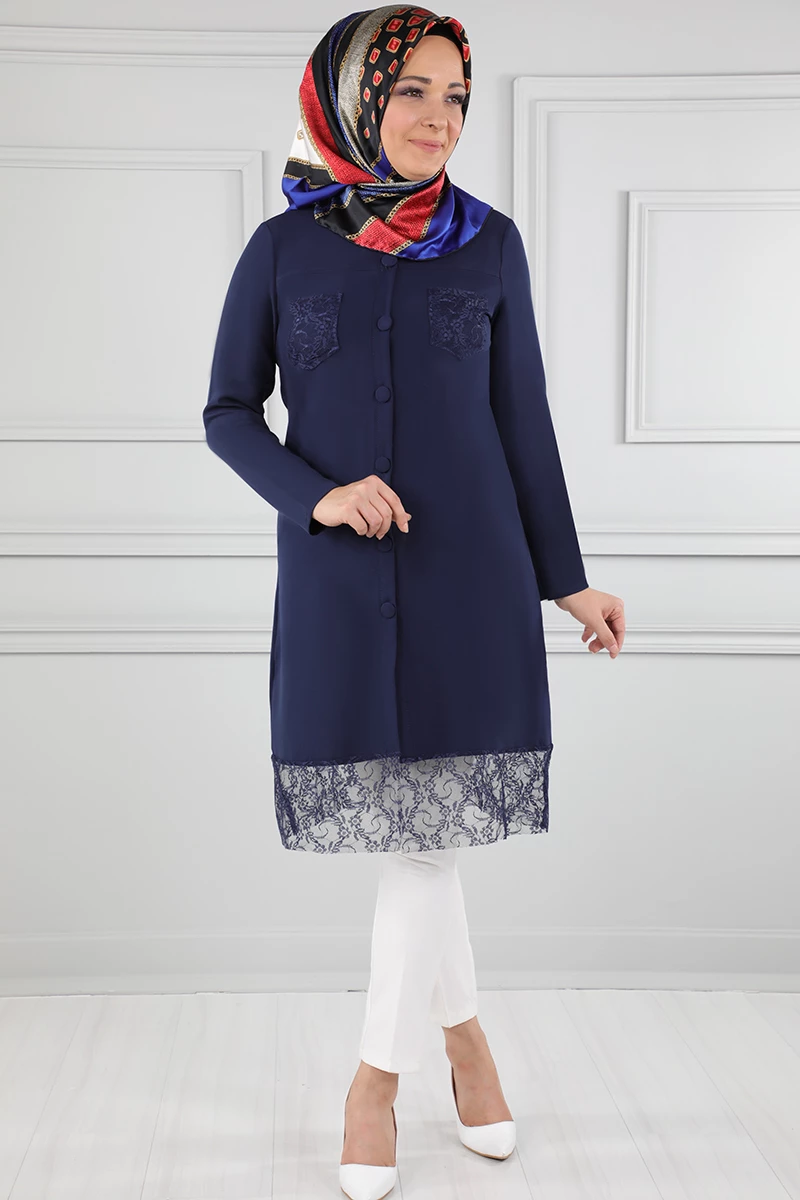 Süs Düğmeli Güpür Detaylı Tesettür Tunik Lacivert 38