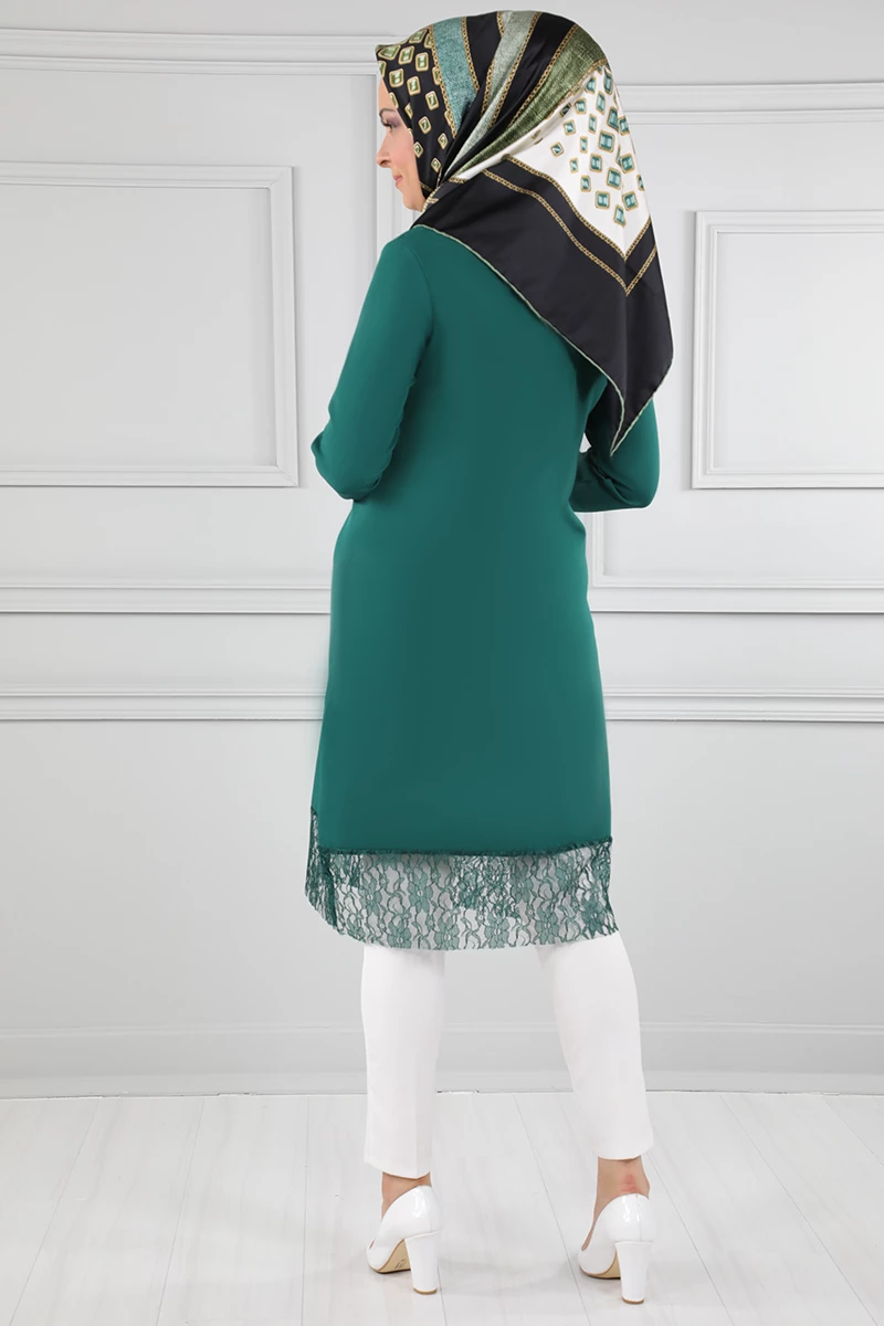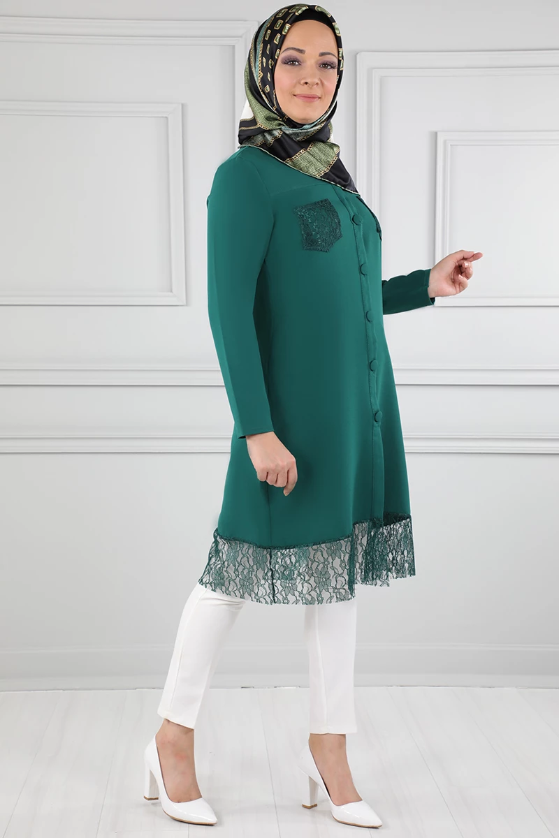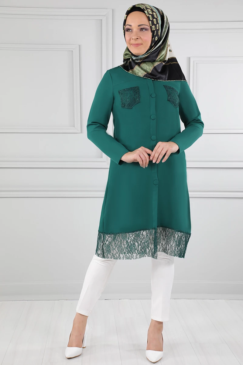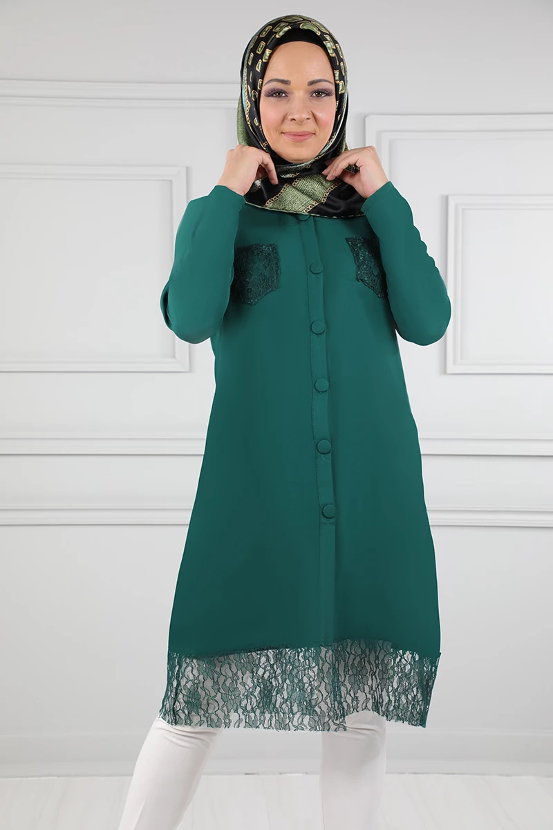 Süs Düğmeli Güpür Detaylı Tesettür Tunik Zümrüt 38