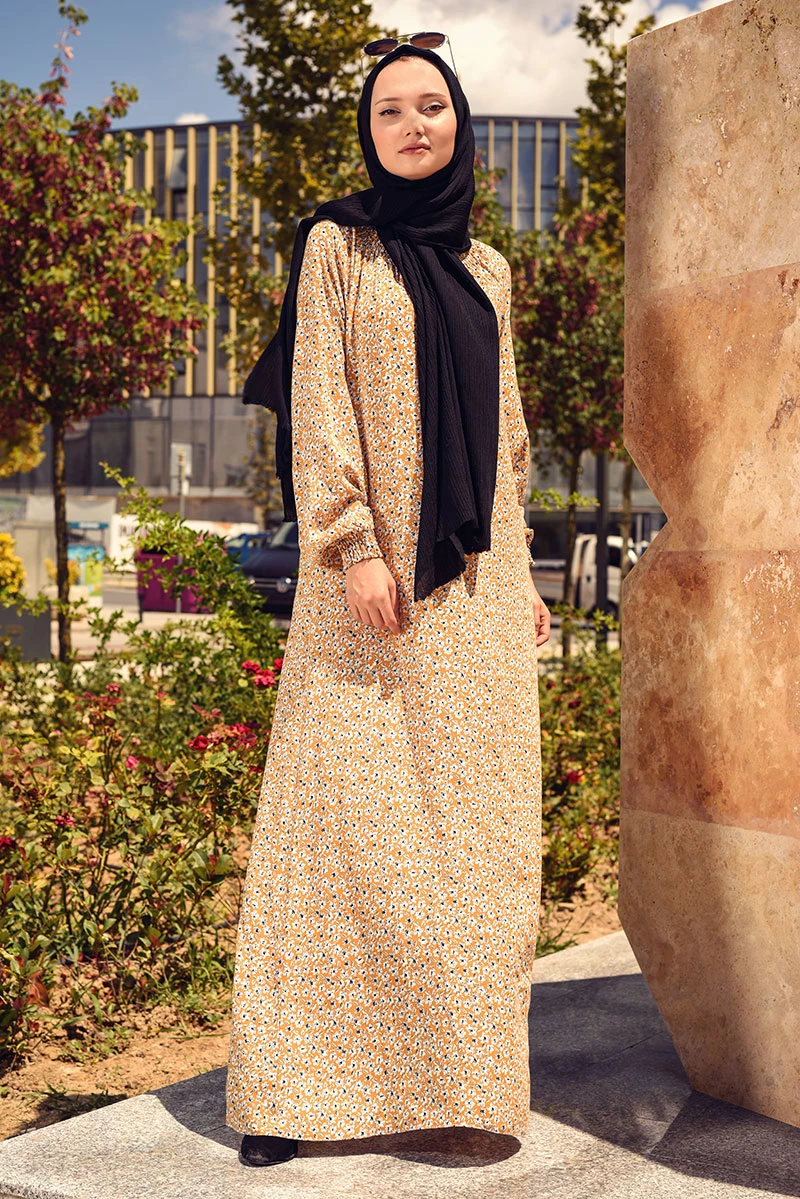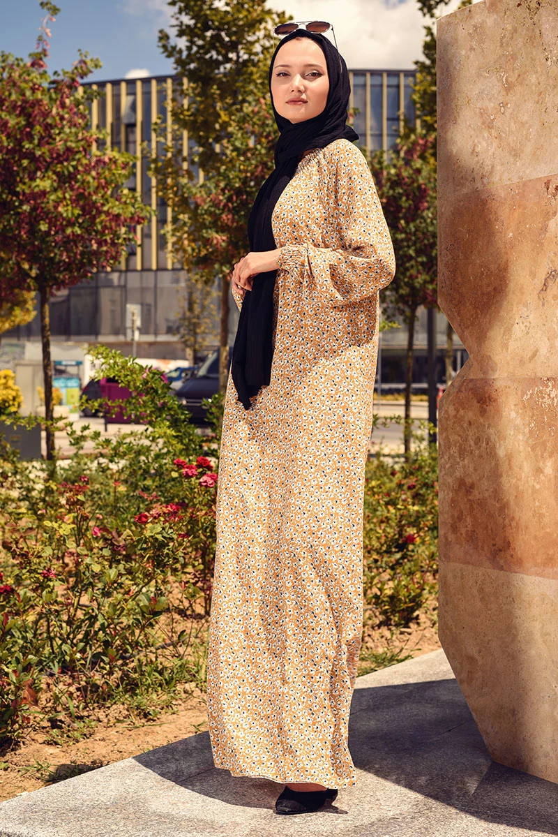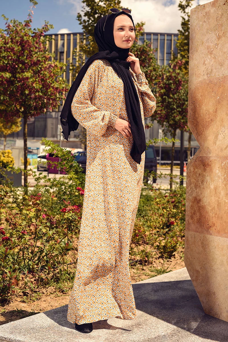 Needion - Viskon Desenli Tesettür Elbise SY8000 SARI 42