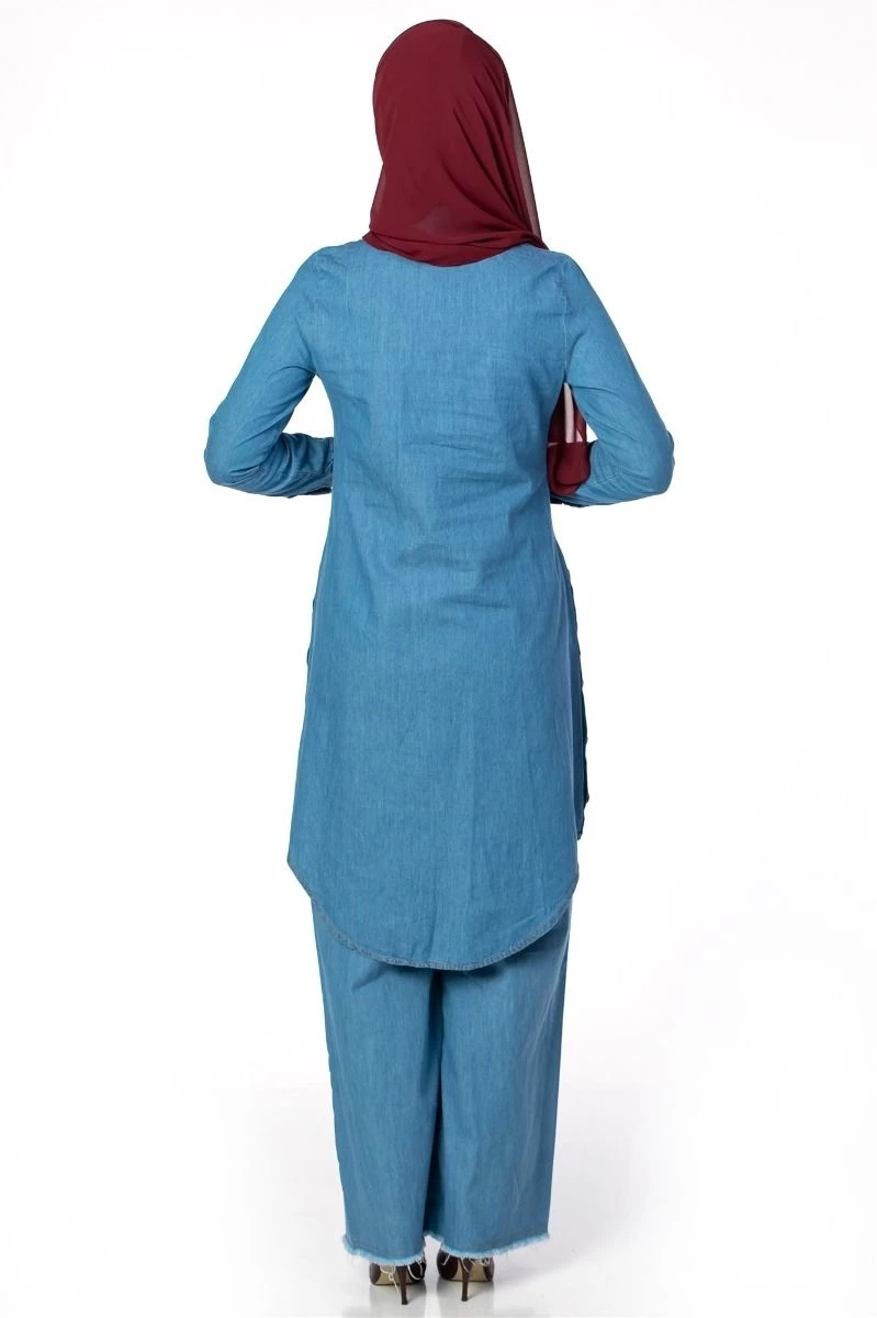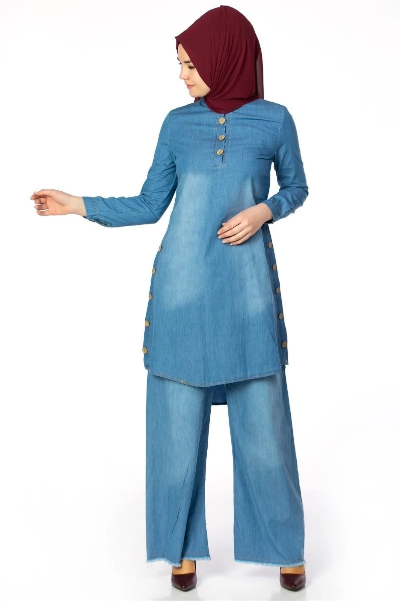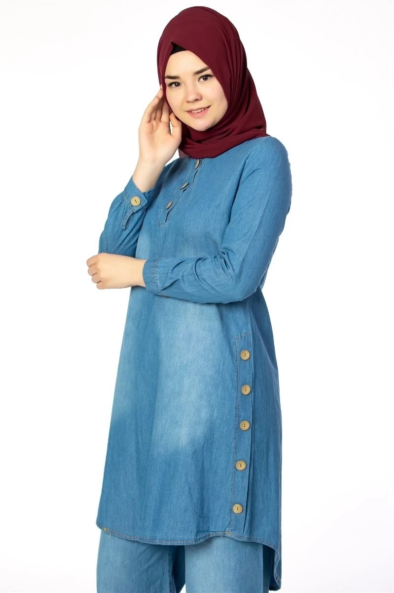 Yanı Düğmeli Tesettür Kot Tunik Mavi 38