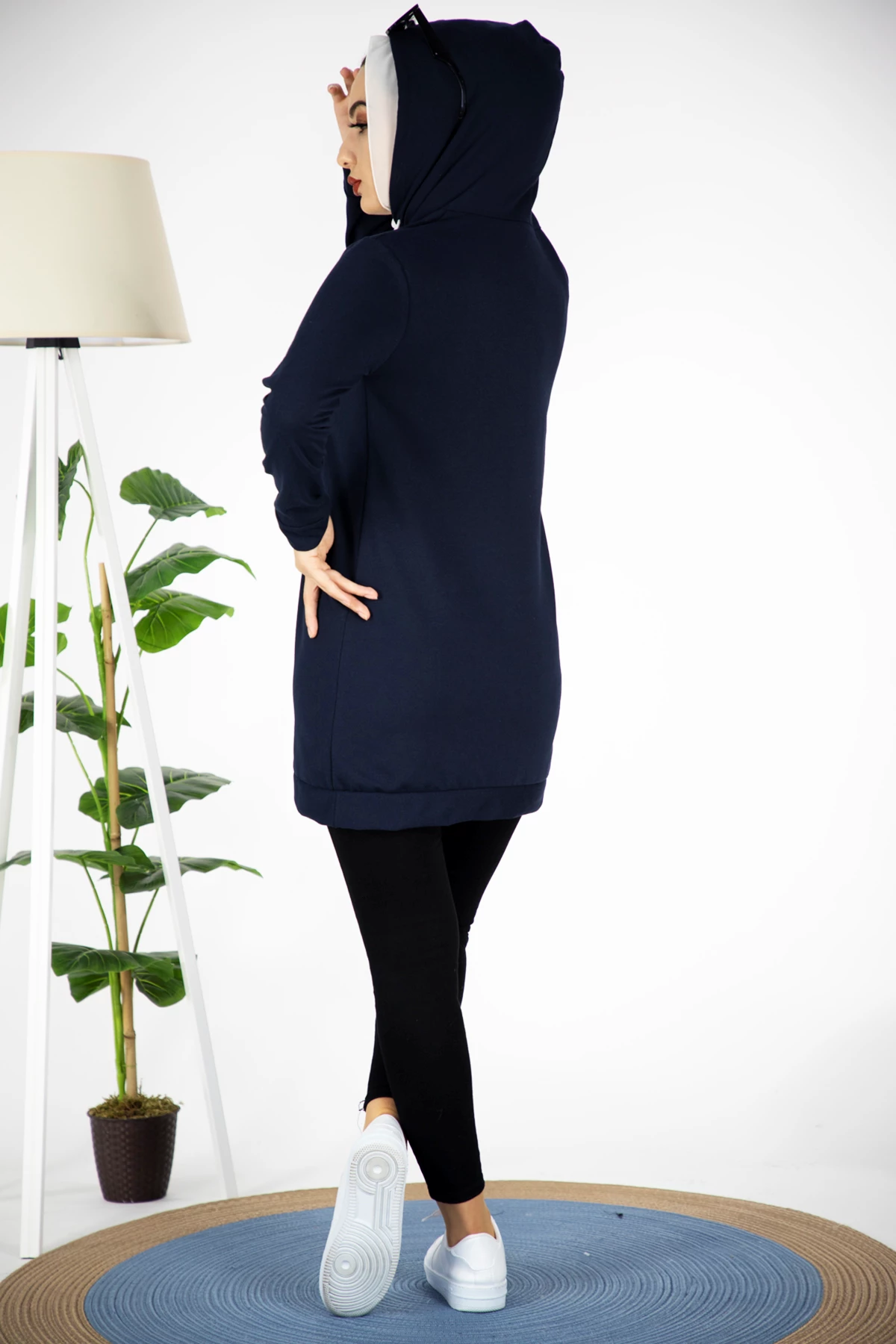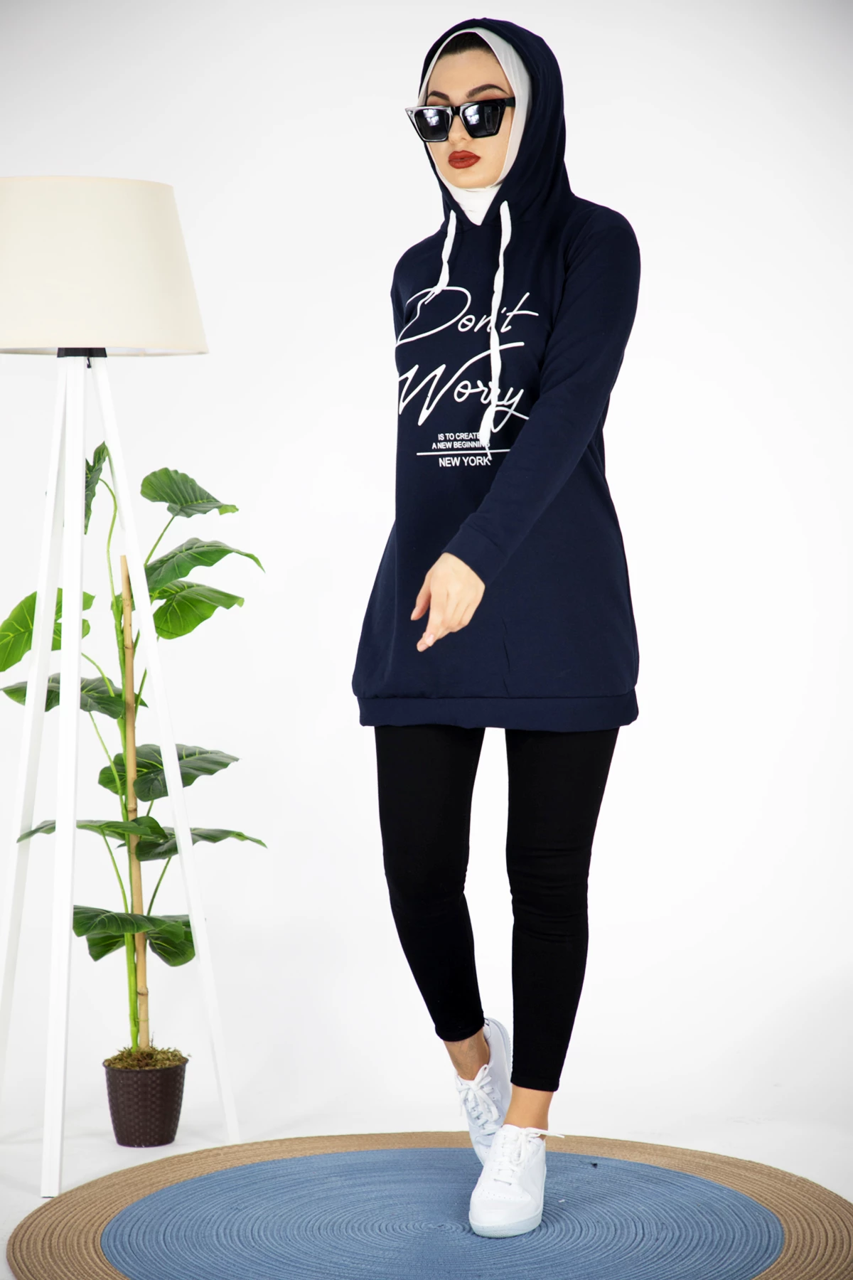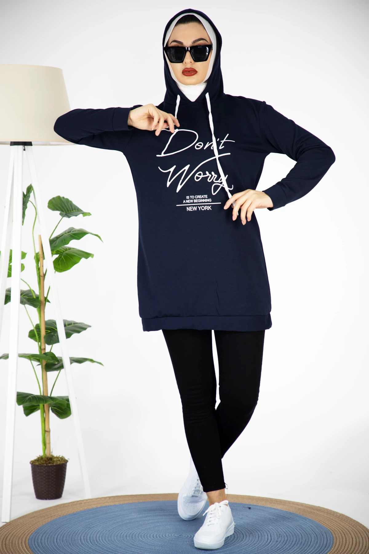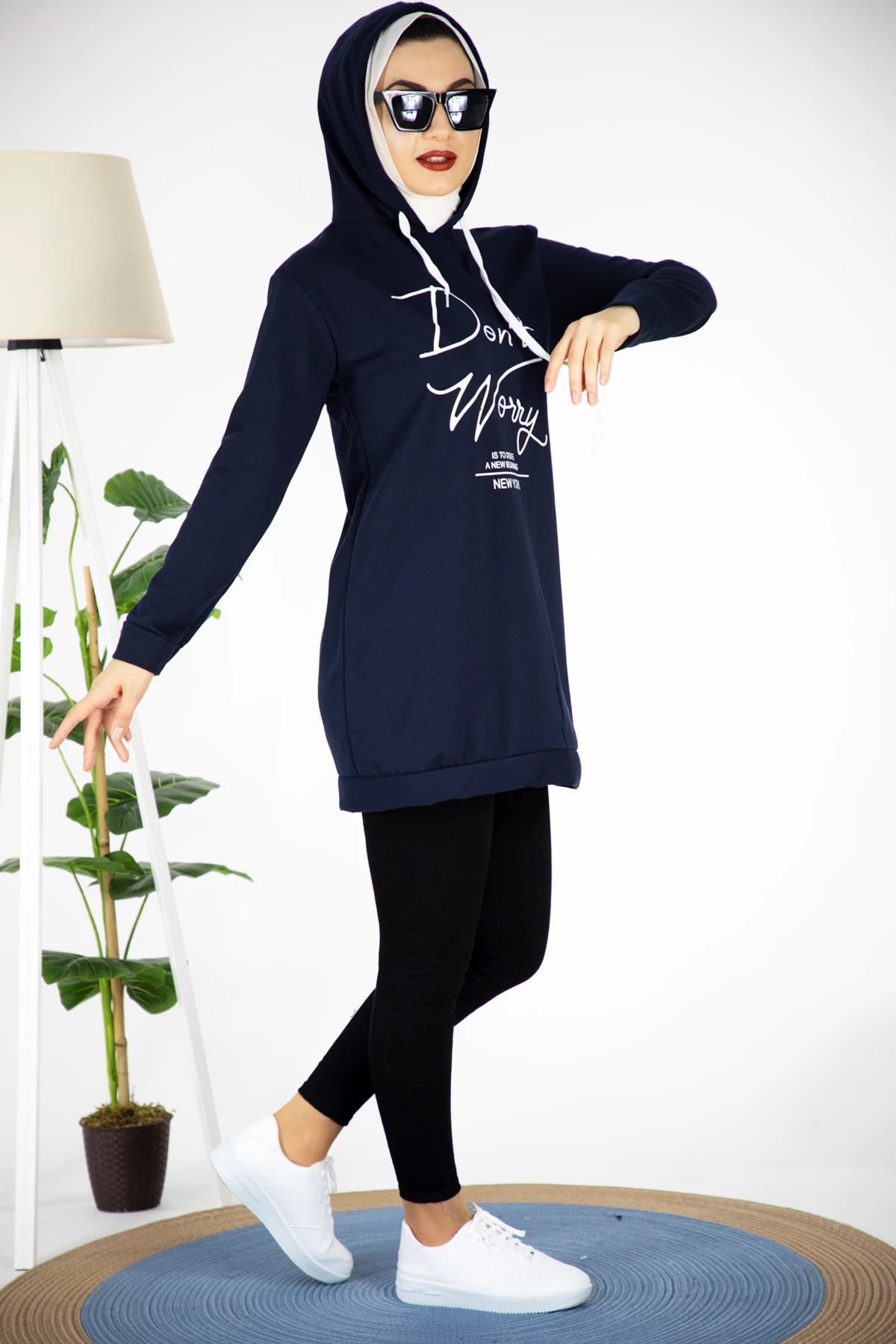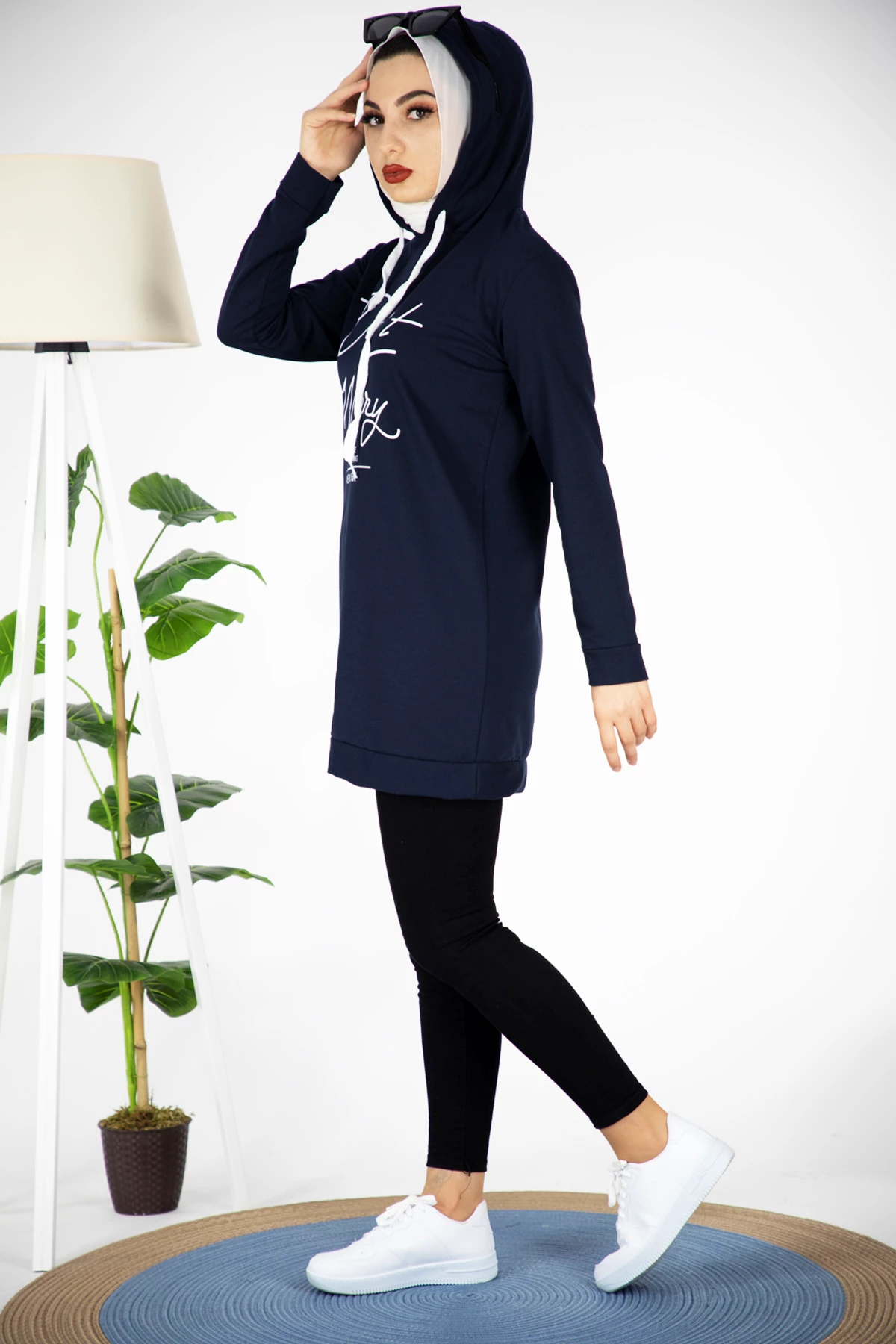 Yazı Baskılı Kapüşonlu Tesettür Tunik Lacivert Lacivert lxl