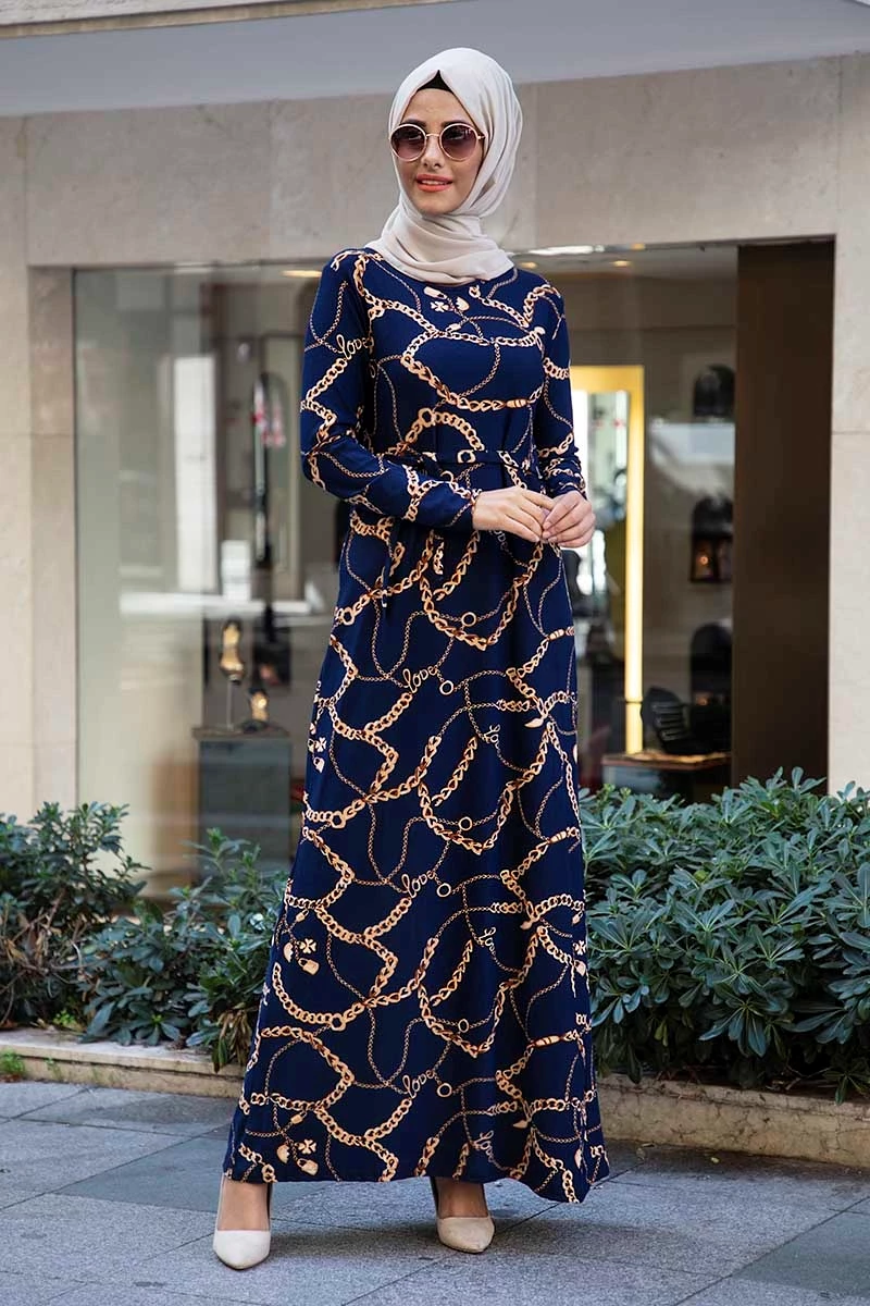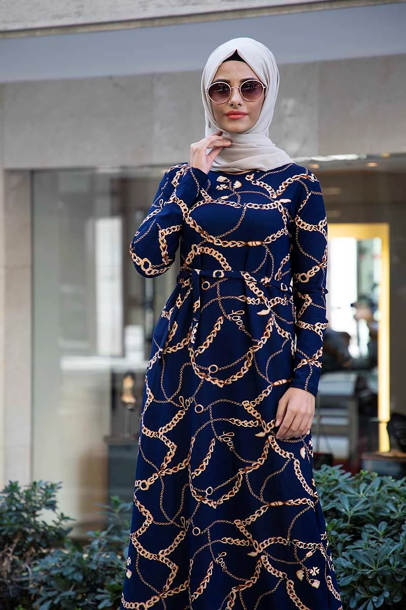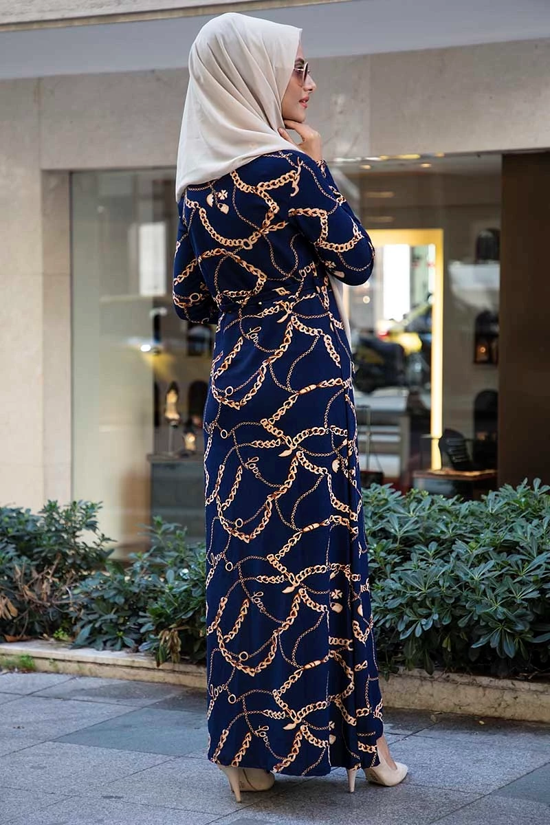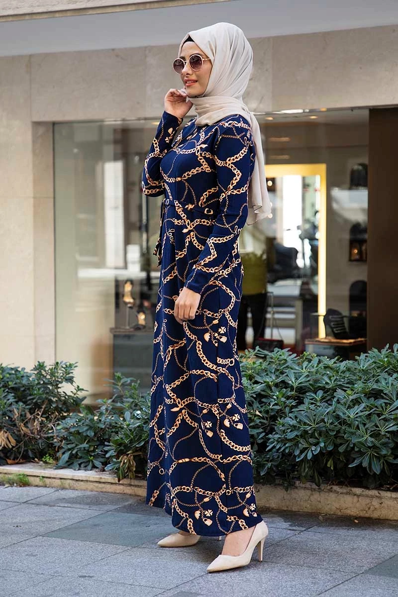 Zincir Desenli Beli Kuşaklı Tesettür Elbise AZ1015 Lacivert 01 L