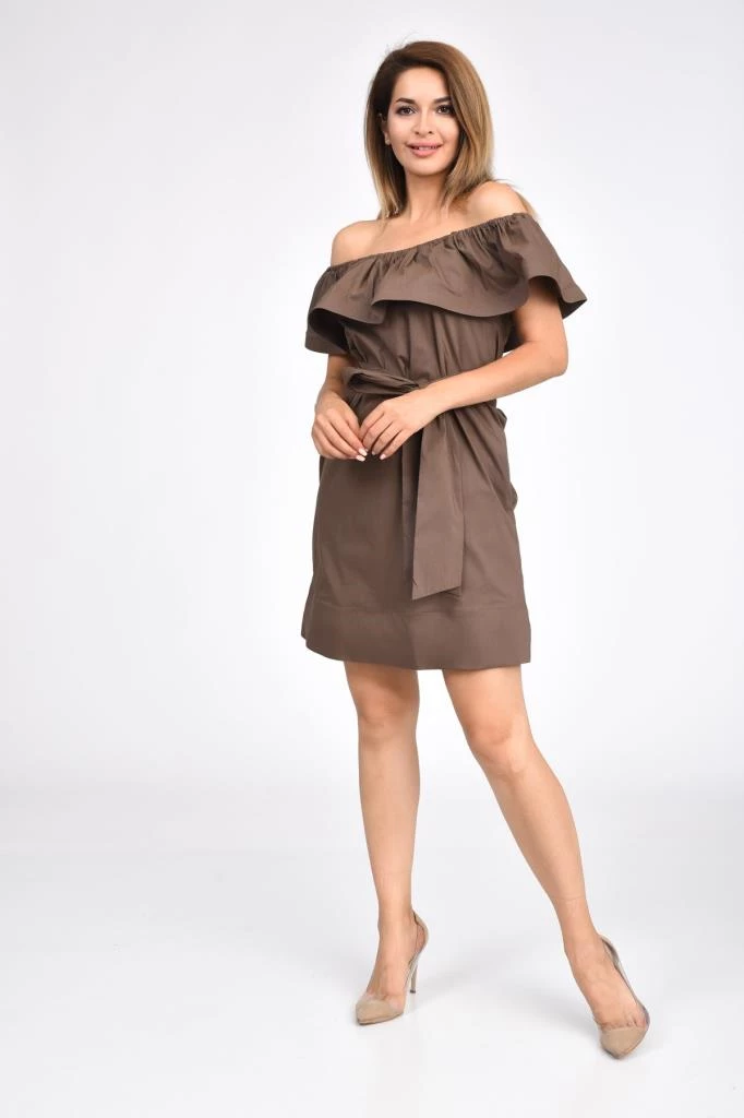 Düşük Omuzlu Volanlı Kahverengi Kadın Elbise Kahverengi 36