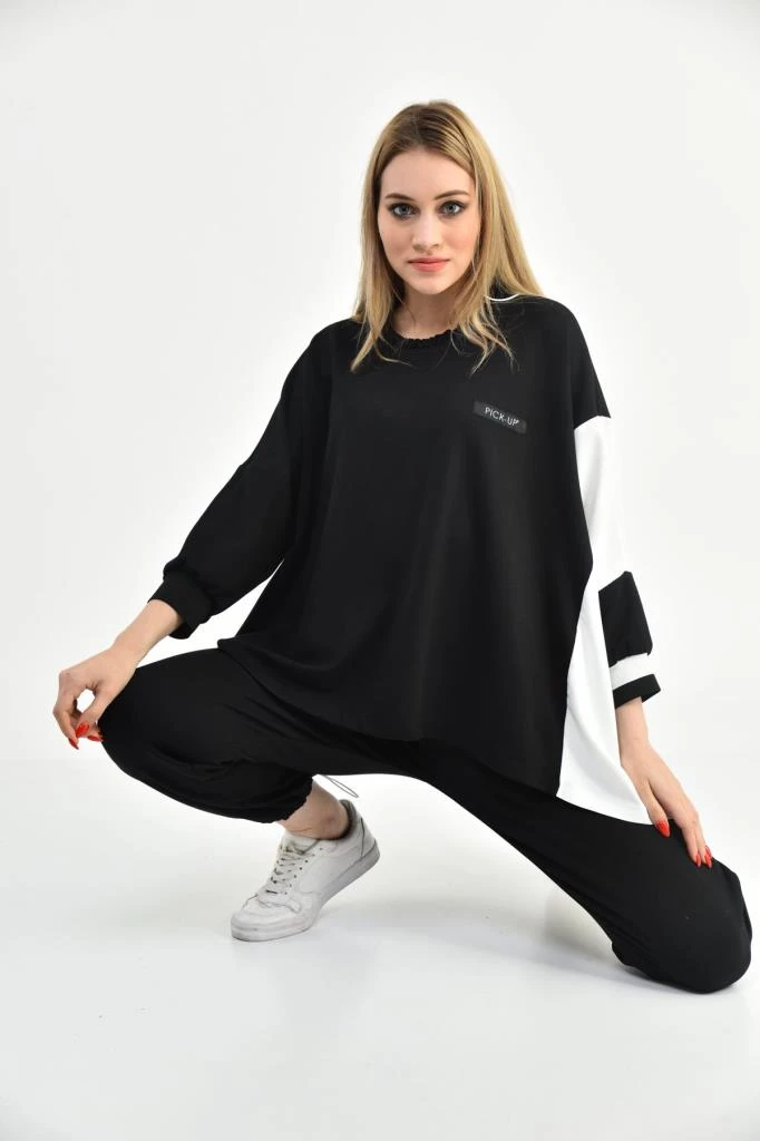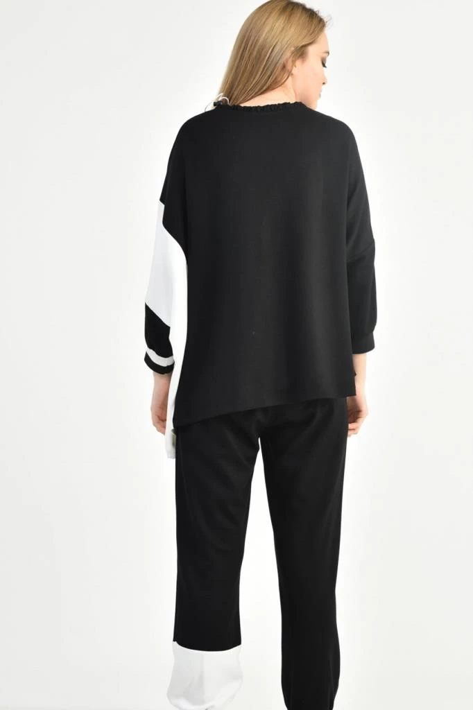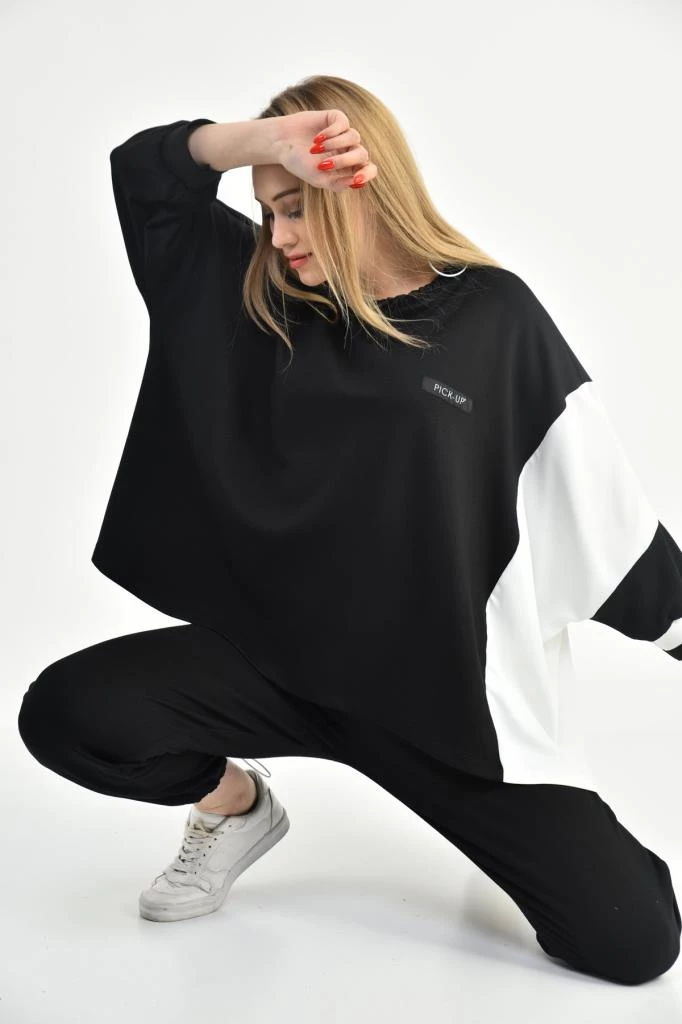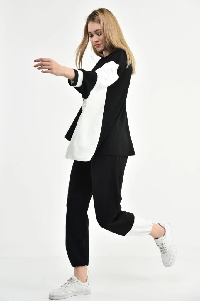 Bisiklet Yaka Siyah Beyaz Yarasa Kol Kadın Eşofman Takım Siyah - Beyaz 44