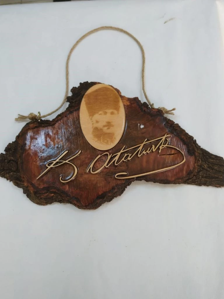 Gazi Mustafa Kemal Atatürk yazılı ve kabartma büstü bulunan kapı süsü tamamen el işçiliğidir.