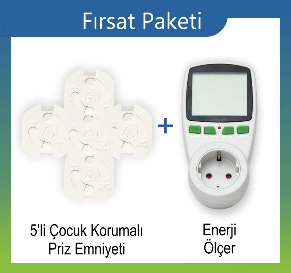 Fırsat Paketimiz, 5'li Çocuk Korumalı Priz Emniyeti ve Enerji Ölçer'den oluşmaktadır. Bulunduğumuz ortamlarda, açıkta duran prizler her zaman birer tehlike yaratmaktadırlar. Çocuk Korumalı Priz Emniyeti, özellikle de çocukların emniyet kilidi olmayan prizlere ulaşmasını engellemek için tasarlanmıştır. • Prize takılı fişi çektikten sonra herhangi bir cisim sokulmasına karşı otomatik olarak kapanan mekanizmaya sahiptir. • Arkasında yer alan yapışkanlı bant sayesinde, ürün priz içerisine tam olarak yerleştirilebilmektedir. • Yapışkanlı bant sayesinde emniyet, priz içerisine yerleştirildikten sonra çocuklarınız tarafından çıkartılamaz. • Polikarbon malzemeden üretilen ürün, sağlam, sert ve yüksek ısıya dayanaklıdır. Enerji Ölçer, kendisine bağlı olan cihazın güç sarfiyatını ve harcanan elektriğin maliyetini belirlemeye yarayan bir denetleme ve test aracıdır. Tüm elektrikli aletler ve prizlere uyumlu olarak kullanılabilen Enerji Ölçer, gereksiz enerji tüketimlerinizi kısarak sizlere tasarruf sağlamanın yolunu açacaktır. Bu ürün sayesinde fazla elektrik tüketen ürünlerinizi tespit edebilir ve bu tüketimi düşürmeye yönelik çalışmalar yapabilir. Tek Tıkla Tasarruf adresimizden alacağınız Enerji Ölçer ile ister kilovat, ister TL olarak elektrik tüketimlerini hesap edebilir ve bu tüketimi düşürmeye yönelik çalışmalar yapabilirsiniz. Ürününüzü kullanmaya başlamadan önce güvenlik uyarıları ve kullanım talimatlarını dikkatlice okumanızı tavsiye ederiz. Ürünler teknik özellikleri ve kullanımları hakkında detaylı bilgi almak için https://www.tektiklatasarruf.com/urun/firsat-paketi adresini ziyaret edebilirsiniz.