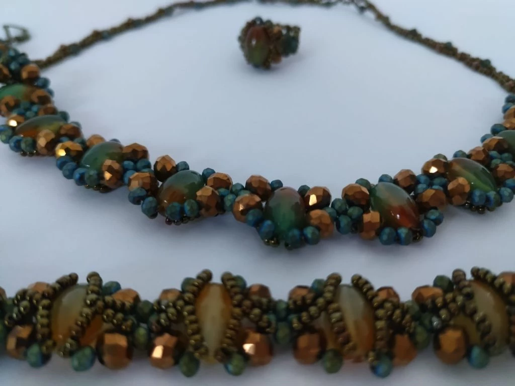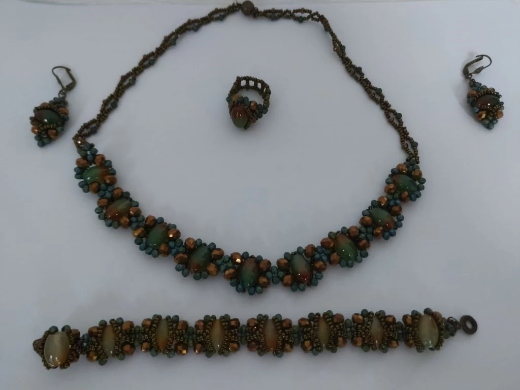 Yeşil rengi ağırlıklı olarak kullanılan takımız tamamen el işçiliğidir. Doğal taş, kristal ve kum boncukları malzemeleri kullanılmıştır. Takı setimiz kolye, yüzük, bileklik ve küpeden oluşmaktadır. Günlük ve özel günlerinizde şık ve rahat bir şekilde tüm kıyafetlerinizle kombinleyebilirsiniz.