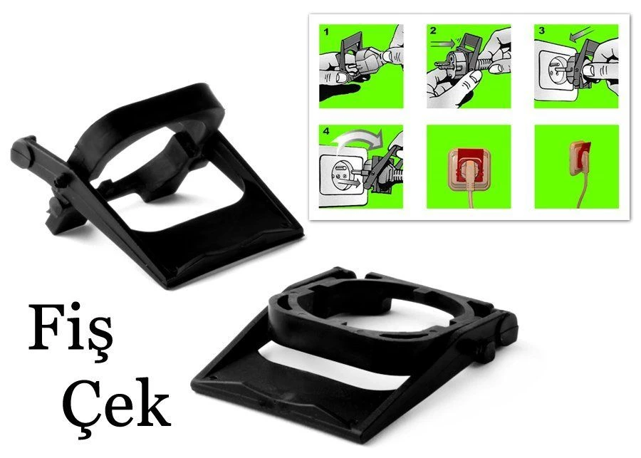 Günlük hayatınızı kolaylaştırmak için Fiş Çek (2 Adet). Sökük prizler her zaman problem oluşturmuştur. Duvarınızın görüntüsü bozulduğu gibi kullanım sırasındada tehlike ( Elektrik çarpması, kontak, yangın vb. ) yaratmaktadır. FİŞ-ÇEK bu sorunlarını kökten çözer. FİŞ-ÇEK Çocuk dostudur. Onlar için gerçekten tehlike olabilecek prizlerin, yerlerinden çıkmasını ve onlara zarar vermesini önler. Fişinizin, prize zarar vermeden ve güç harcamadan kolayca çıkmasını sağlar. Orijinal Fişler içindir. Renk : Siyah - Beyaz Kullanım Şekli : FİŞ ÇEK ’ i bir elinizle, fişi diğer elinizle tutun. Fişin kanallarını, FİŞ ÇEK ’ teki karşılıklarına hizalayıp takın. Fişi prize takın ve elektrikli araç gereçlerini kullanın. Fişi çıkartırken FİŞ ÇEK ’ teki kaldıracı kendinize doğru çekerek, güvenli bir şekilde prizinizi sökmeden ve tehlike yaratmadan çıkartın. FİŞ ÇEK ’ inizi sürekli fiş üstünde bırakınız. Ölçüler : Uzunluk : 6 cm Genişlik : 5 cm Paket İçeriği : 2 Adet Fiş Çek