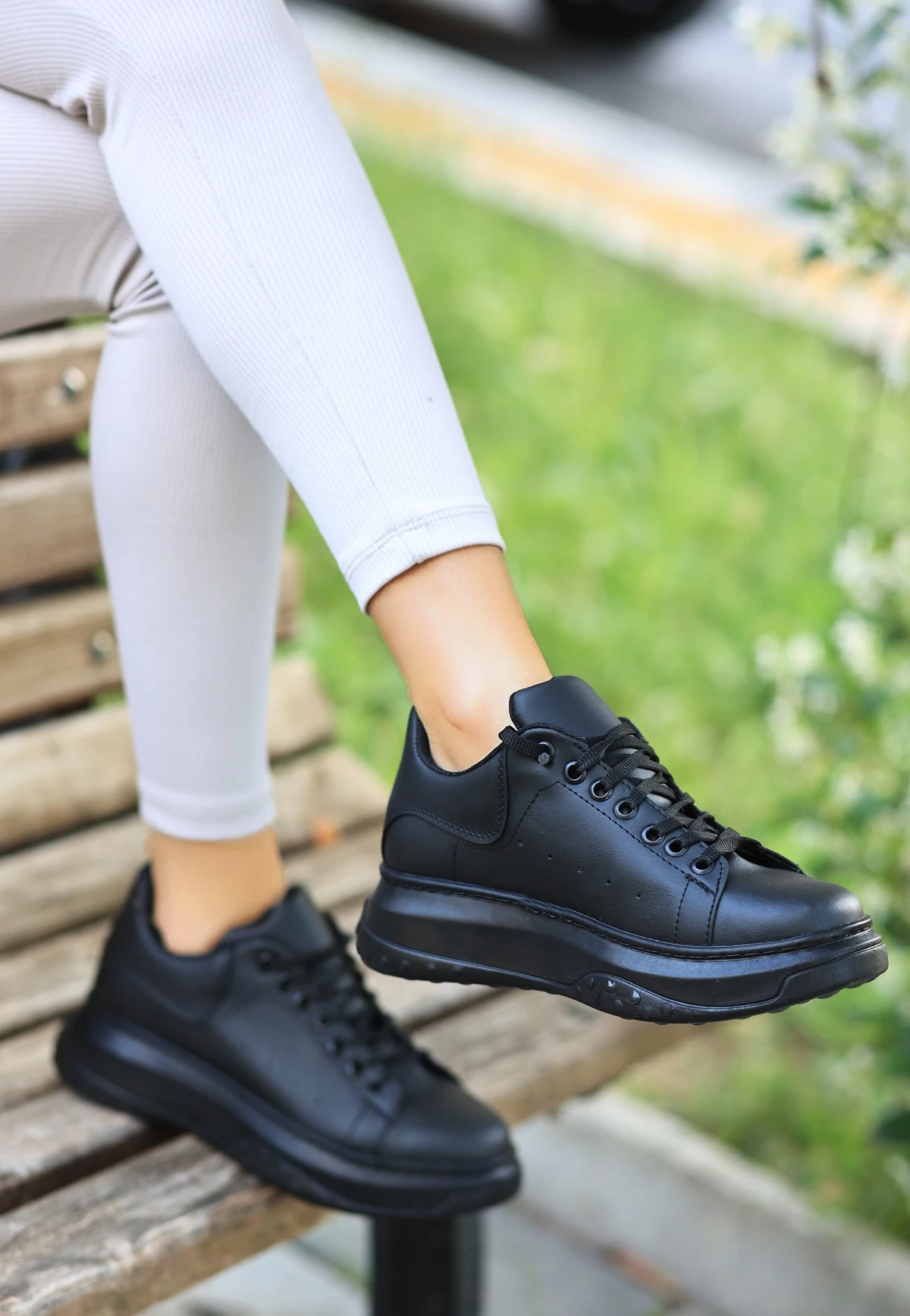 Needion - Ento Siyah Cilt Siyah Tabanlı Bağcıklı Spor Ayakkabı 36