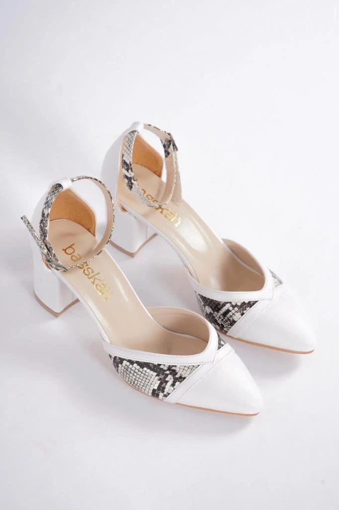 Bayan Beyaz Yılan Derisi Detaylı Alçak Topuk Bilekten Bağlamalı Ayakkabı BEYAZ 36