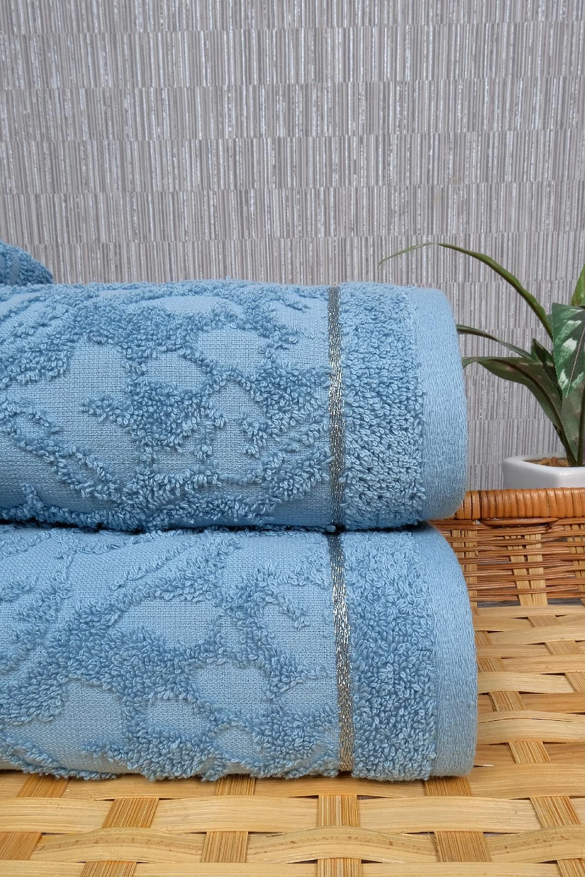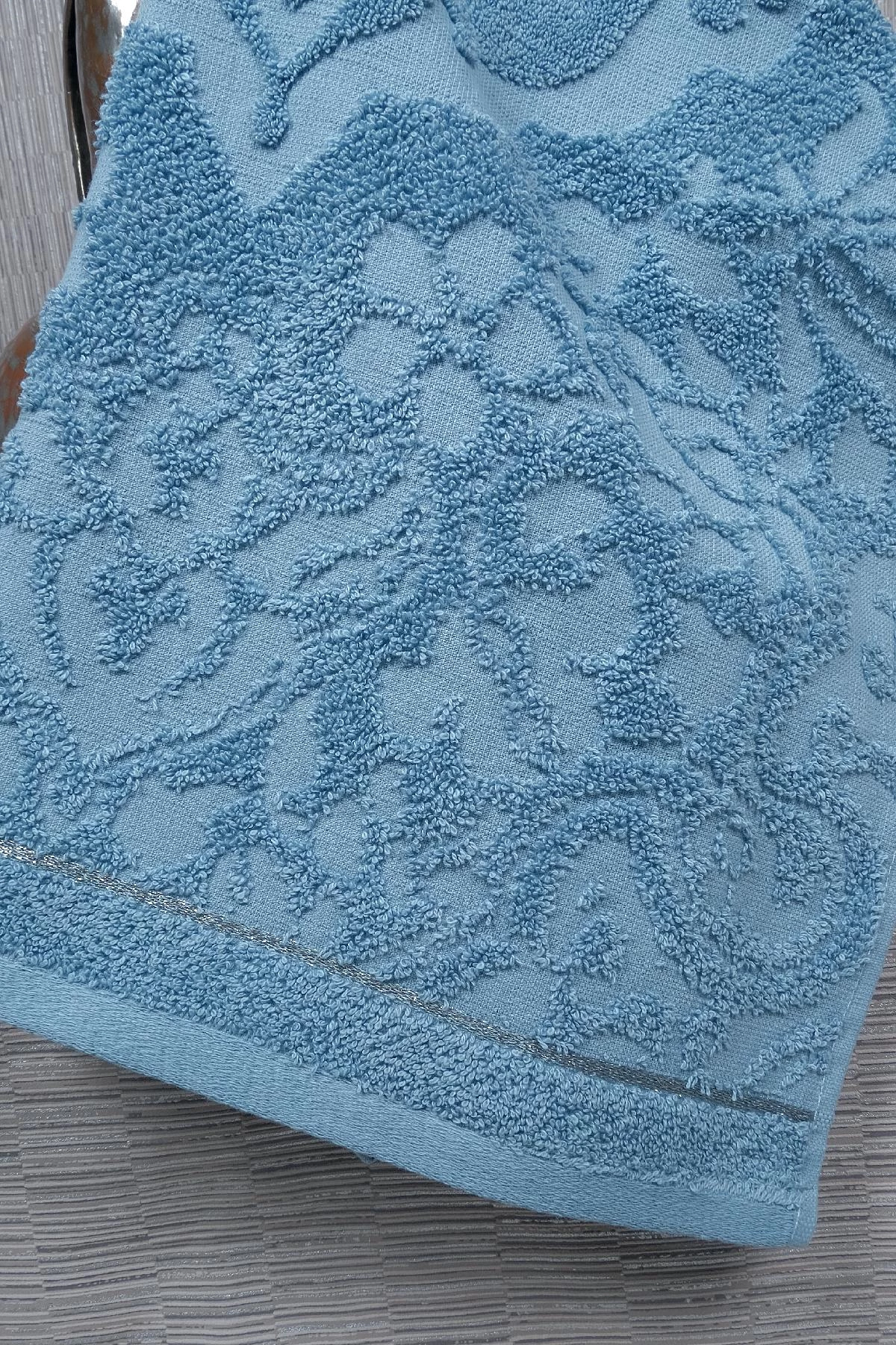 Needion - 3'lü 50x90 Turkuaz Jakarlı Çiçek Desenli Simli Bordürlü El-Yüz Havlu Seti