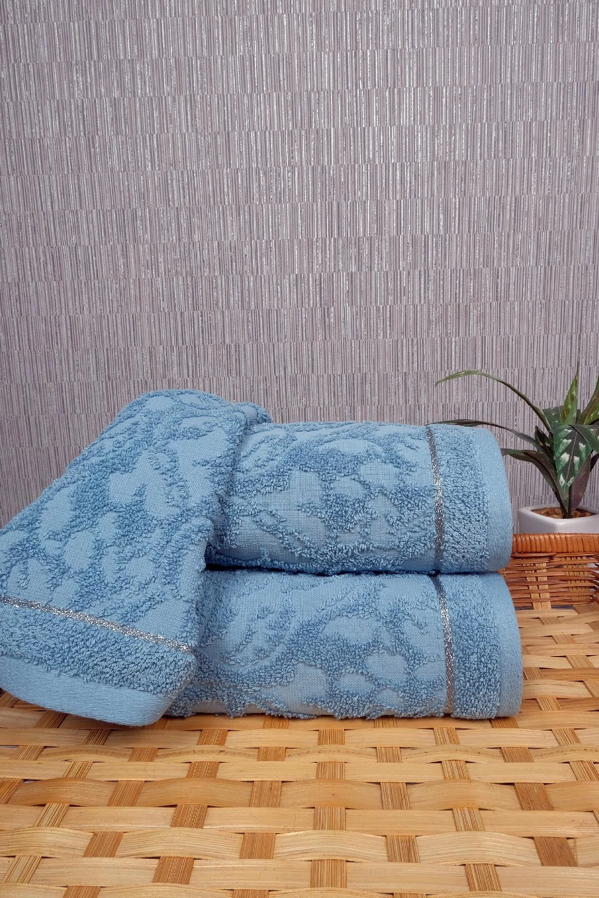 3'lü 50x90 Turkuaz Jakarlı Çiçek Desenli Simli Bordürlü El-Yüz Havlu Seti
