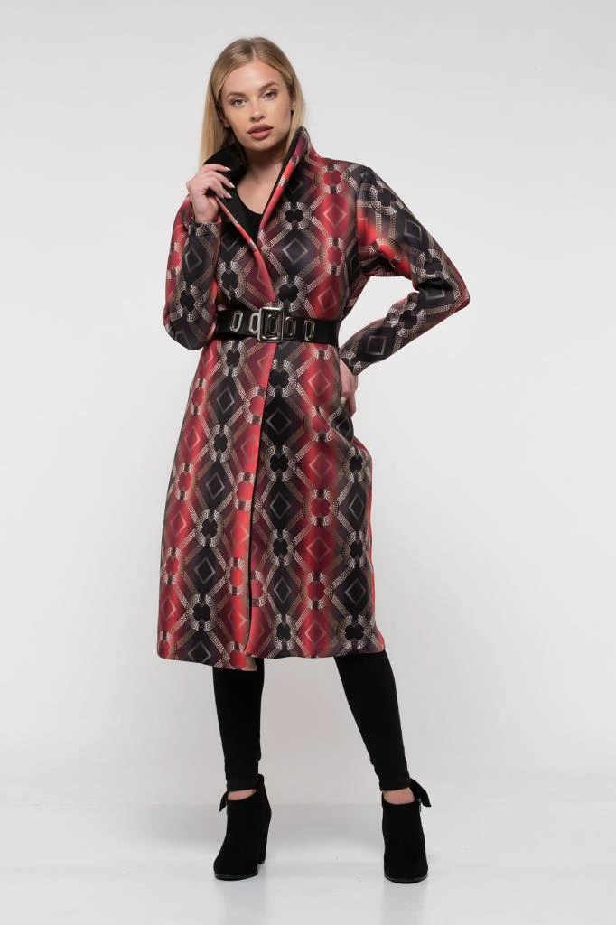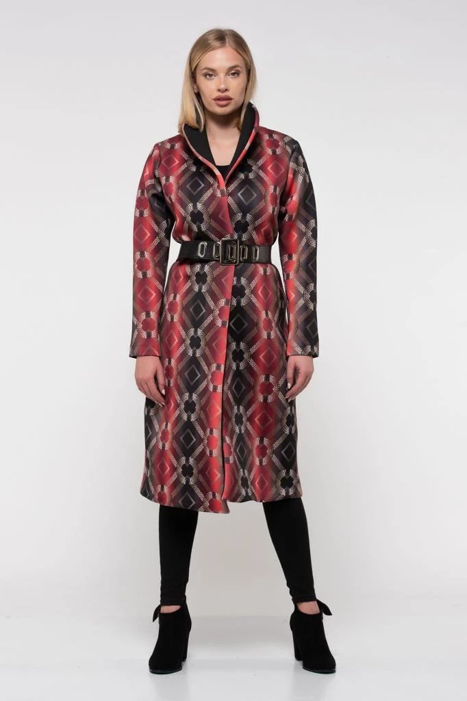 Kemerli Güneş Desenli Uzun Bordo Kadın Ceket Siyah - Bordo S