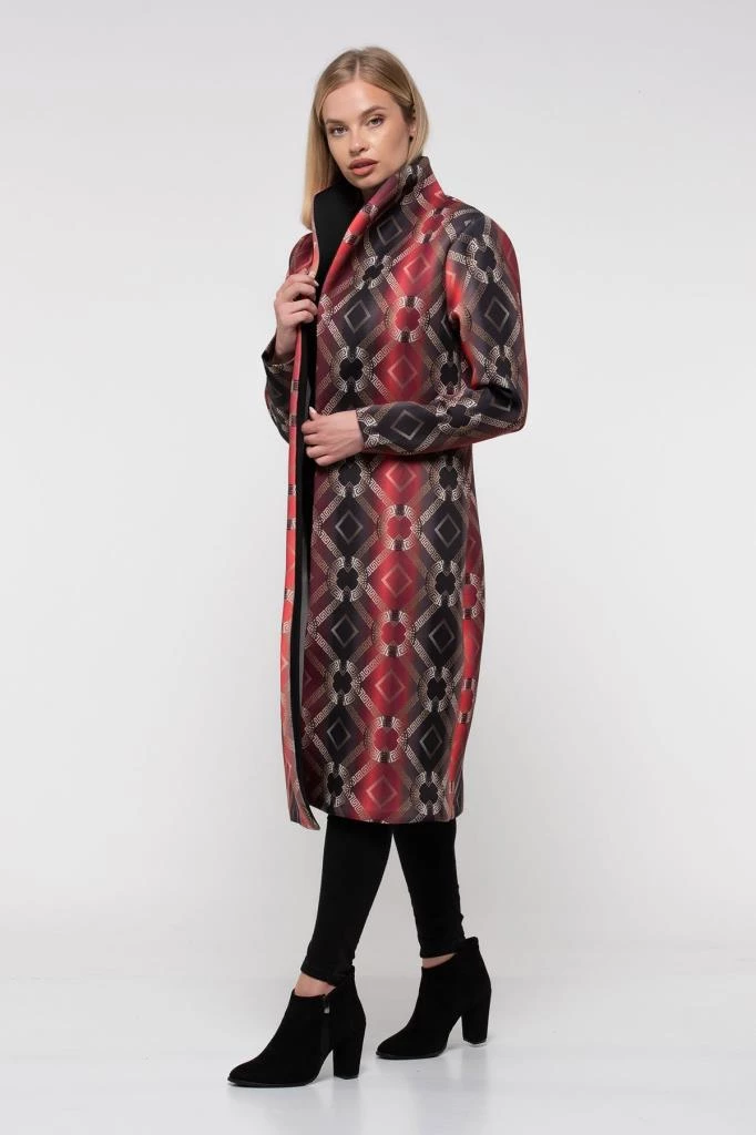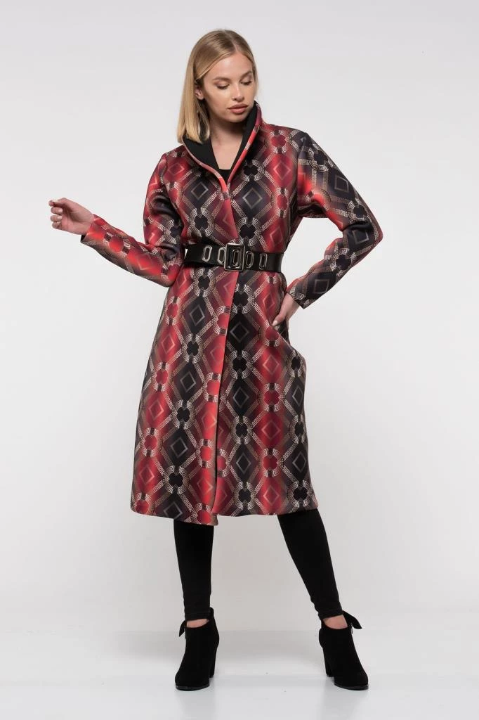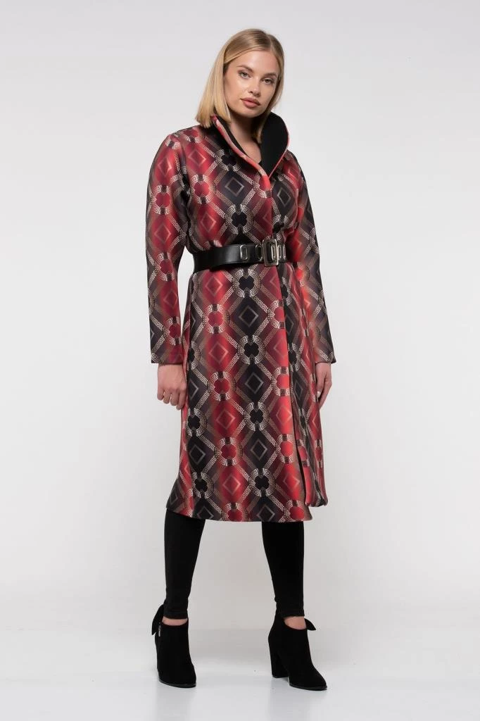 Needion - Kemerli Güneş Desenli Uzun Bordo Kadın Ceket Siyah - Bordo S