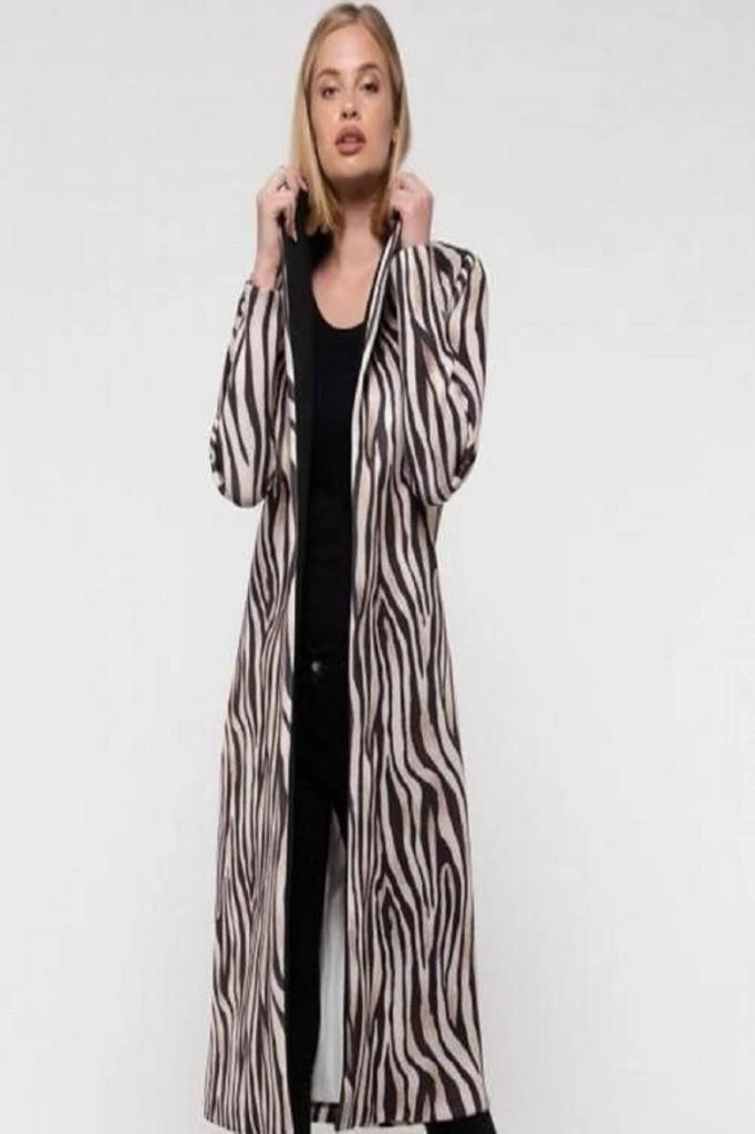 Kemerli Zebra Desenli Uzun Kadın Ceket Zebra Desenli S