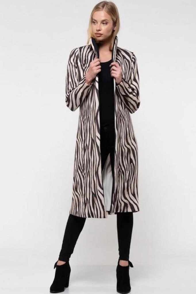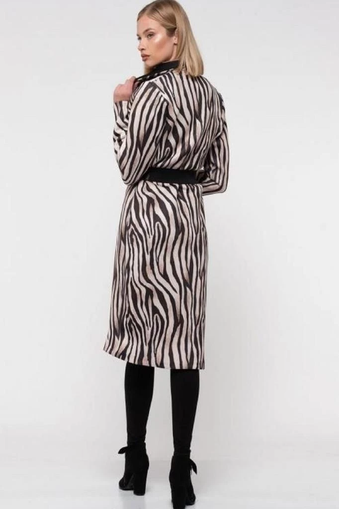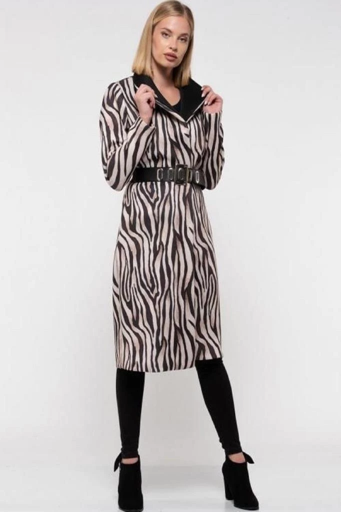 Needion - Kemerli Zebra Desenli Uzun Kadın Ceket Zebra Desenli S