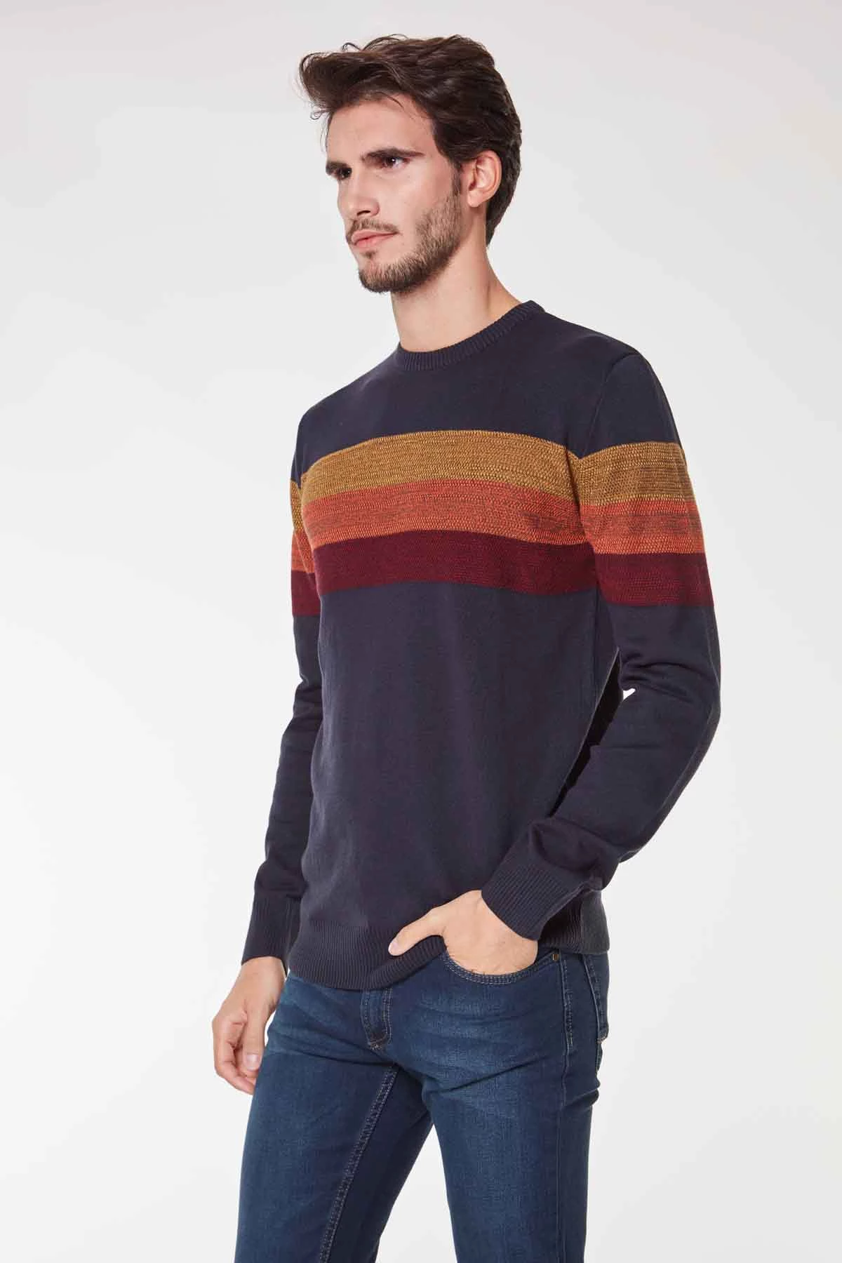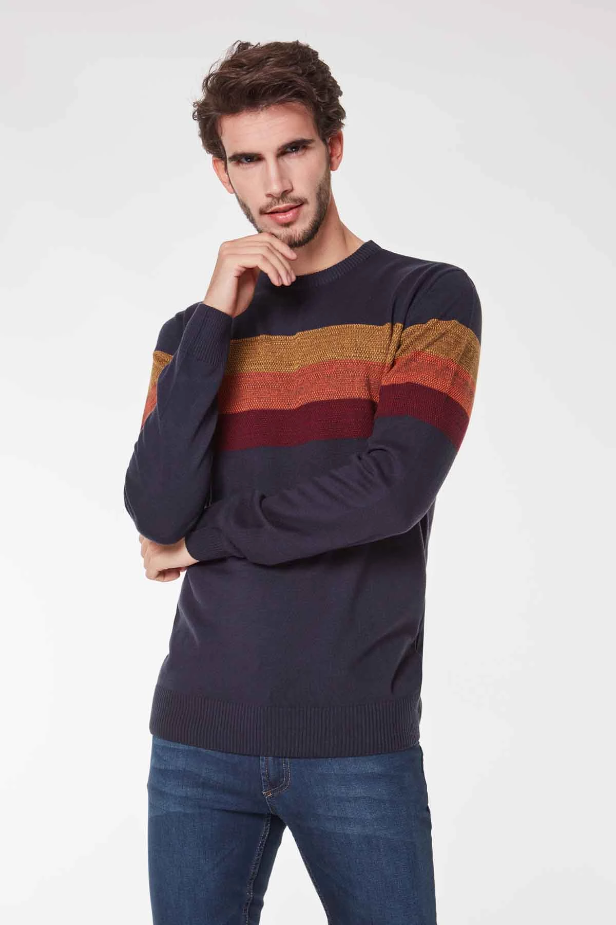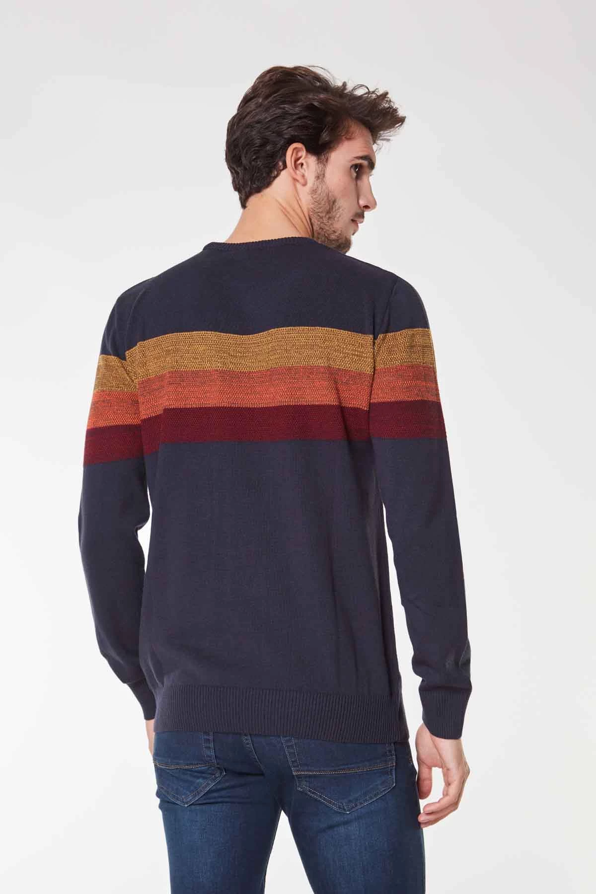 Sıfır Yaka Göğüs Kısmı Renkli Çizgili Erkek Triko