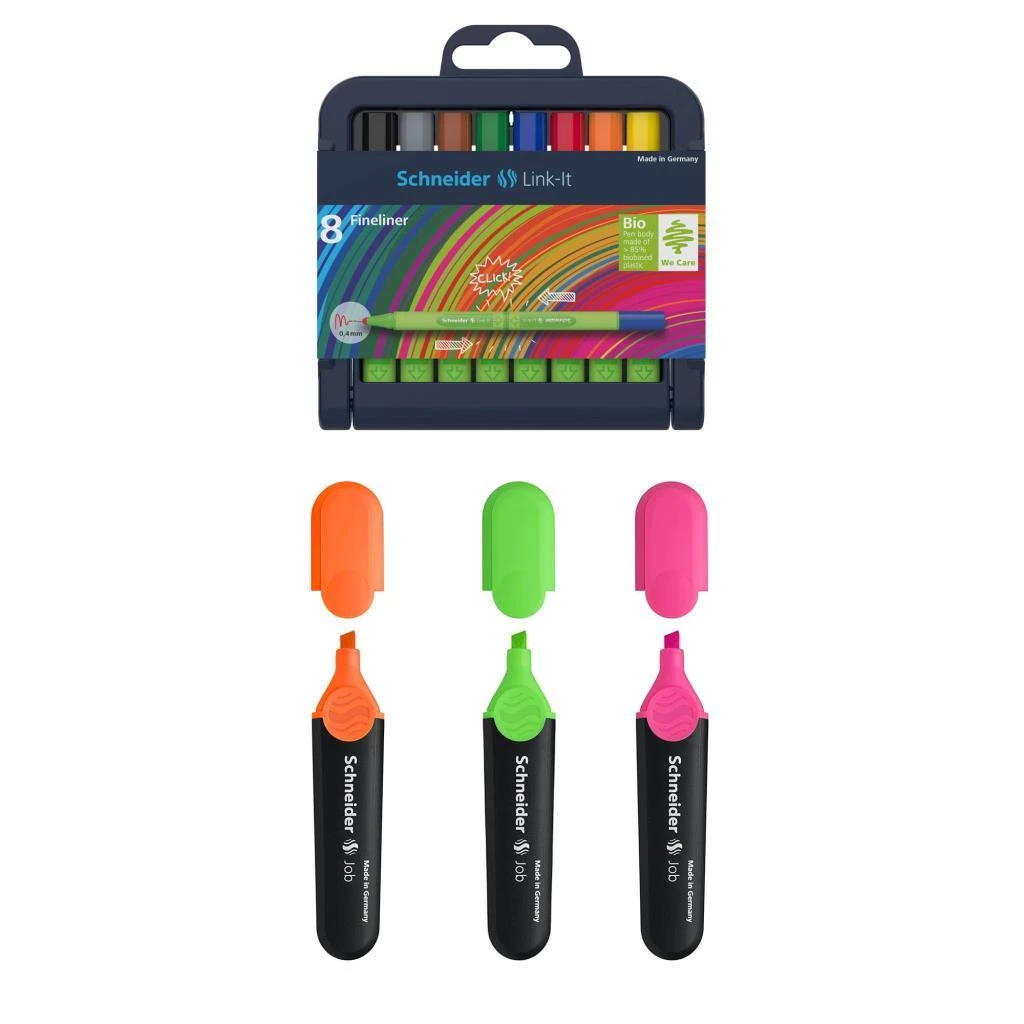 Schneider Link-It Bio-Plastik Fineliner 0.4 mm. 8 Renk Yarım Boy + Job Fosforlu Kalem 3'LÜ Set : 2