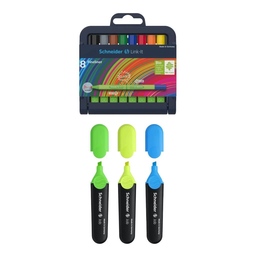 Schneider Link-It Bio-Plastik Fineliner 0.4 mm. 8 Renk Yarım Boy + Job Fosforlu Kalem 3'LÜ