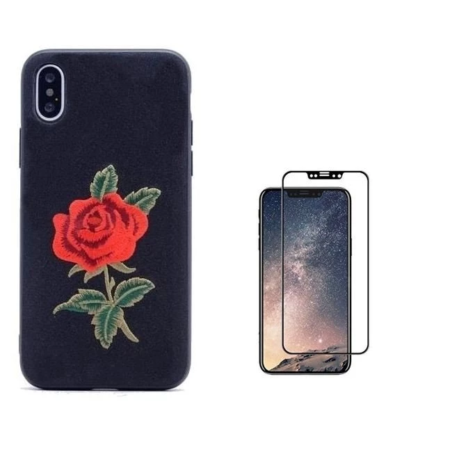 Needion - Teleplus iPhone X Kılıf Gül Desenli Dikişli Silikon    Tam Kapatan Cam Siyah