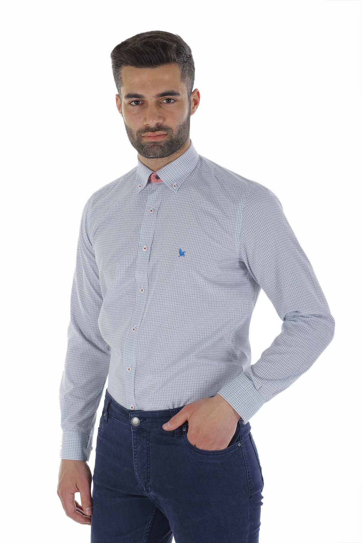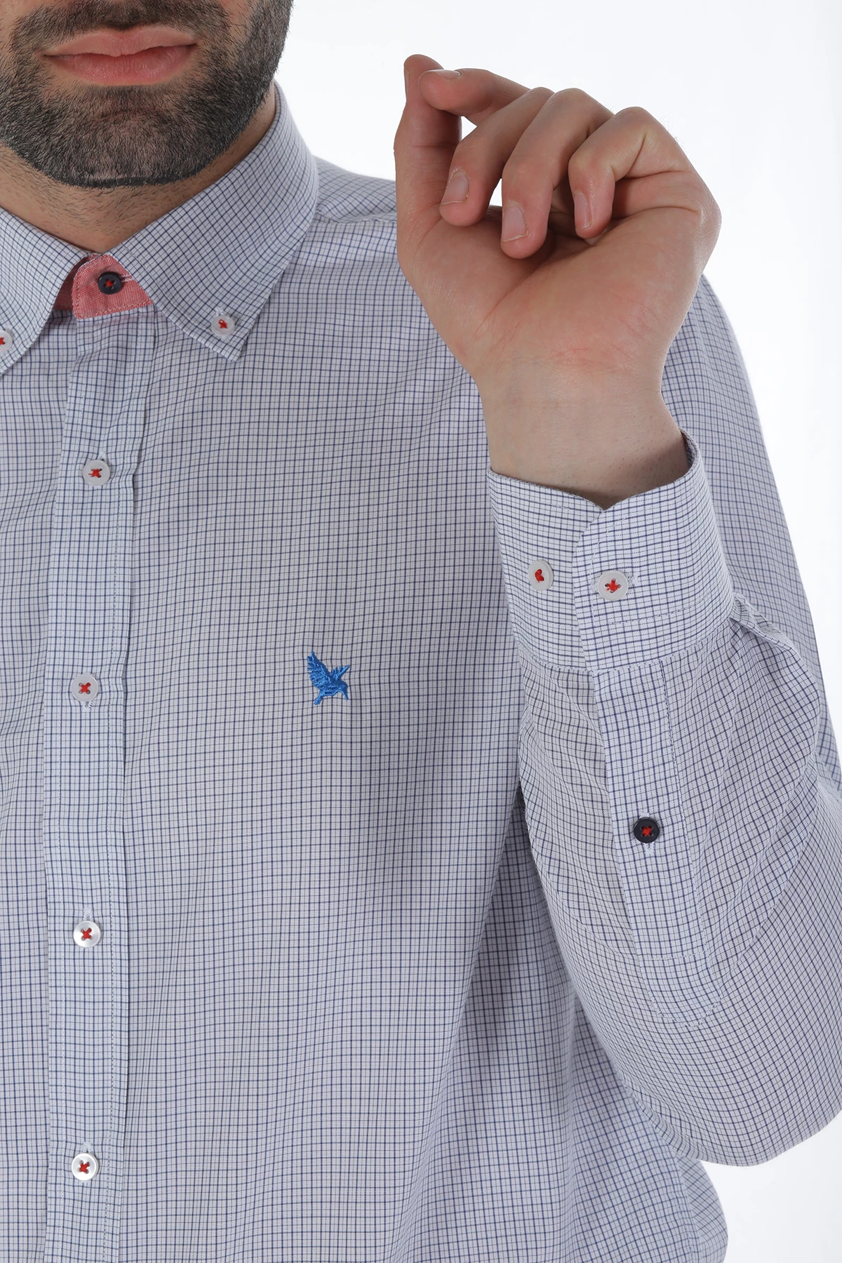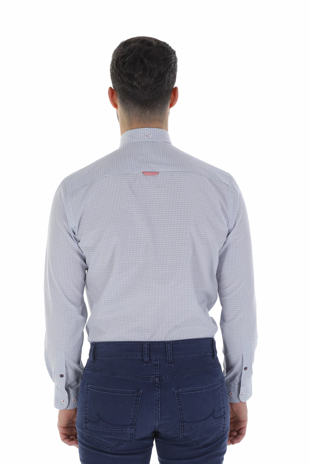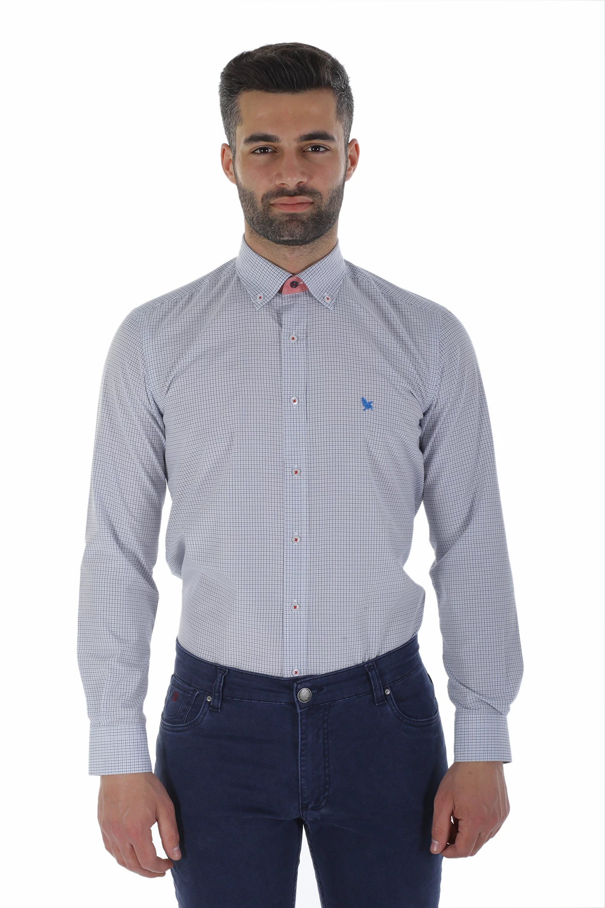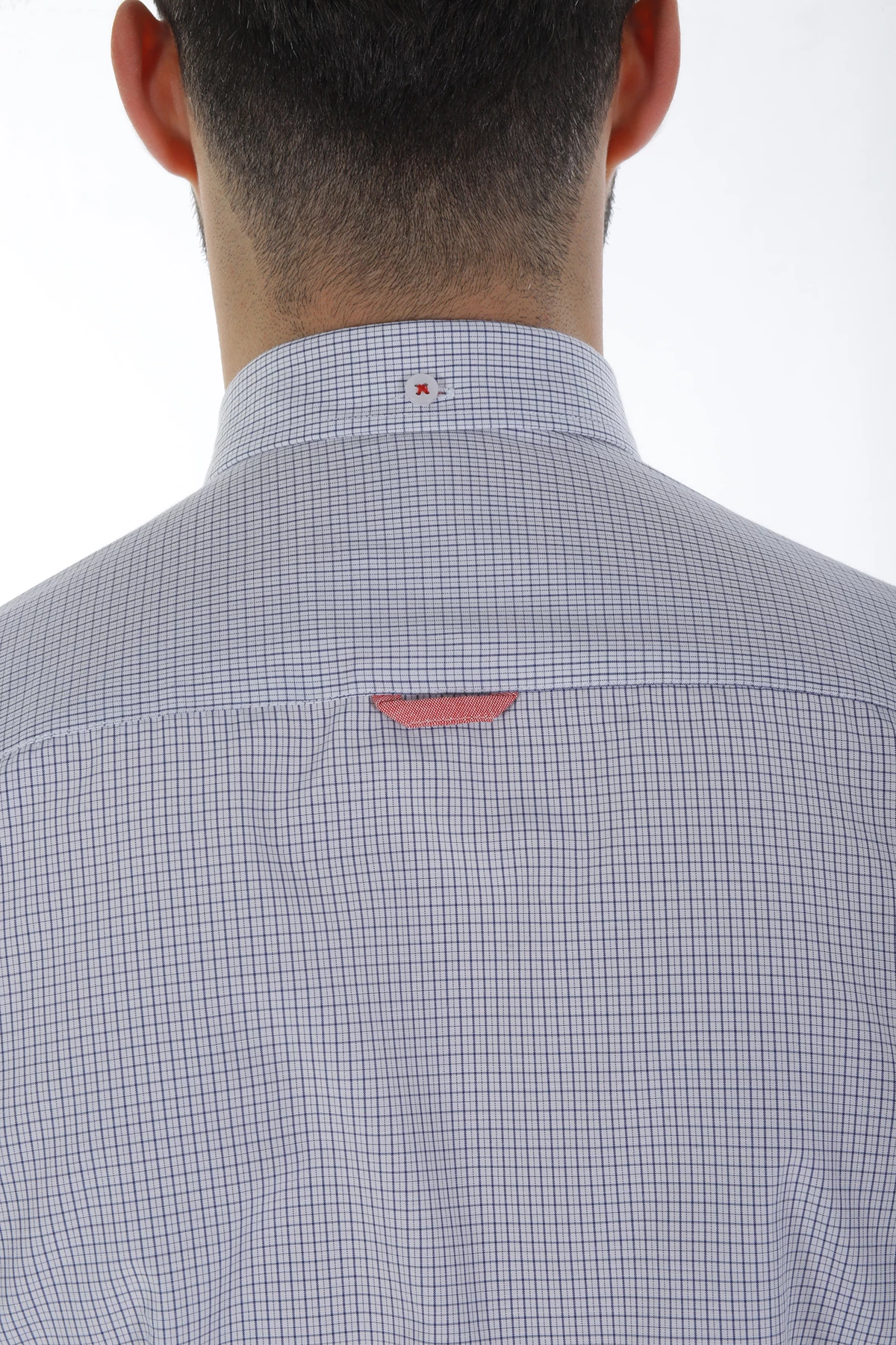 Düğmeli yaka, uzun kollu, piti kareli mevsimlik gömlek. Standart Fit. Cepsiz. İçerik: %100 Pamuk.
