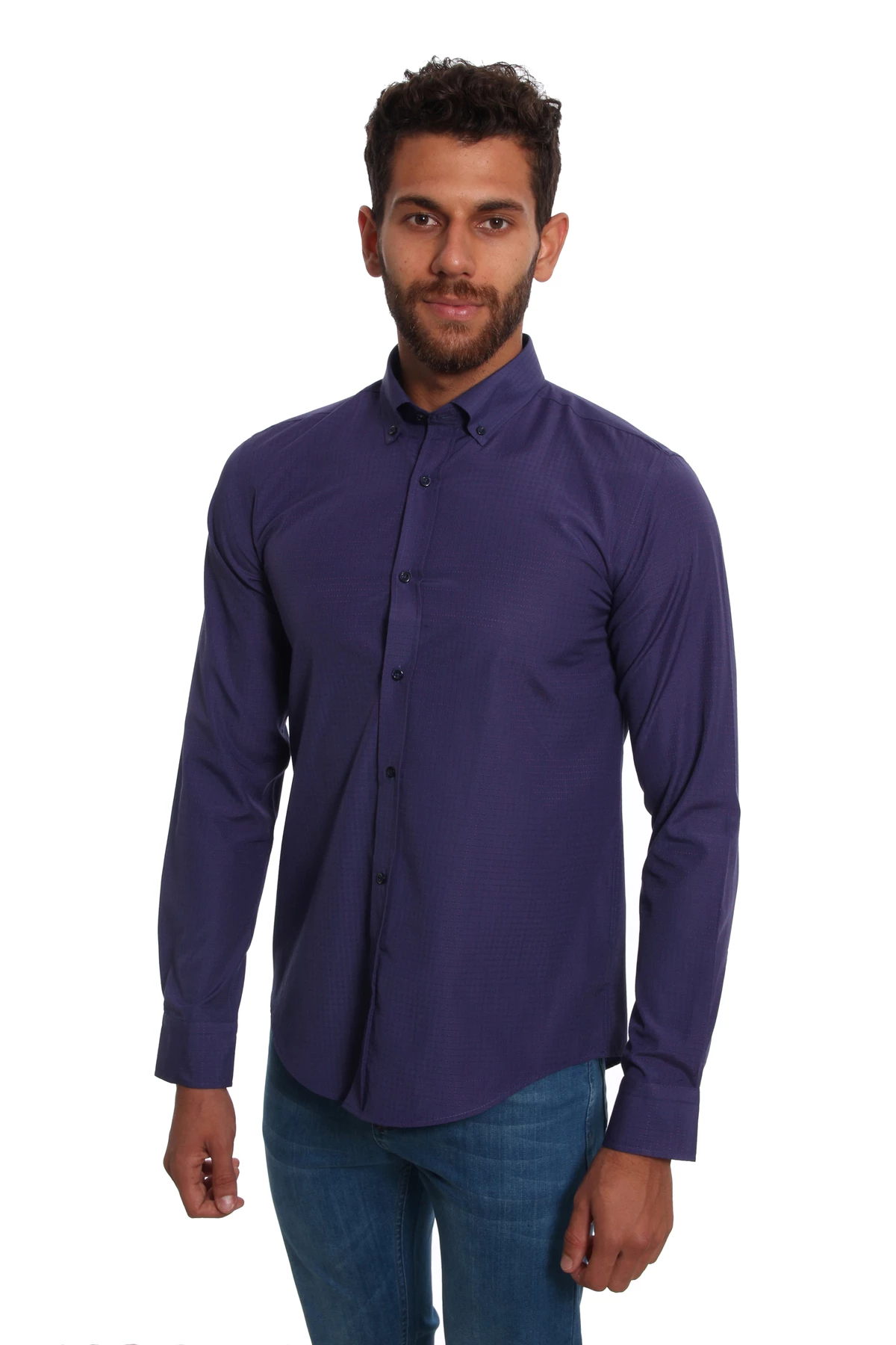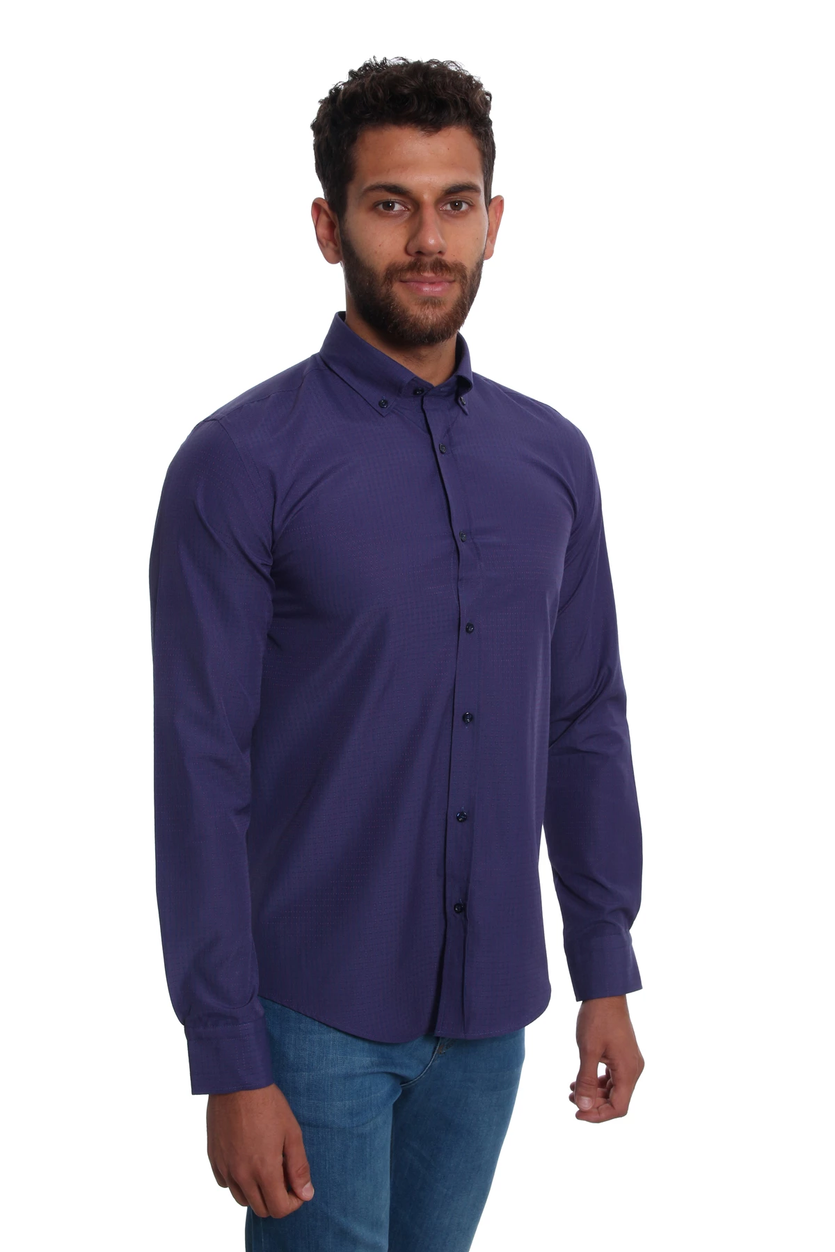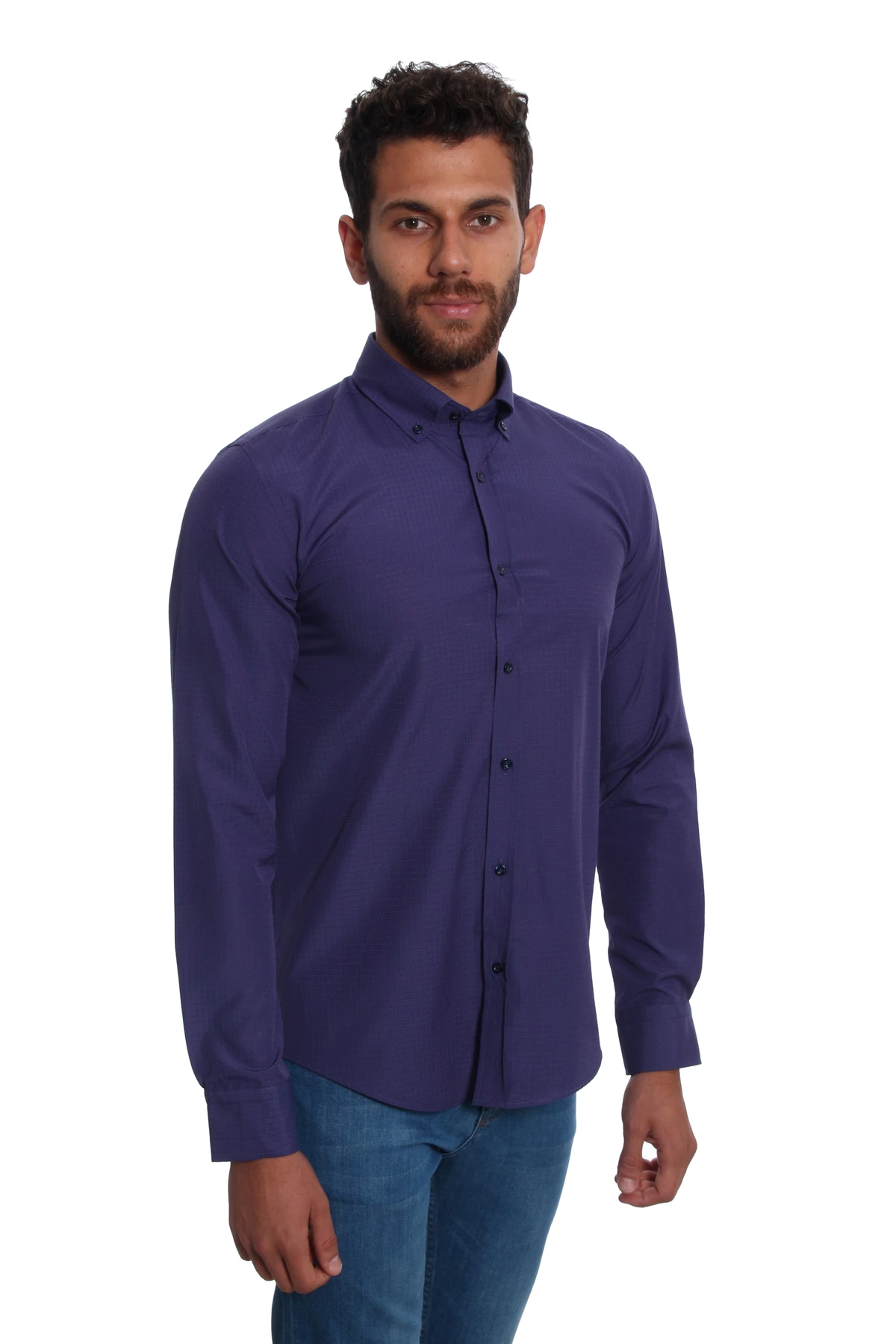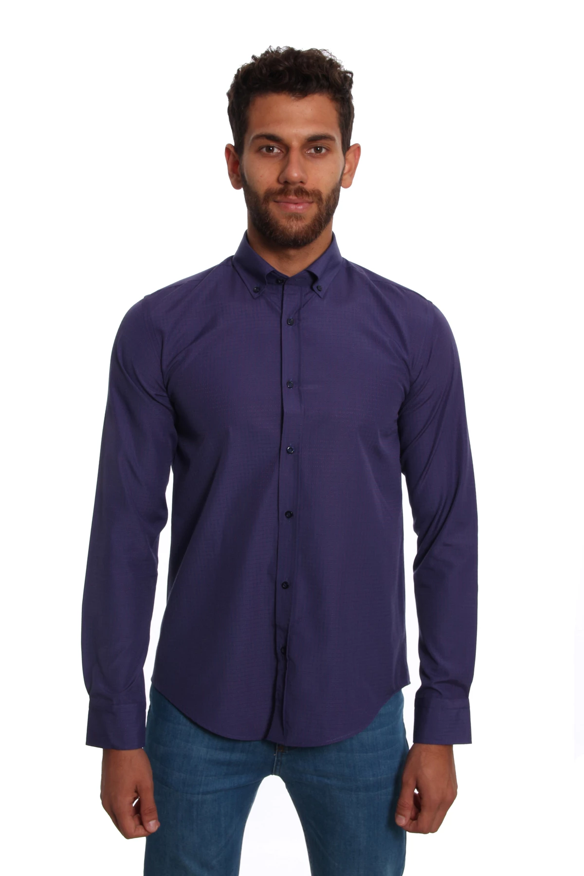 DETAY: Desenli, düğmeli yaka cepsiz erkek gömlek.