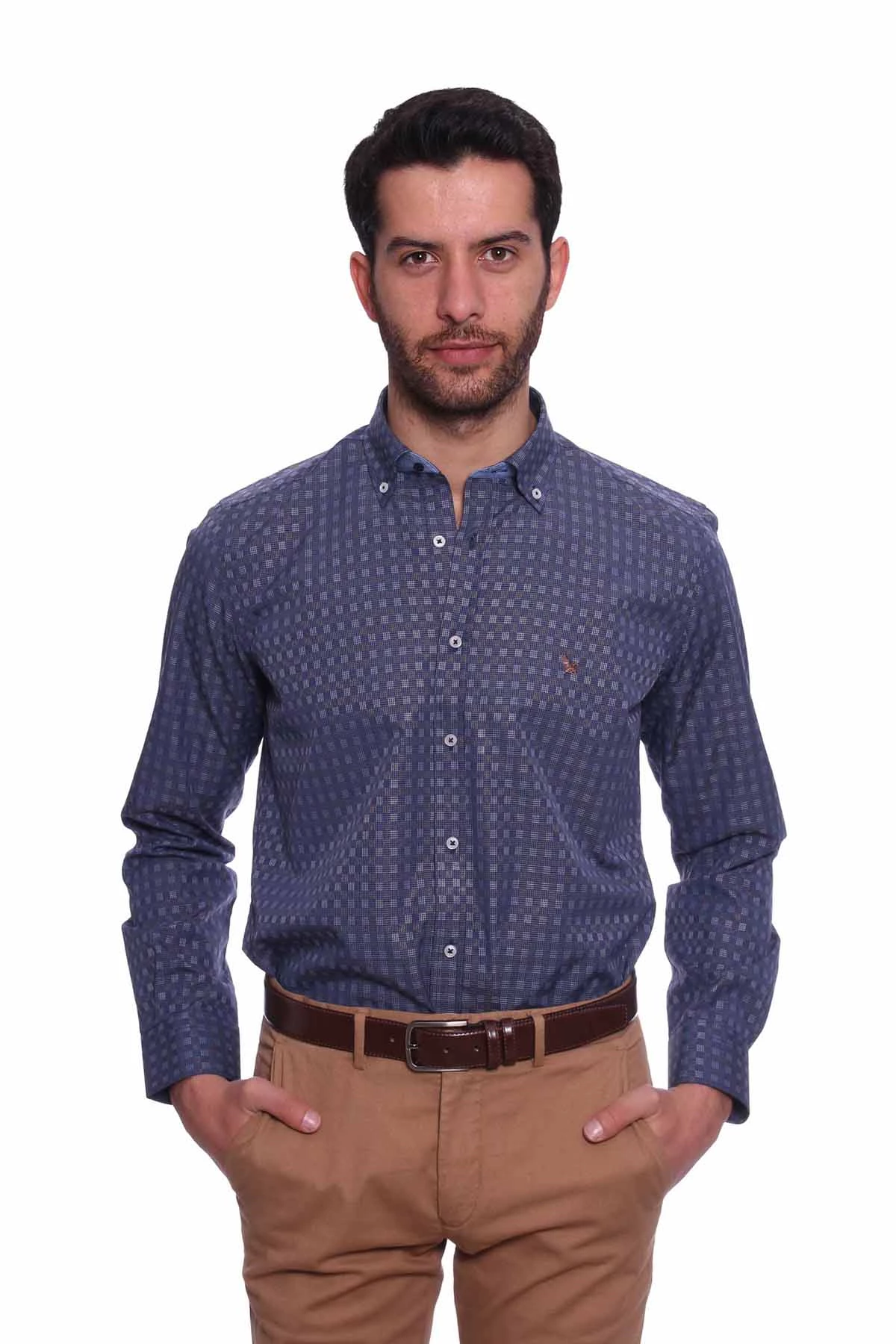 Düğmeli yaka, uzun kollu, piti kareli mevsimlik gömlek. Standart Fit. Cepsiz. İçerik: %100 Pamuk.