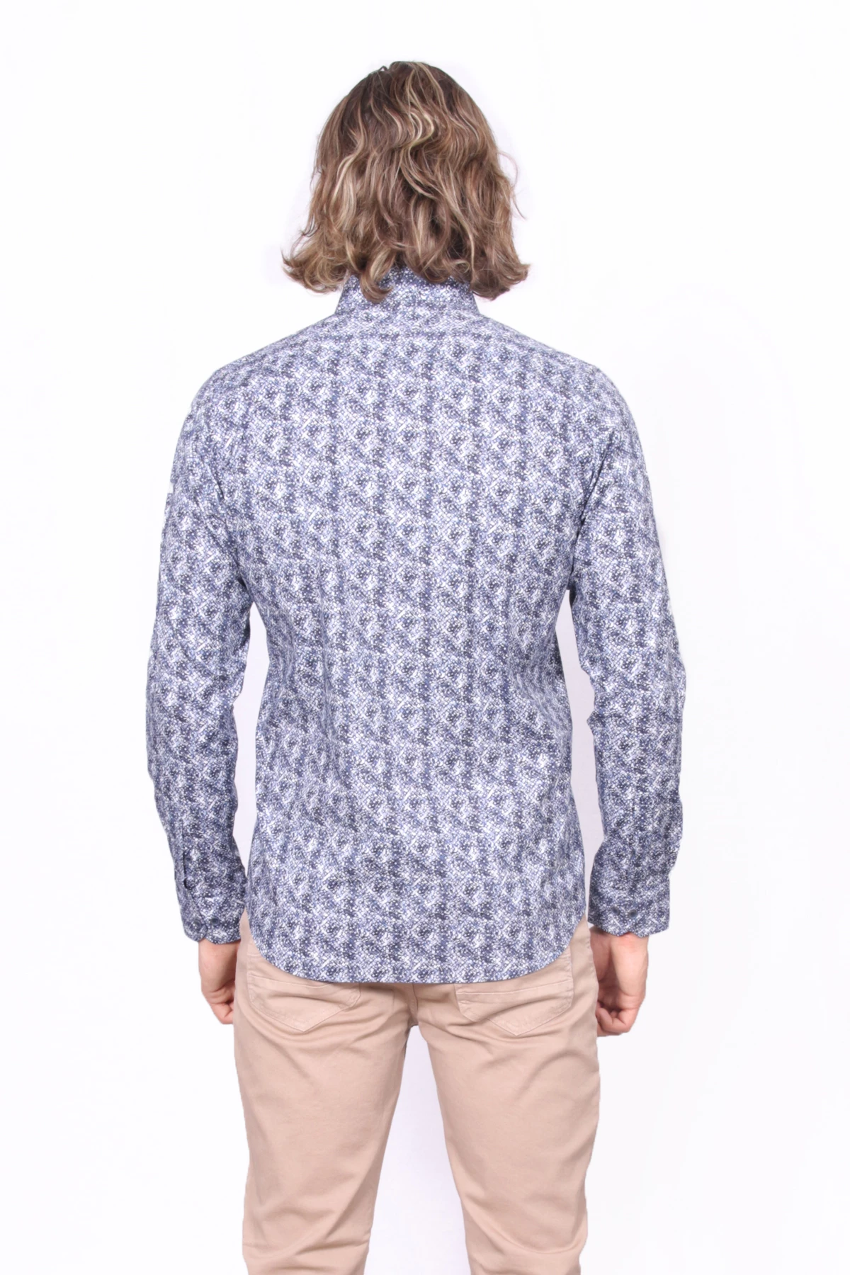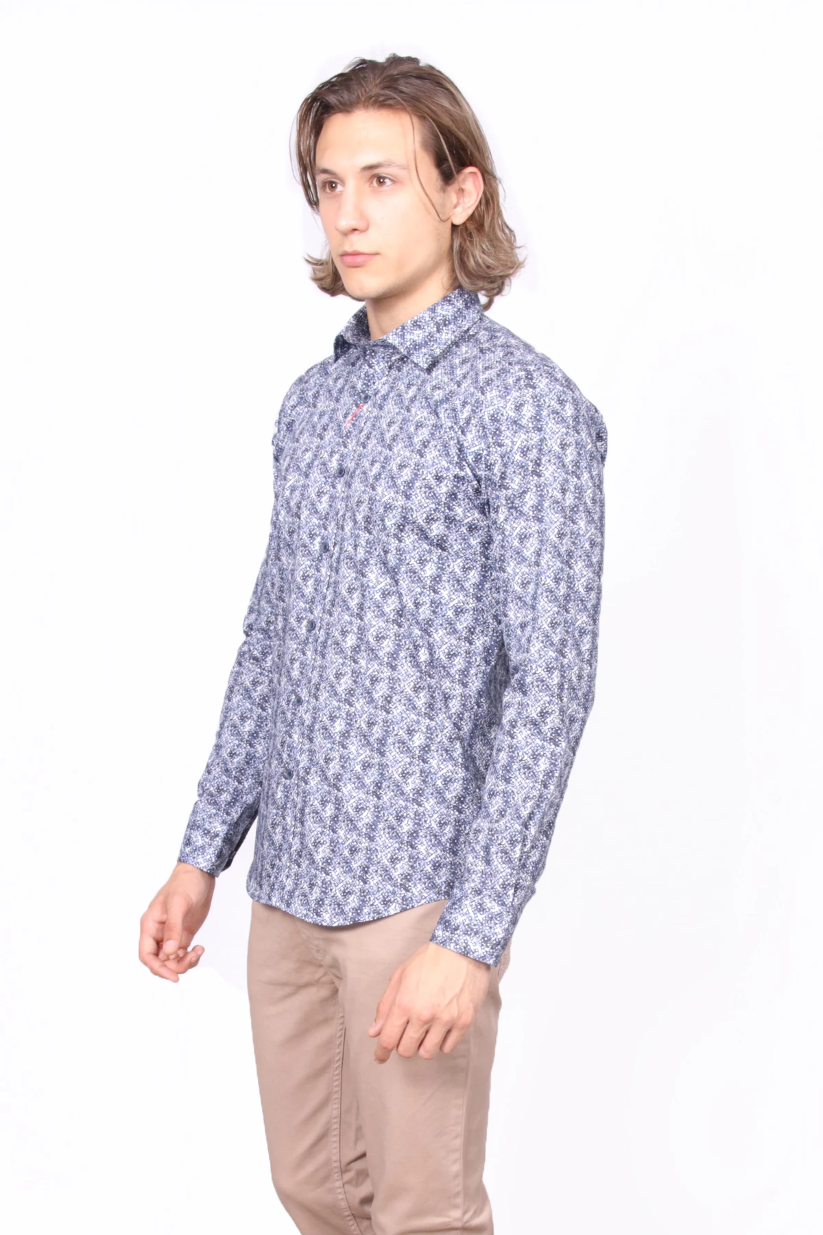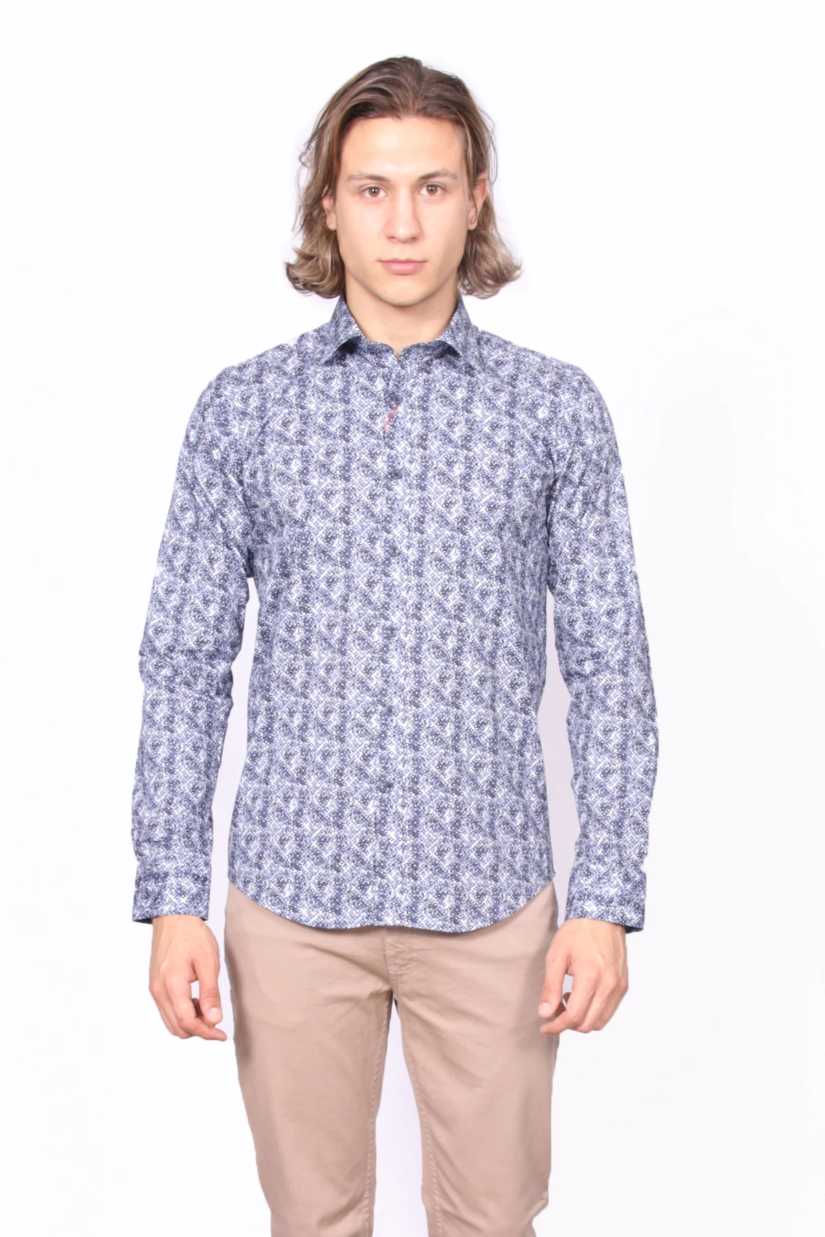 Slim Fit, yakası gizli düğmeli,cepsiz uzun kollu desenli gömlek.İçerik:%97 Pamuk, %3 Elastan.