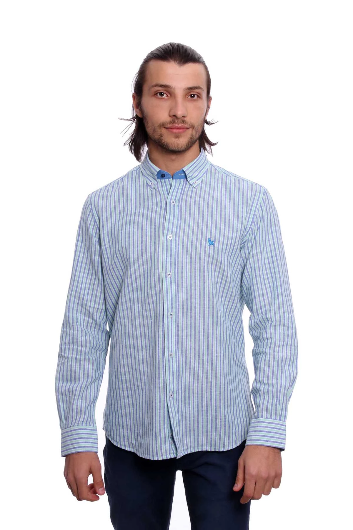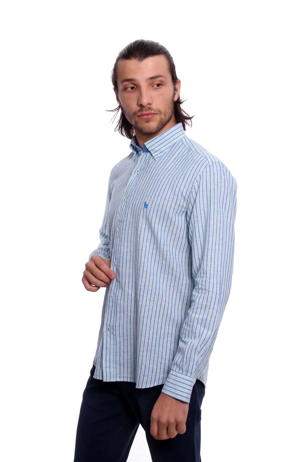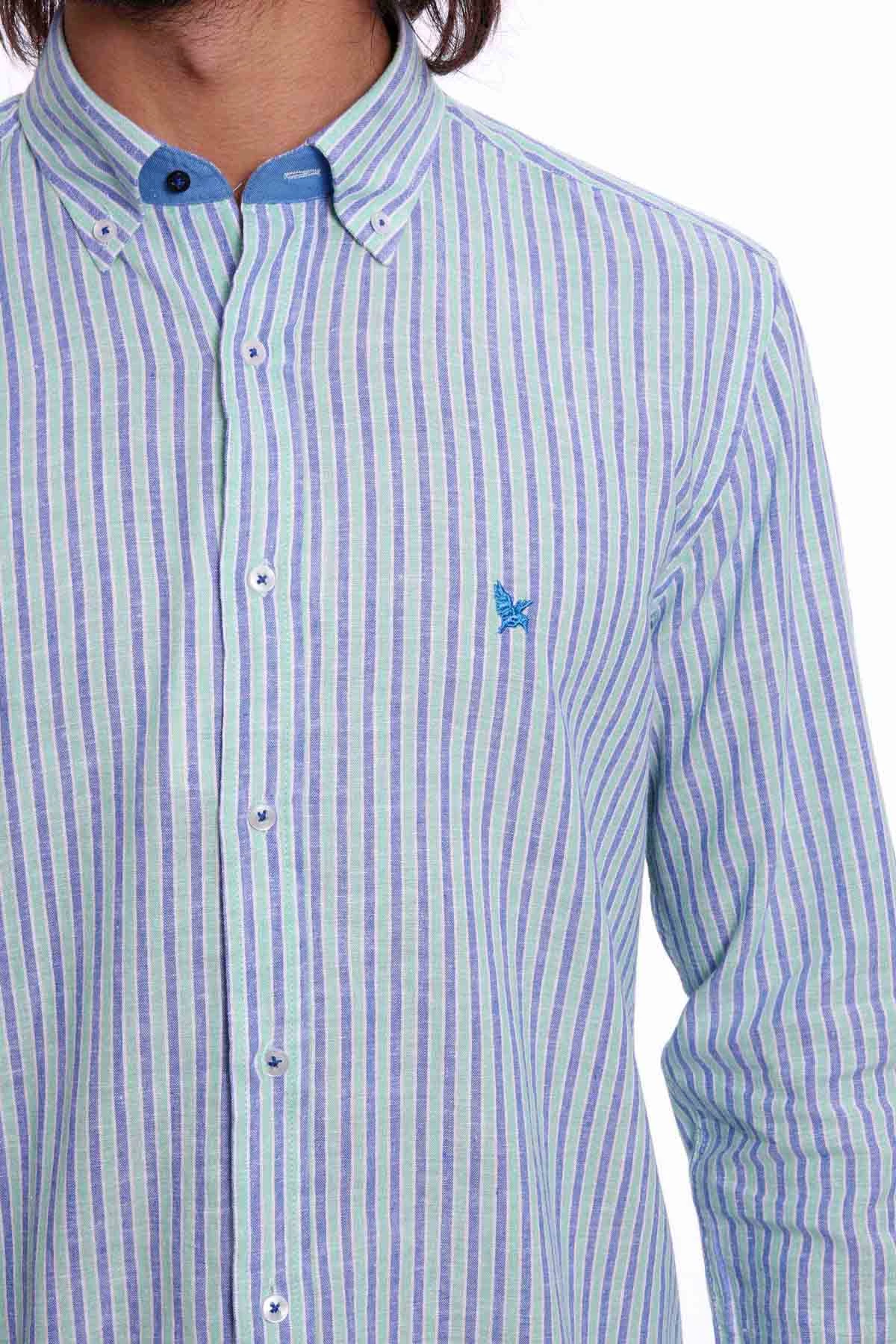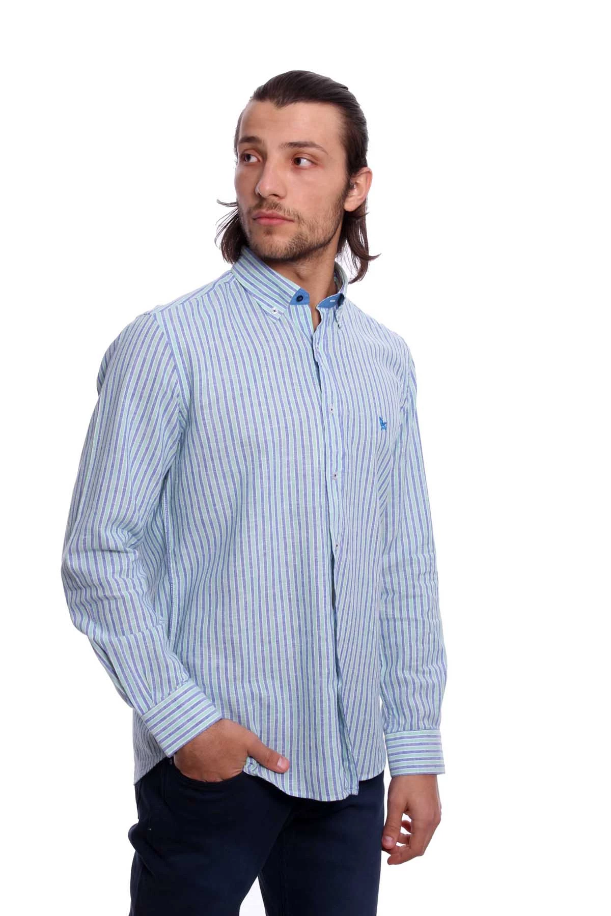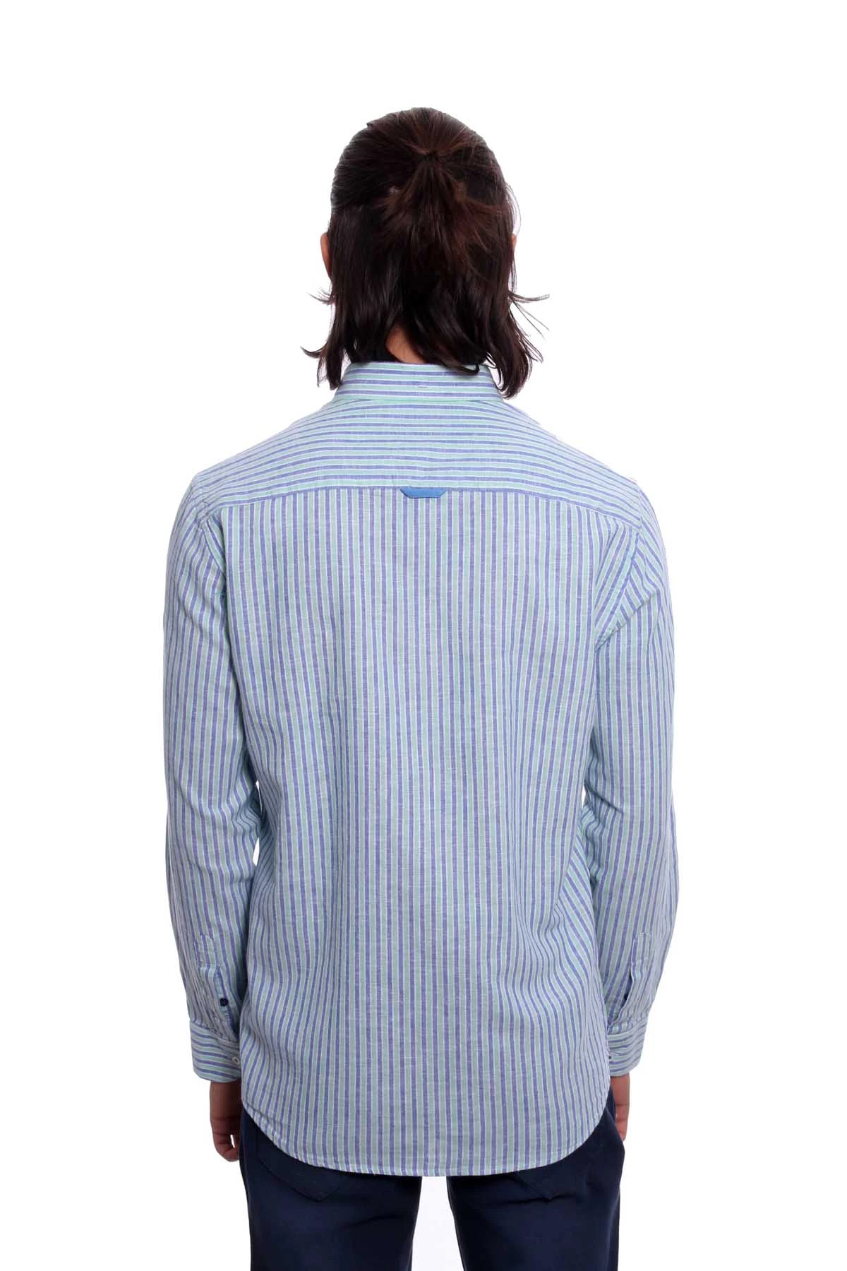Düğmeli yaka, uzun kollu, çizgili mevsimlik gömlek. Regular Fit. Cepsiz. İçerik: %60 Keten, %40 Pamuk.