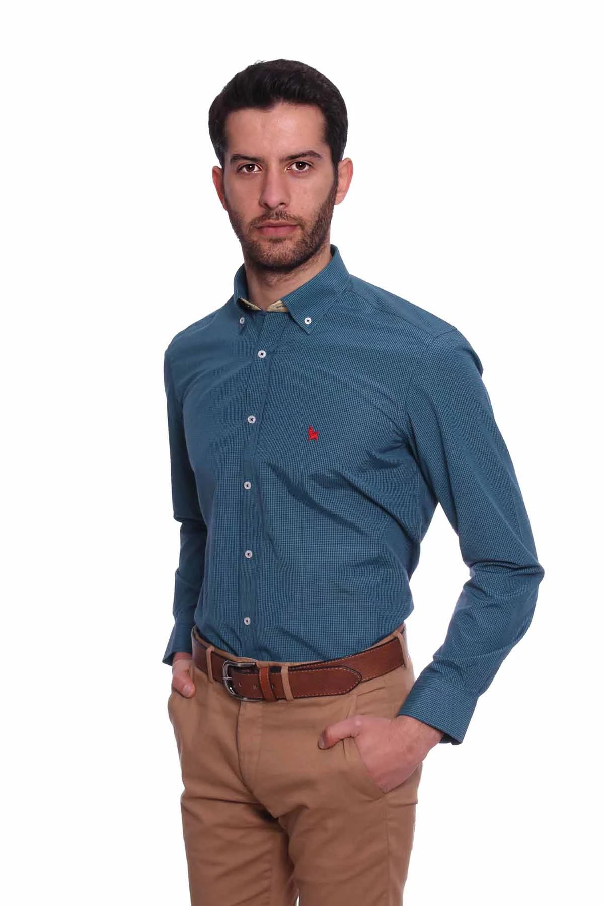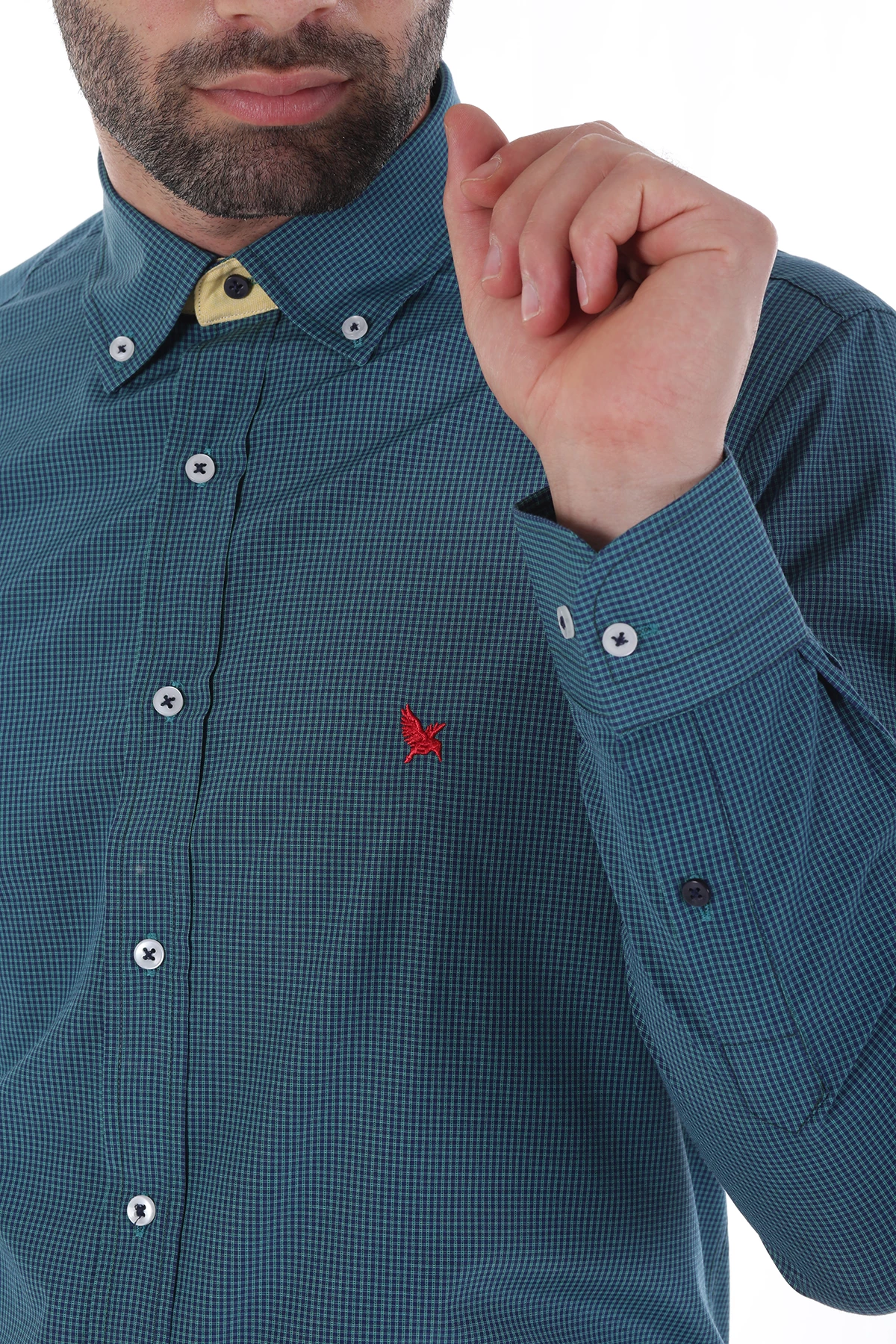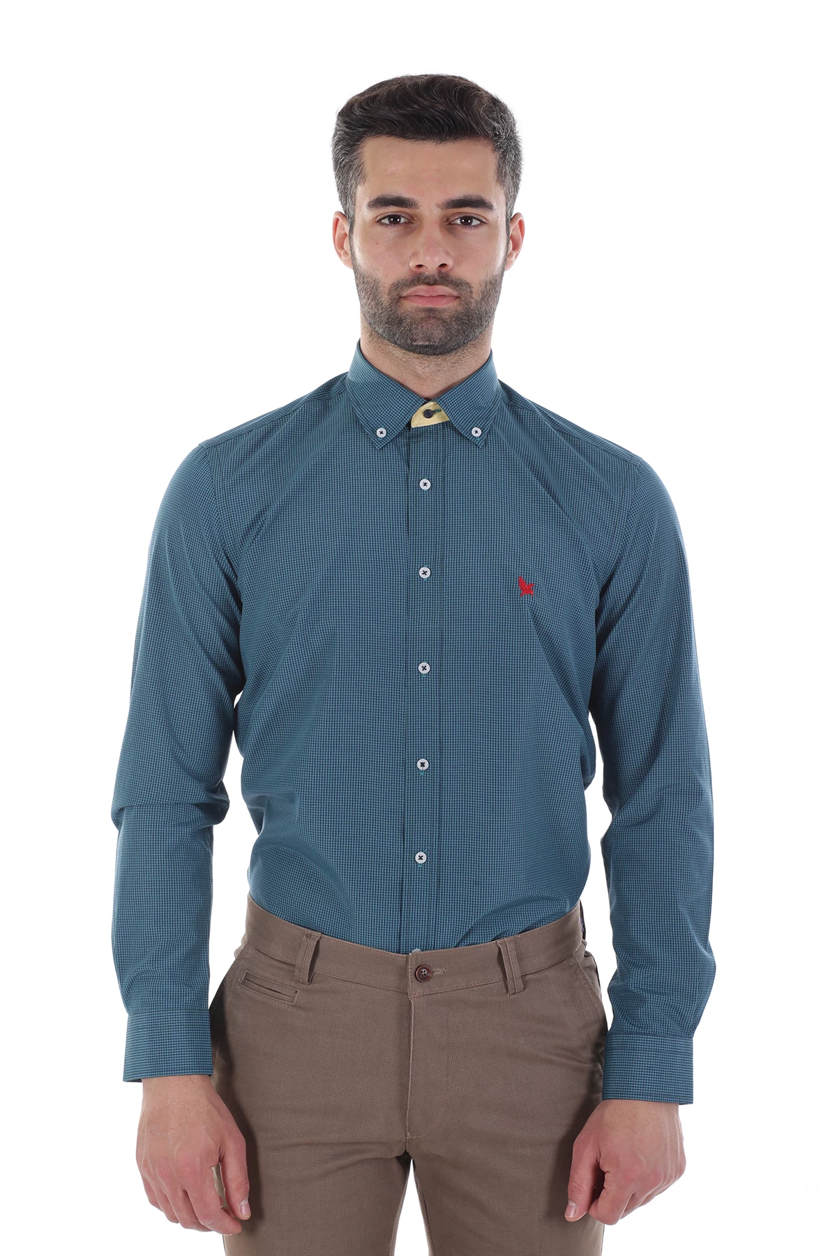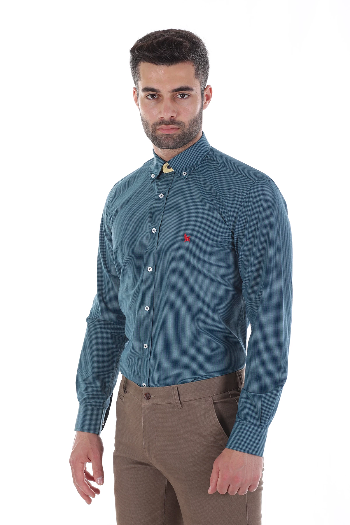 Düğmeli yaka, uzun kollu, piti kareli mevsimlik gömlek. Standart Fit. Cepsiz. İçerik: %100 Pamuk.