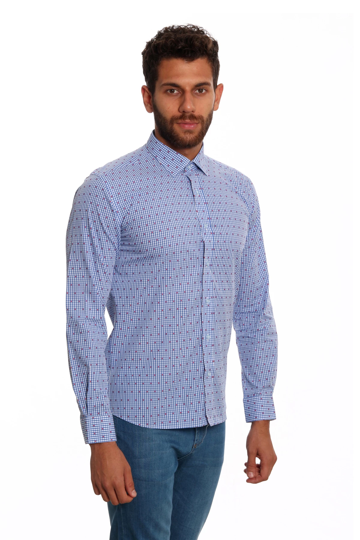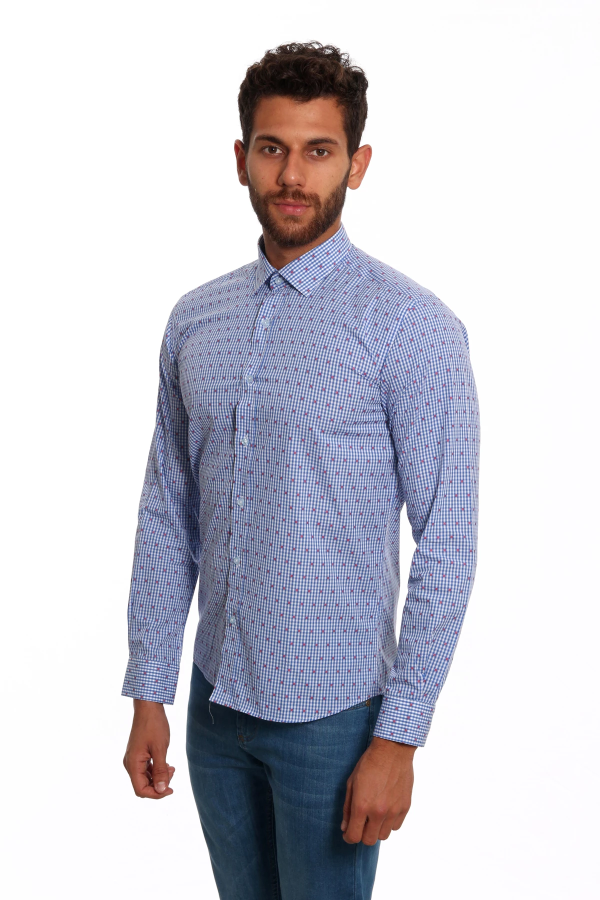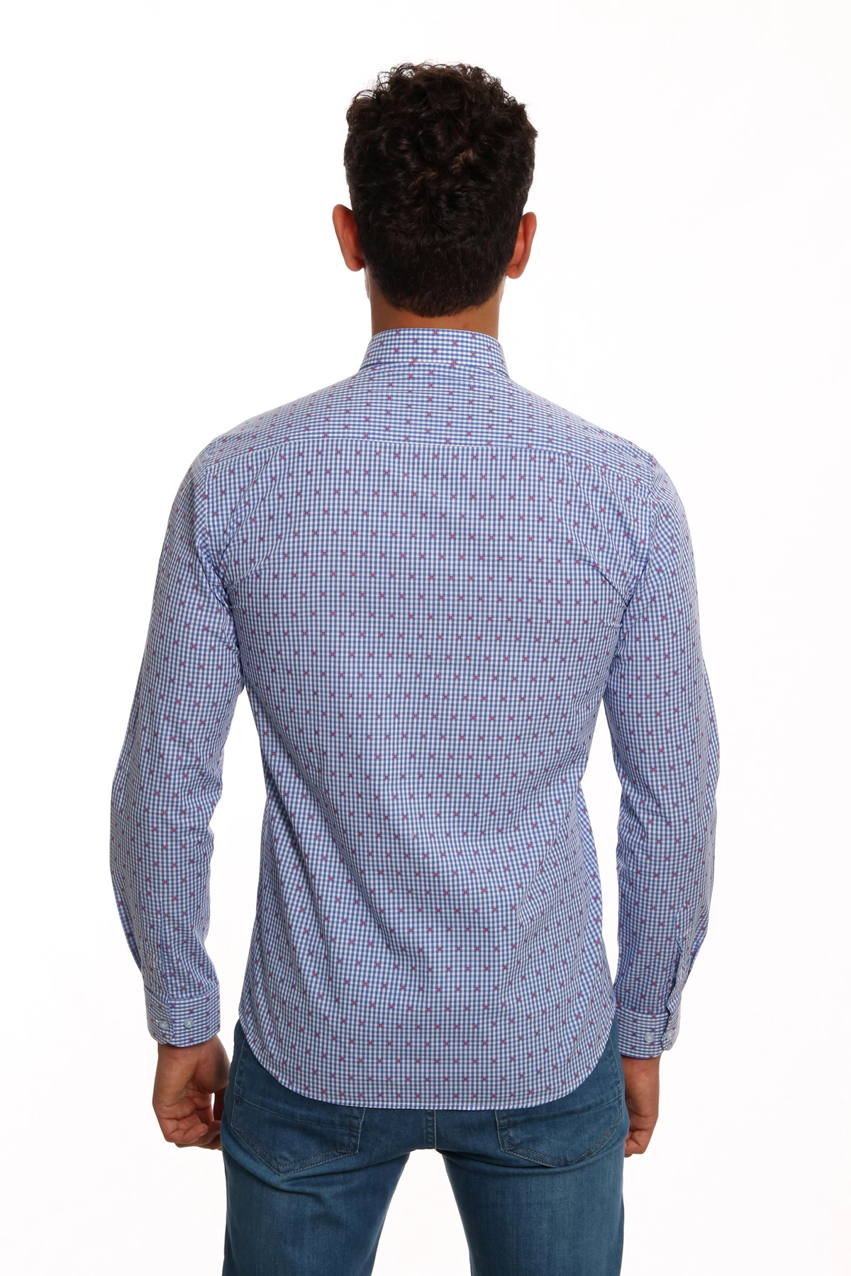 DETAY: Desenli, düz yaka cepsiz erkek gömlek.