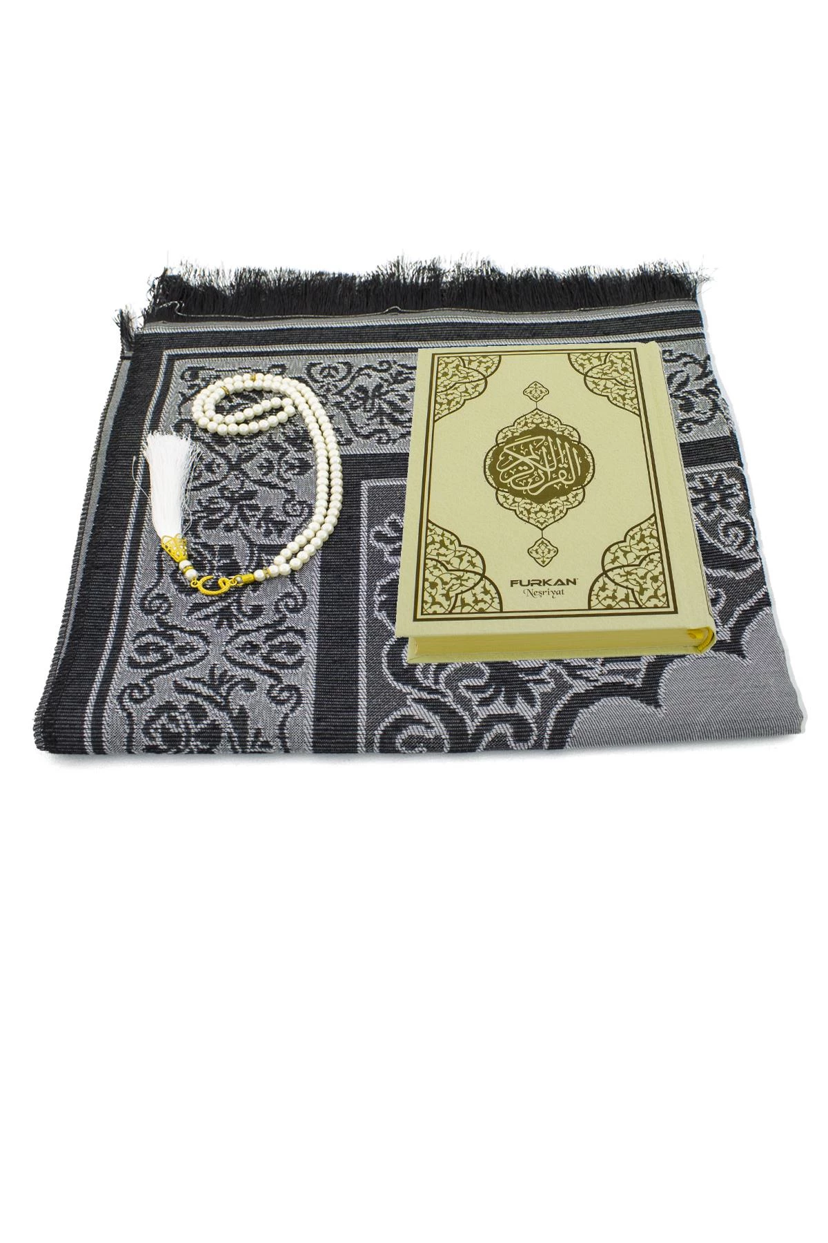 Needion - Kuranı Kerim Krem Hafız Boy Siyah Seccade Beyaz İnci Tesbih Seti