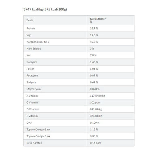 İÇİNDEKİLER: Tavuk unu (% 25), patates nişastası, sarı bezelye, kurutulmuş bezelye, kurutulmuş patates, hayvansal yağ, dijest, mineraller, bitkisel yağ, keten tohumu, kurutulmuş pancar posası, balık yağı, kurutulmuş havuç, kurutulmuş domates posası, kurutulmuş narenciye posası , ıspanak tozu.