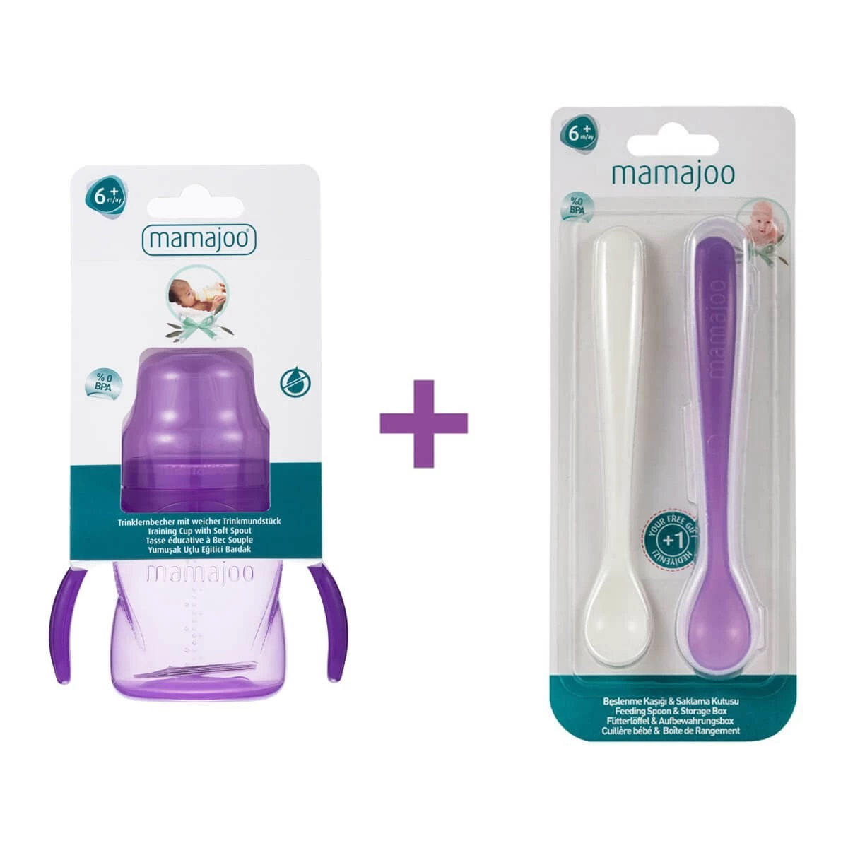 Mamajoo Kulplu Eğitici Bardak 160 ml & İkili Beslenme Kaşığı/Mor