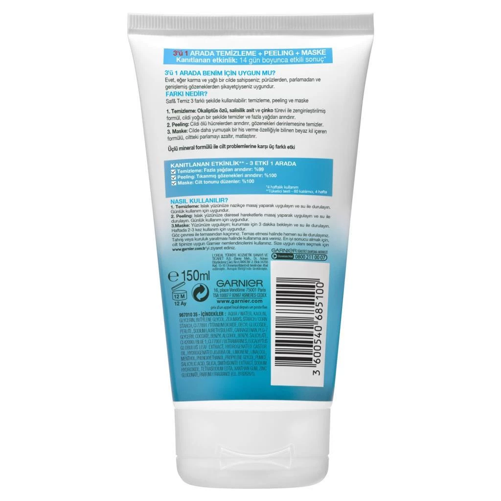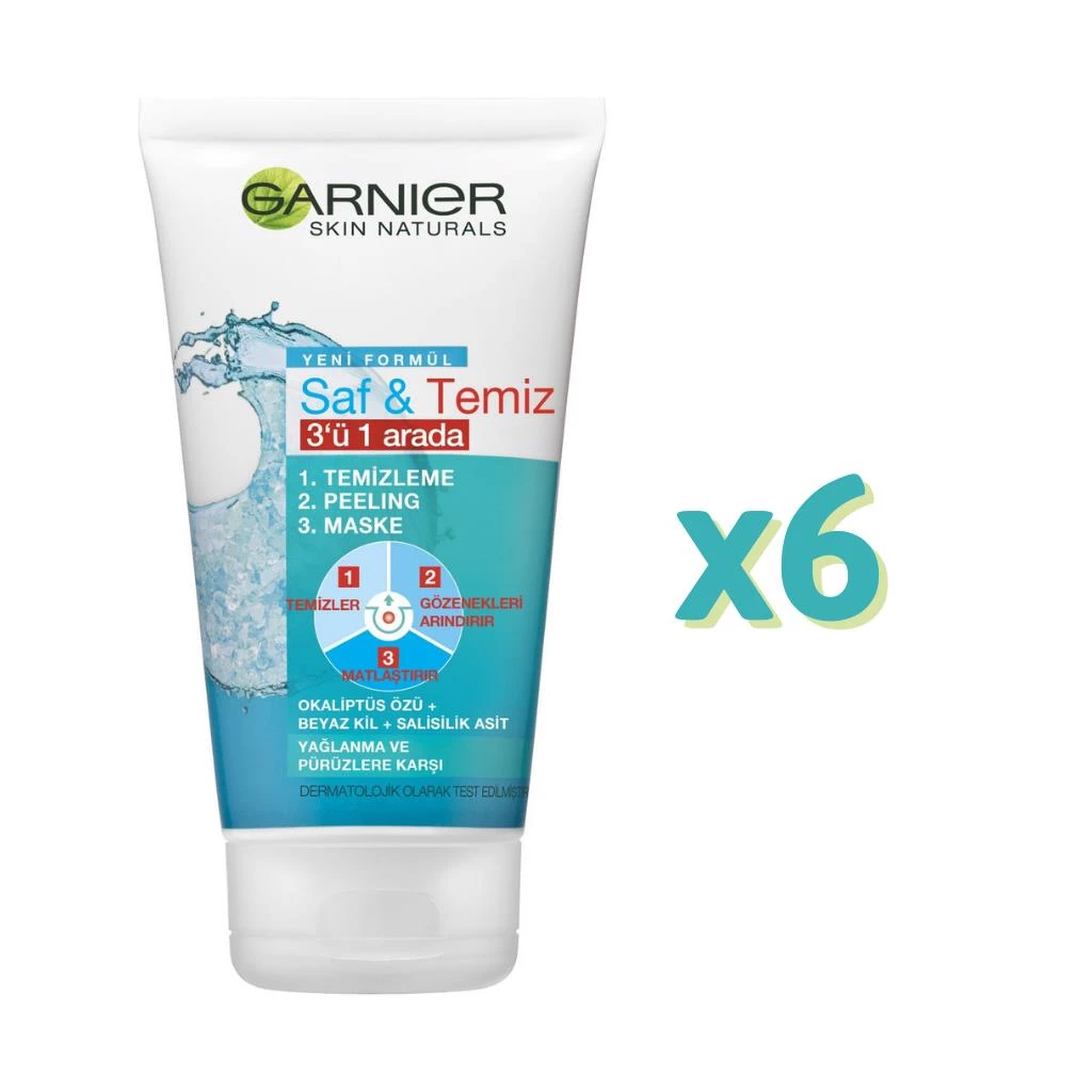 Garnier Saf & Temiz 3ü1 Arada (Maske + Peeling + Yıkama ) 150 ml 6 Adet (1 Kutu)