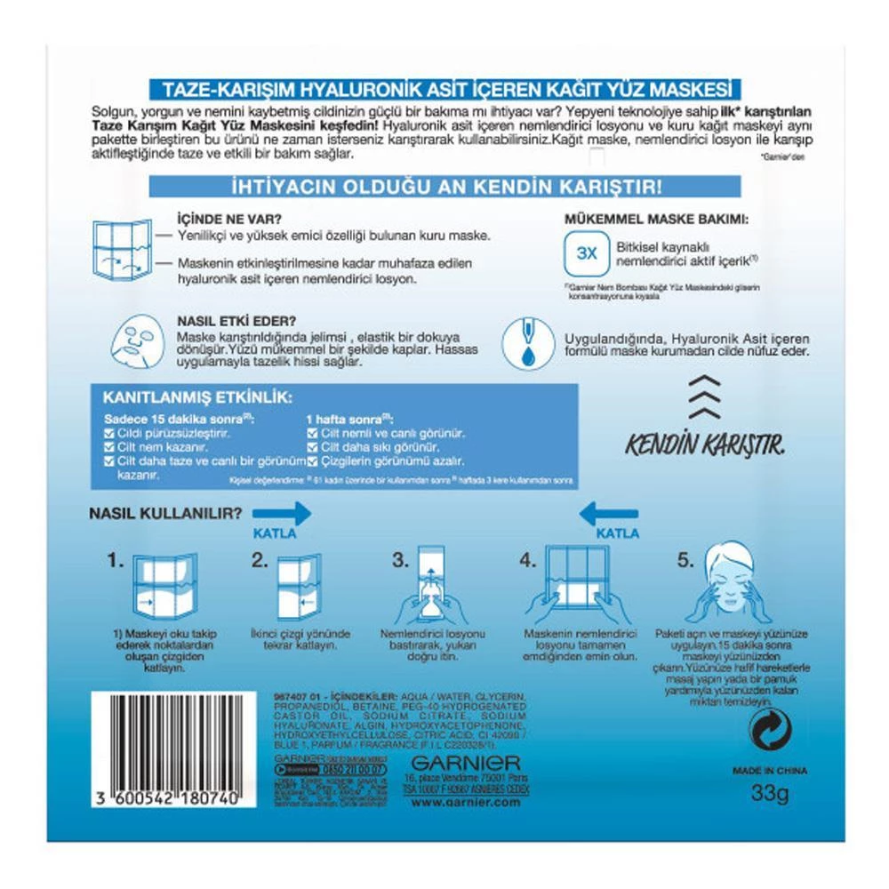 Garnier Taze Karışım Kağıt Yüz Maskesi Hyaluronik Asit 33gr Özellikleri