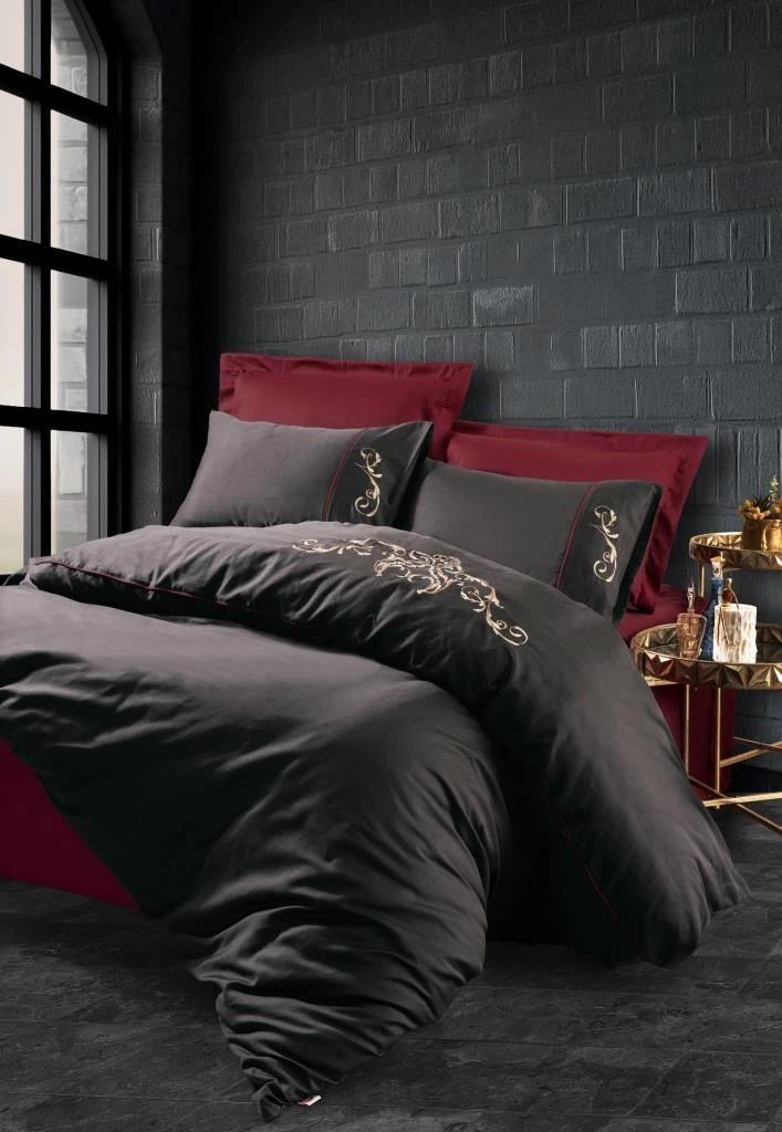 Needion - Cotton Box Brode Nakışlı Çift Kişilik Saten Nevresim Takımı Sarita Bordo