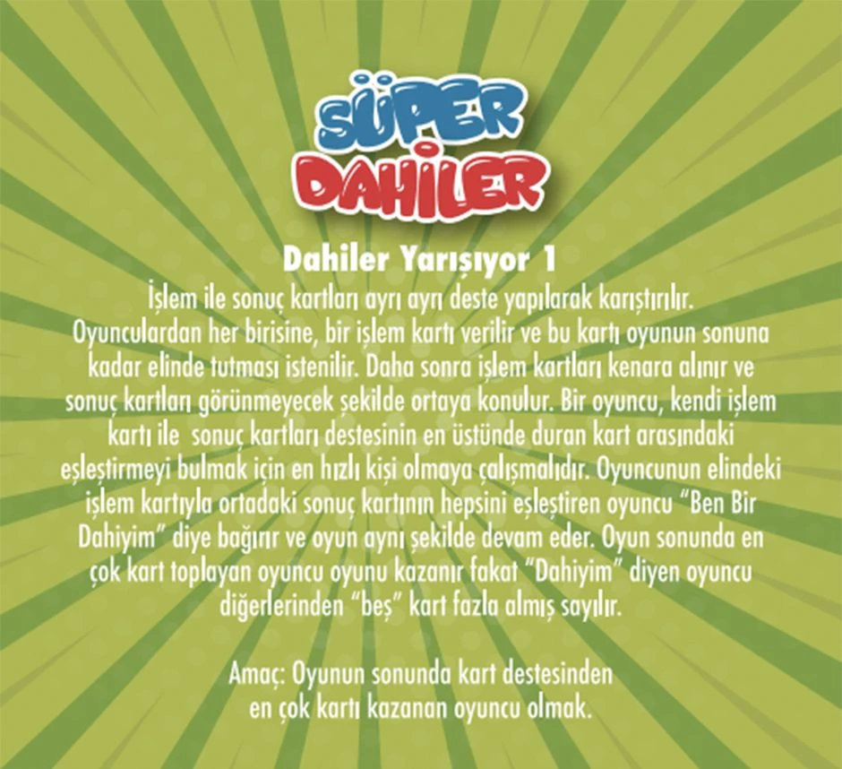 Süper Dahiler Toplama Oyunu 5 oyunu bir arada sunar. Ayrıca sınıf içi oyun modeliyle öğrencilerin eğlenerek öğrenmesine katkı sağlayacak  ve aynı zamanda sınıf içi dikkat gelişimini arttıracaktır.