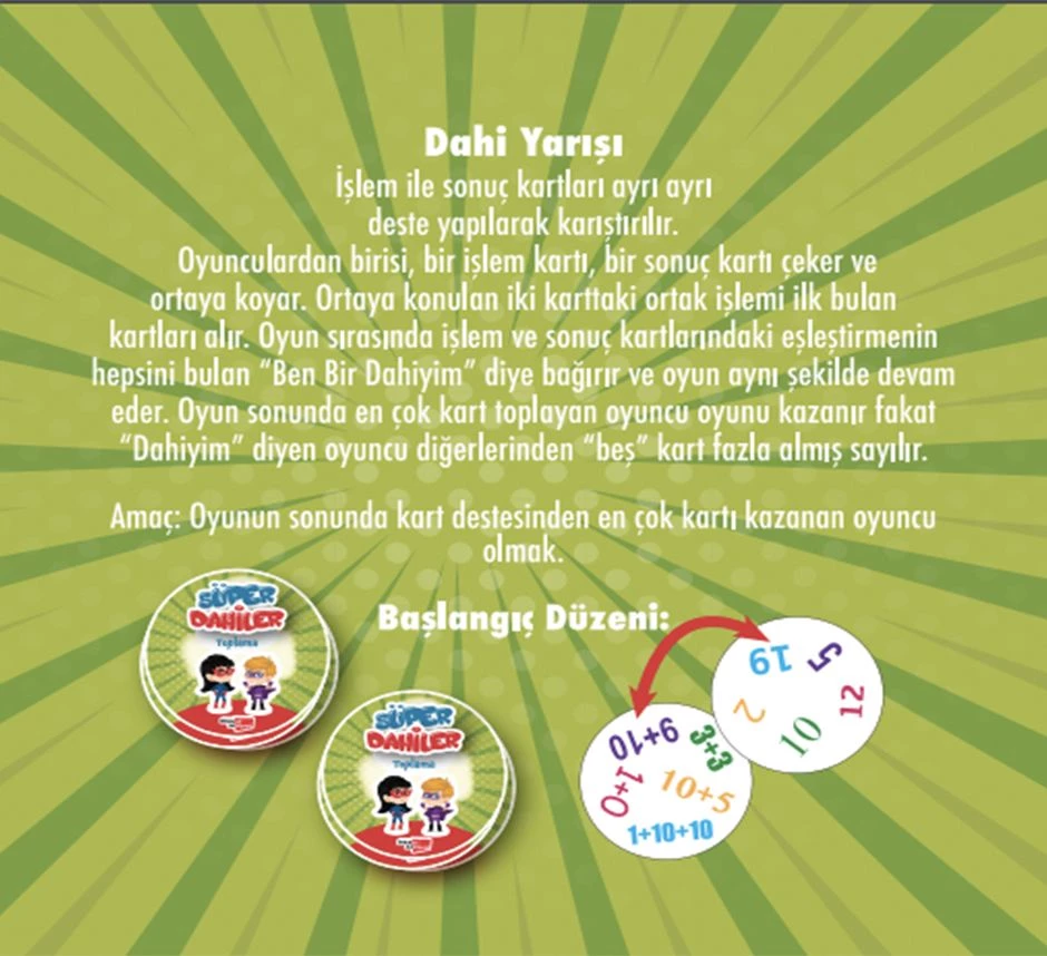 Süper dahiler toplama oyunu çocukların toplama işlemini zihinden daha hızlı yapmalarını sağlayacak ve oynarken hem dikkat geliştirecek hemde eğlenerek hızlı bir şekilde öğrenmeyi sağlayan çok özel bir oyundur.