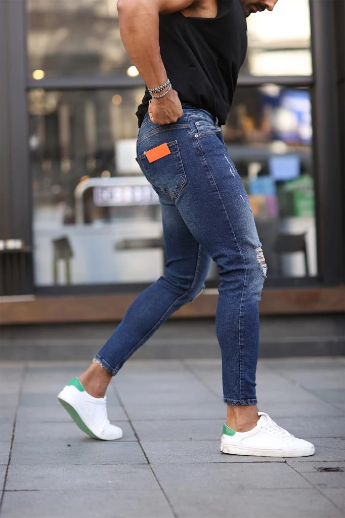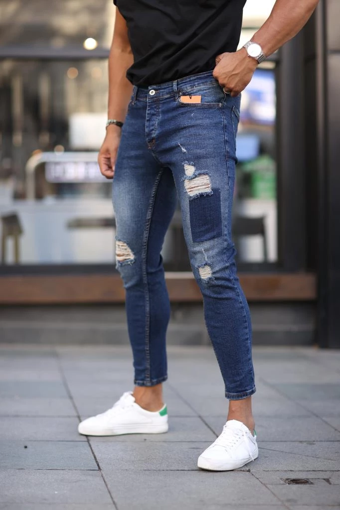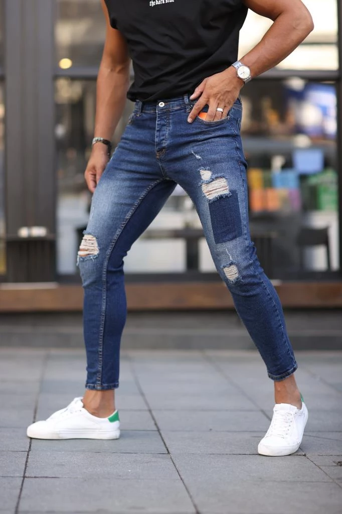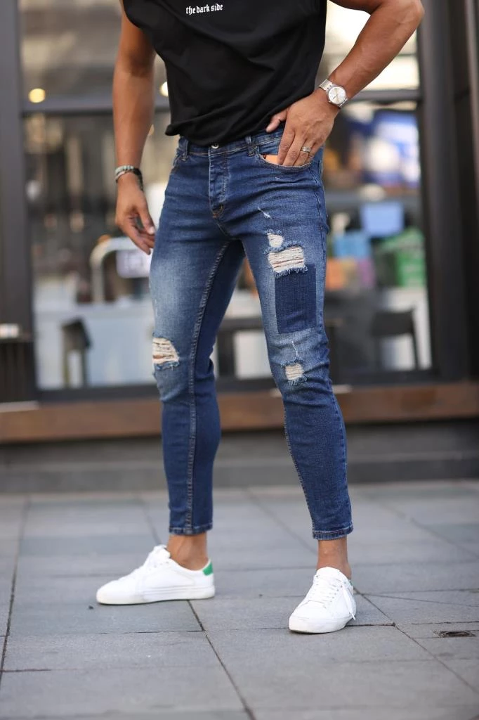 Erkek Slimfit Yırtıklı Lacivert Kot Pantolon 29