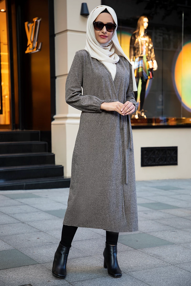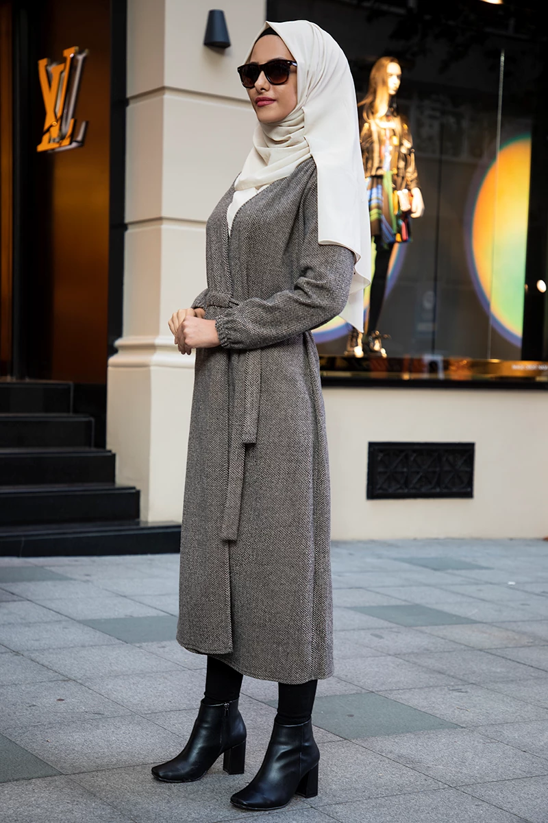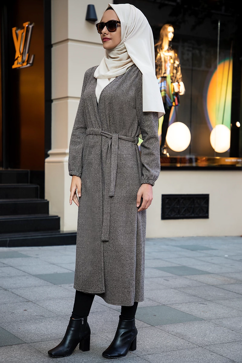 Beli Kuşaklı Kaşe Tesettür Kap MP5089 Kahve 38