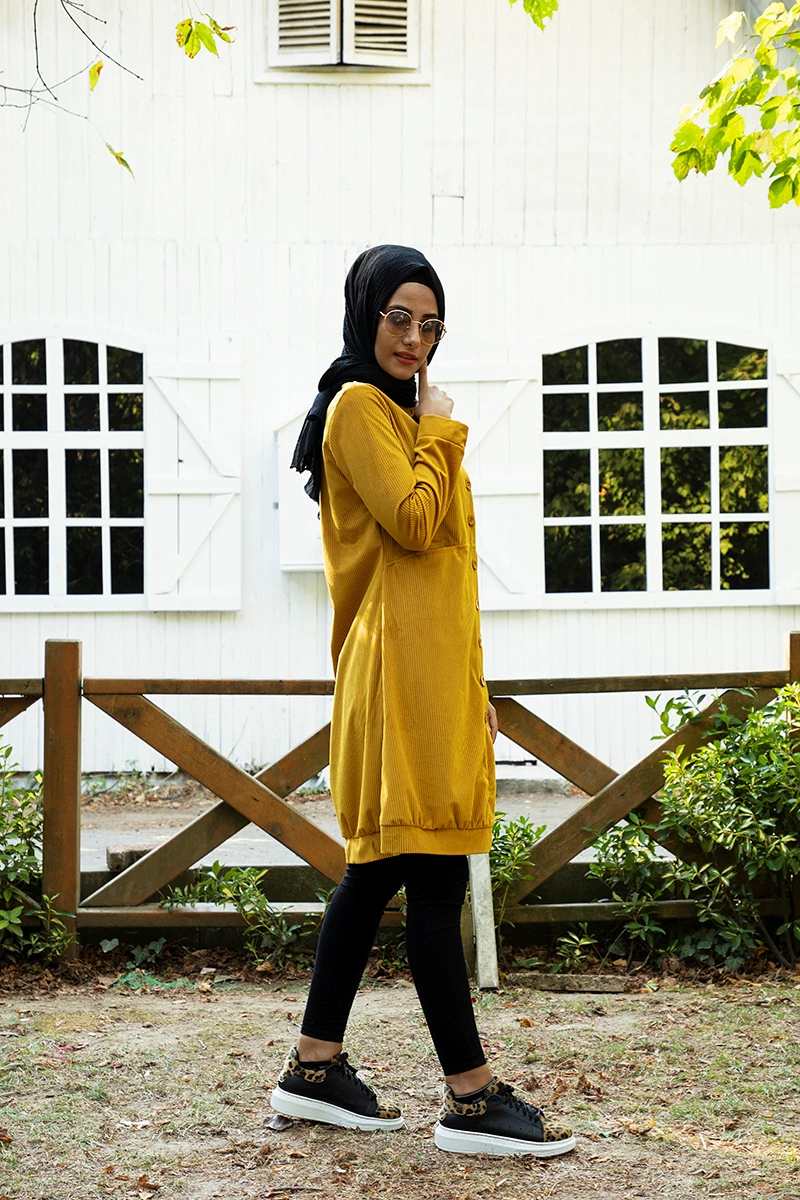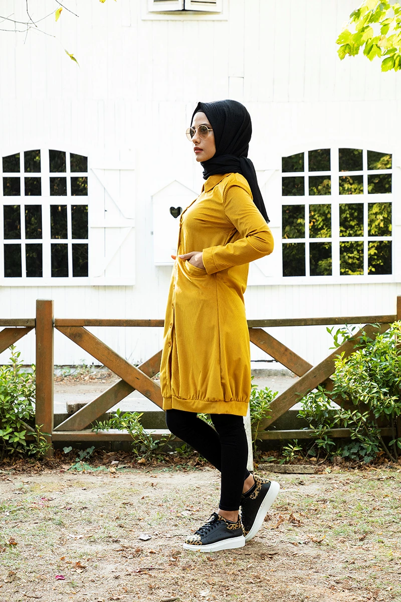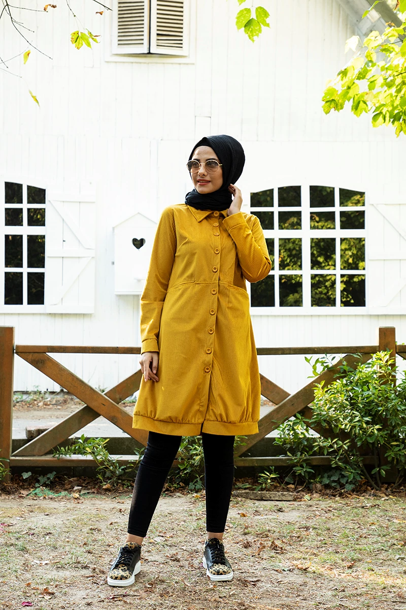 Gömlek Yaka Önden Düğmeli Gizli Cepli Tesettür Kap Hardal 46