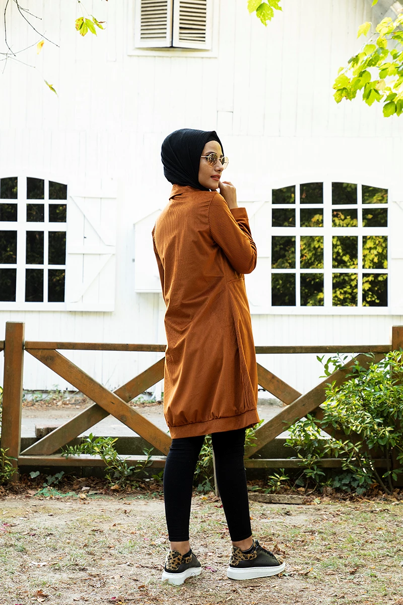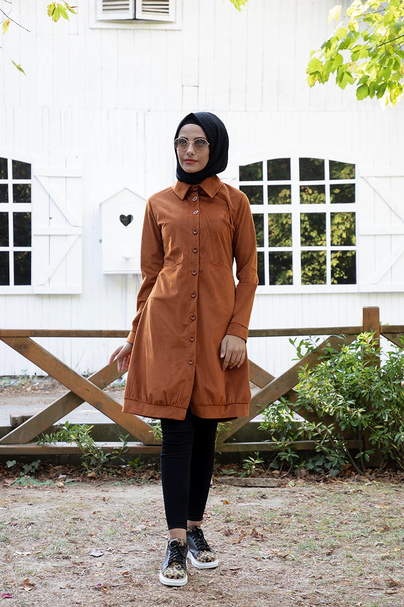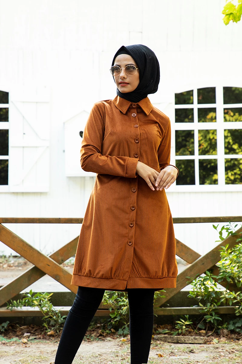 Gömlek Yaka Önden Düğmeli Gizli Cepli Tesettür Kap Kiremit 46