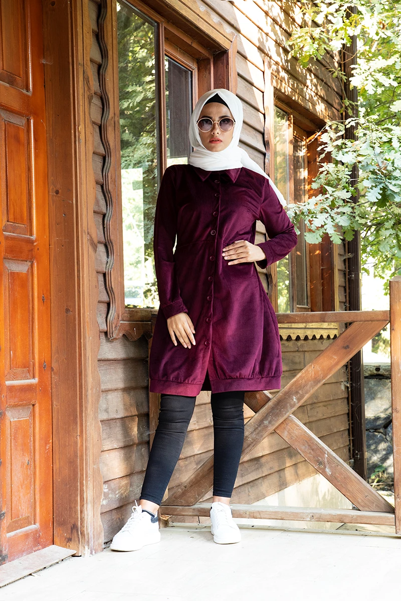 Gömlek Yaka Önden Düğmeli Gizli Cepli Tesettür Kap Mürdüm 46