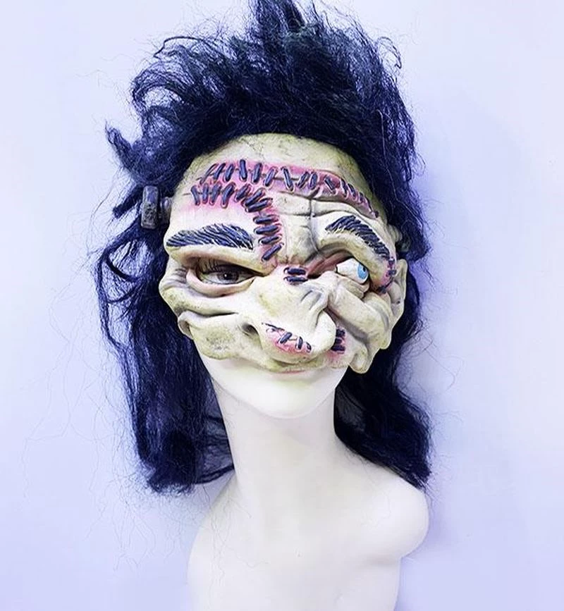 Siyah Uzun Saçlı Yarım Surat Vidalı Dikiş İzli Lateks Korku Maskesi