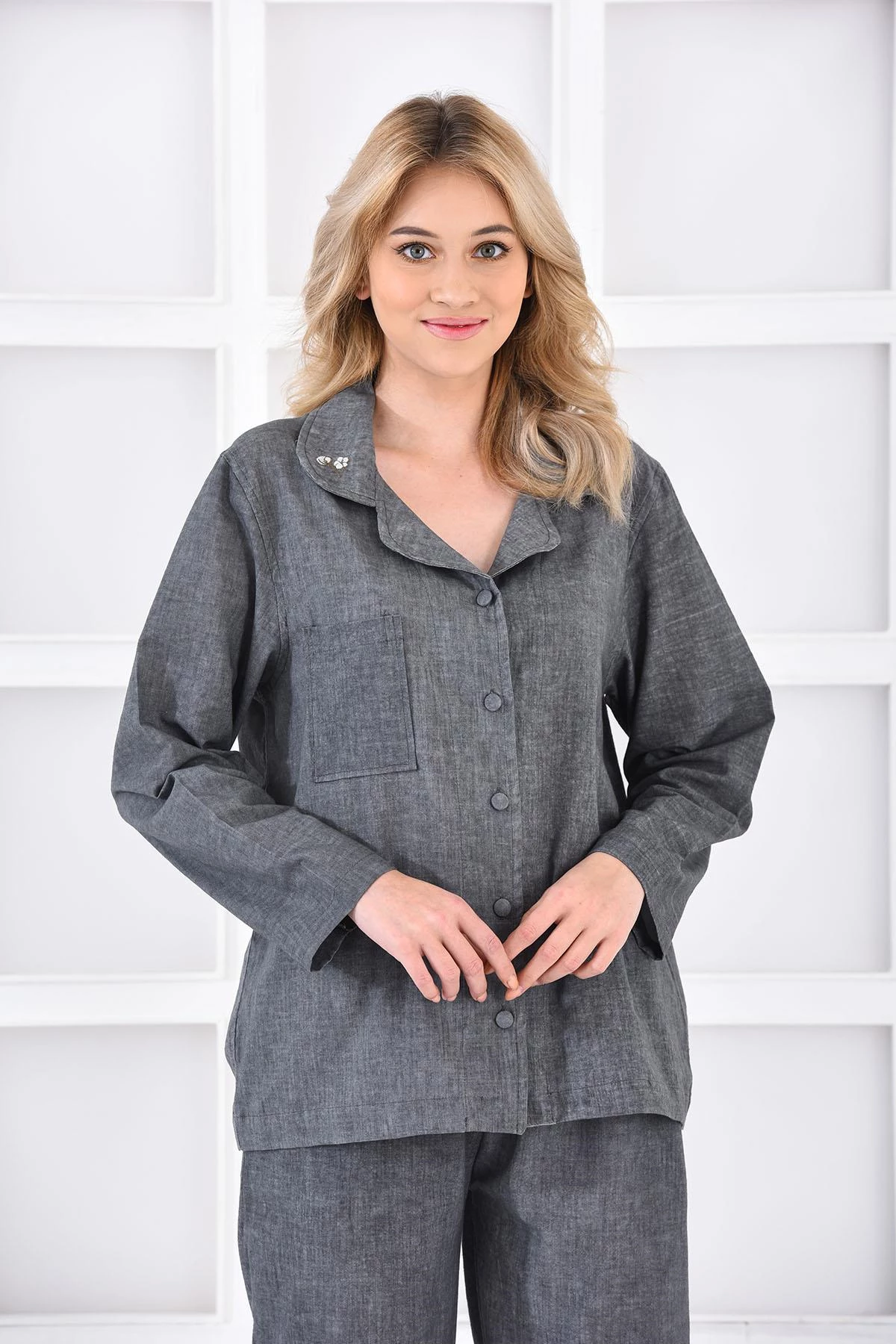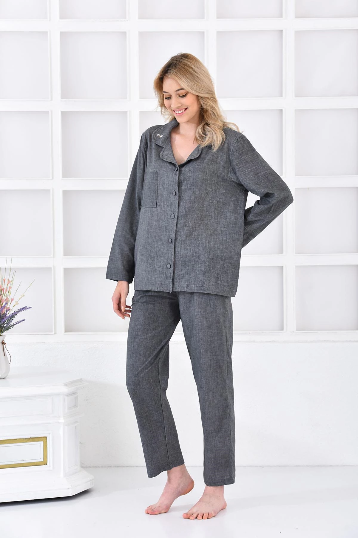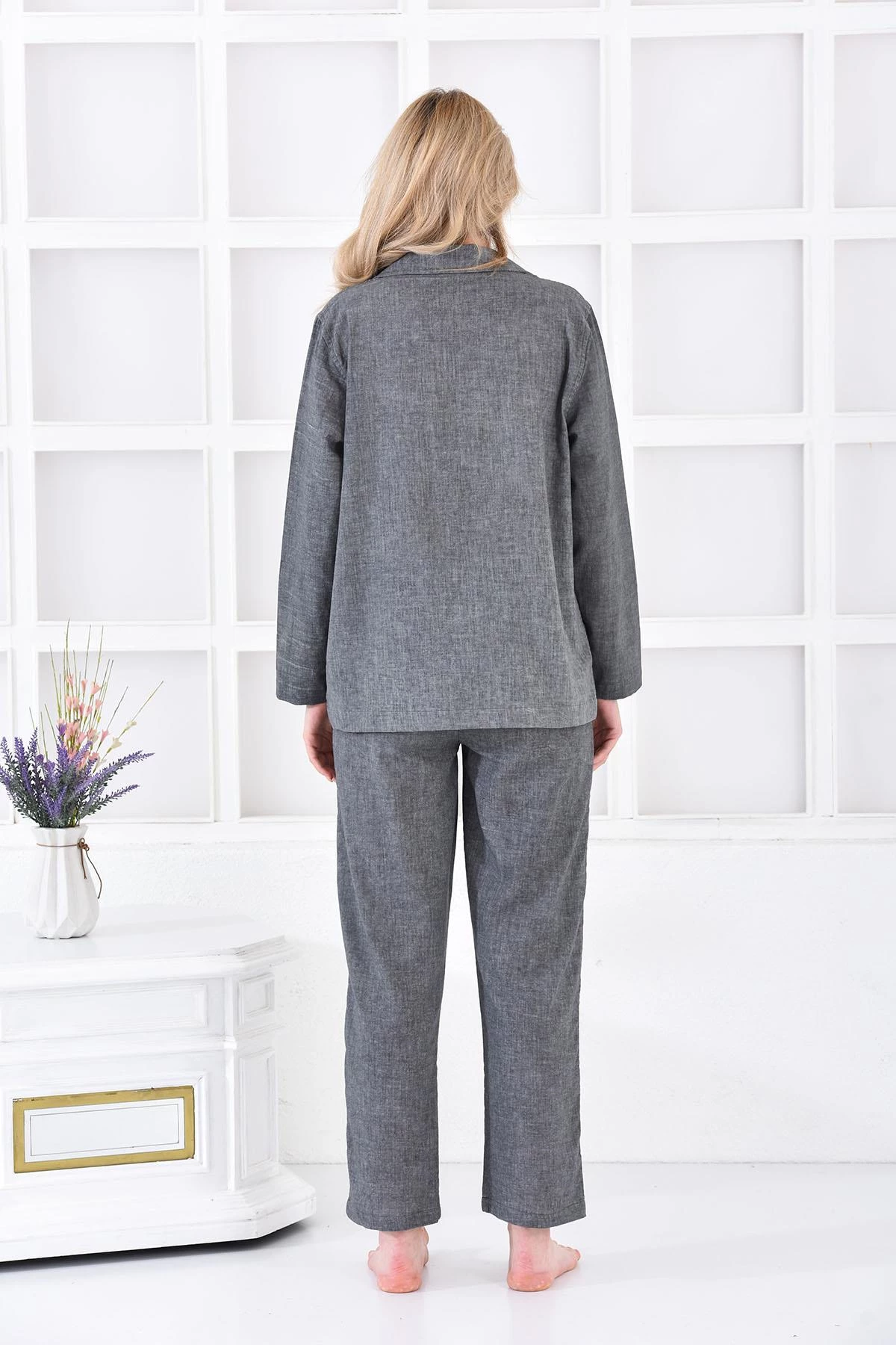 Ecocotton Helen Kadın Pijama Takımı %100 Organik Pamuk Keten Karışımlı Antrasit Antrasit S