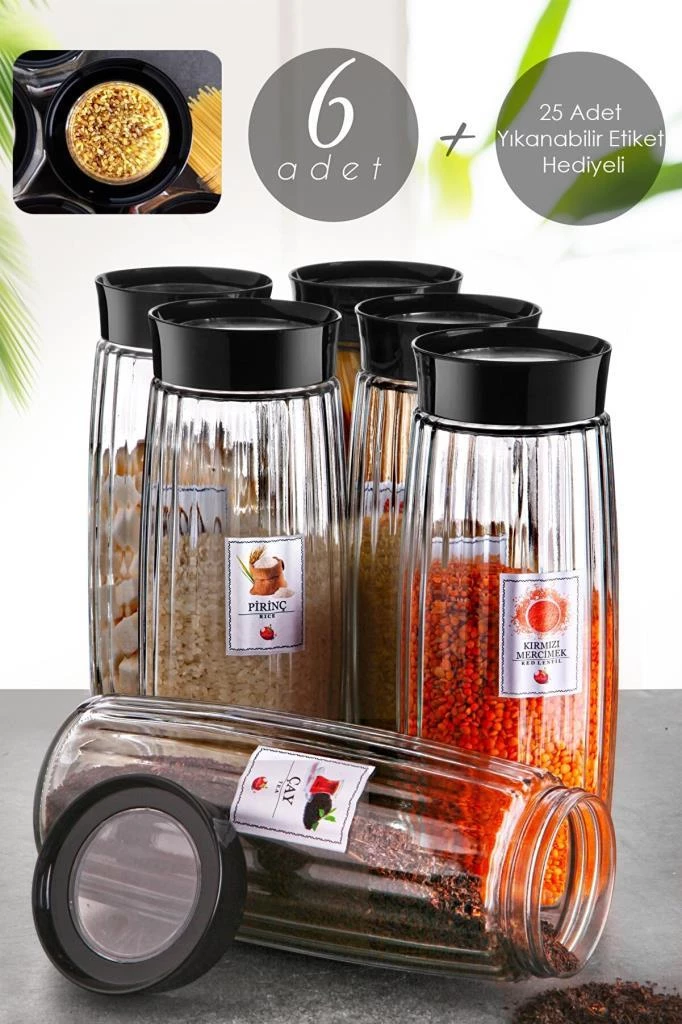 Cam Kavanoz Seti 6Lı Mega Boy 1600 mL Saklama Kabı Etiketli Bakliyat Erzak Saklama Kabı Seti